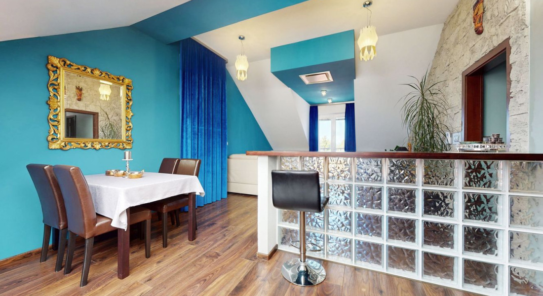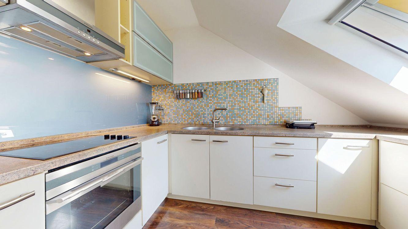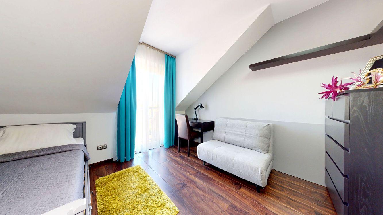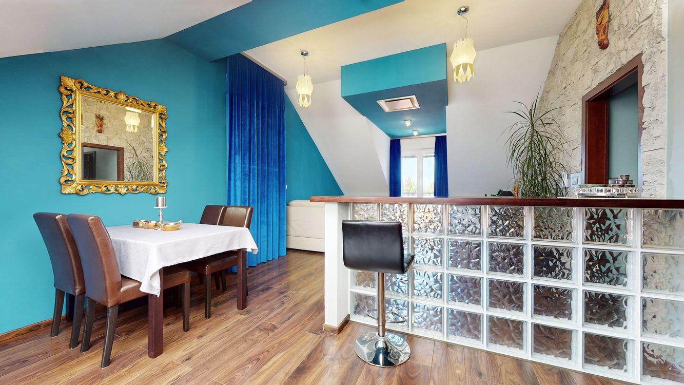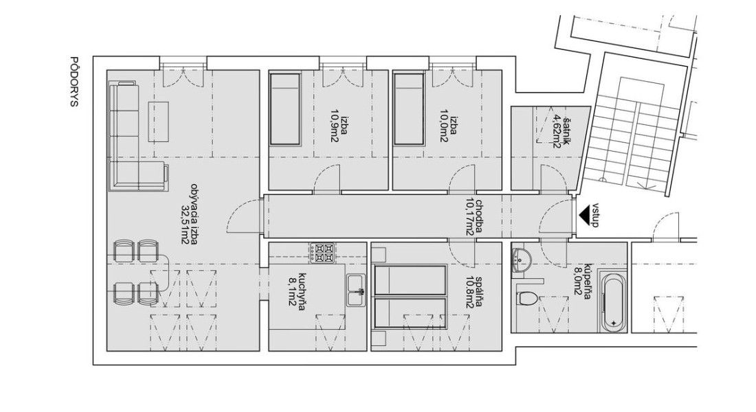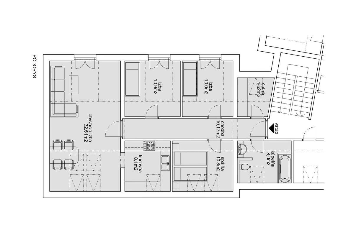 Rozumne riešenú nehnuteľnosť (viď. pôdorys posledné foto) tvorí priestranná obývačka s jedálňou, sam. kuchyňa, ďalšie tri izby (v súčasnosti využívané ako spálňa, detská izba a pracovňa), veľkorysá kúpeľňa s WC a vaňou z nadštandardných materiálov, sam. šatník pri vstupe a chodba.