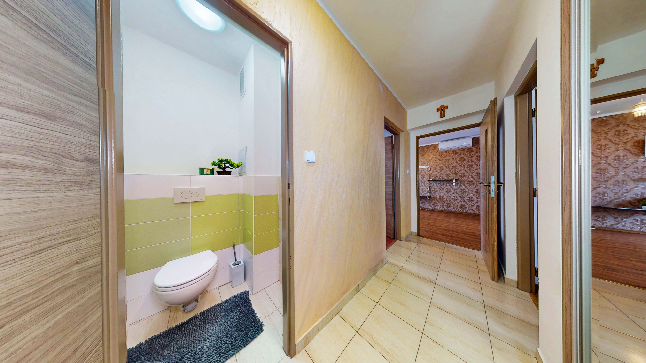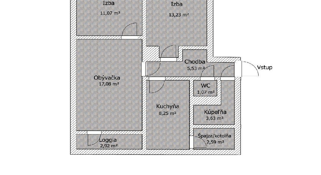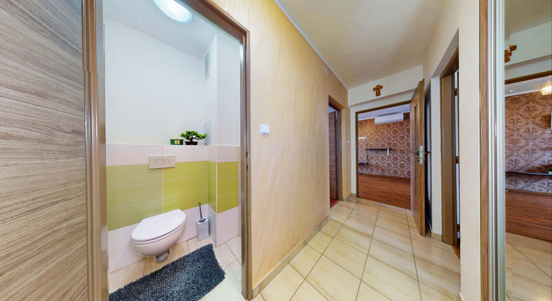 Byt o výmere 63m2, nachádzajúci sa na 2/3 poschodí, pozostáva zo spálne s veľkým rolldorom, izby, priestrannej obývačky s východom na loggiu a s klimatizáciou, sam. kuchyne, cez ktorú sa vchádza do špajze/kotolne, chodby s rolldorom, kúpeľne s veľkým sprchovým kútom a sam. WC (viď. pôdorys posledná foto). K bytu podľa listu vlastníctva prislúcha priestranná pivnica o rozmere 14m2 a loggia, teda spolu výborných 79,94m2. Pozemok pod bytovým domom je odkúpený.