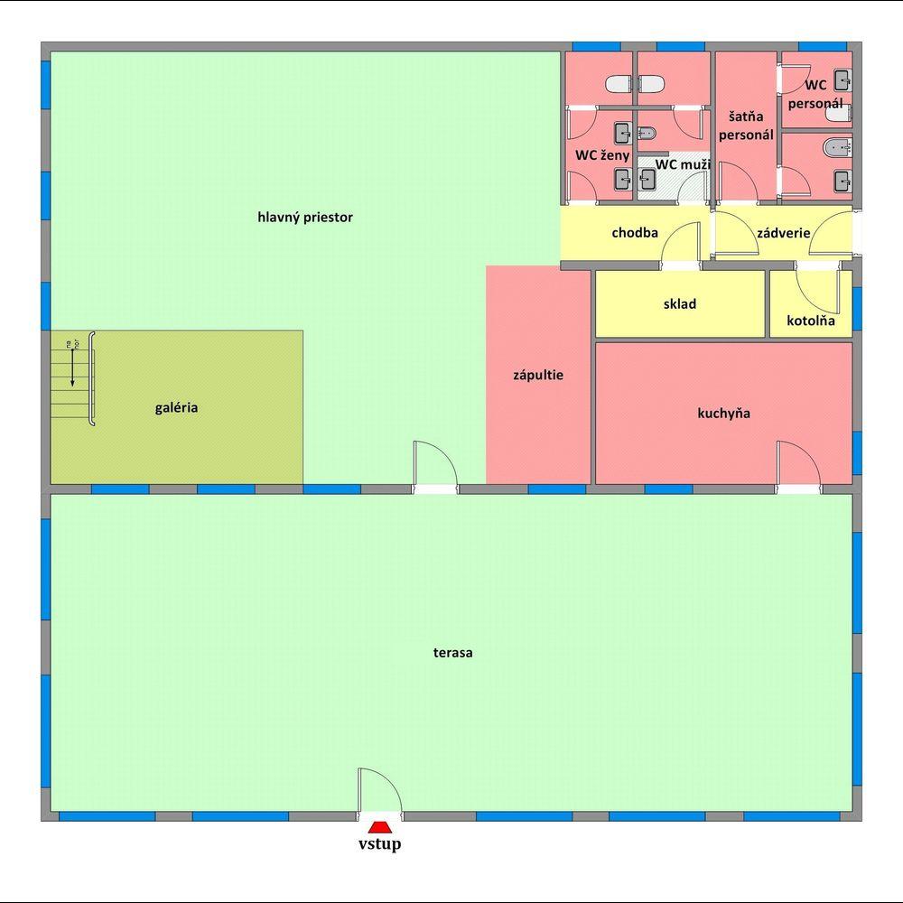 - Technické miestnosti: toalety (pre zákazníkov aj personál), sklady, šatne, kotolňa