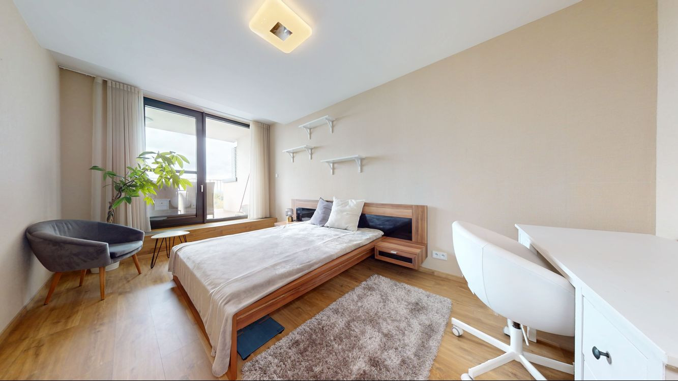 Byt je priestranný, svetlý, zariadený moderným nábytkom, použité sú kvalitné materiály, hliníkové okná s elektrickými vonkajšími žalúziami. Byt je klimatizovaný.