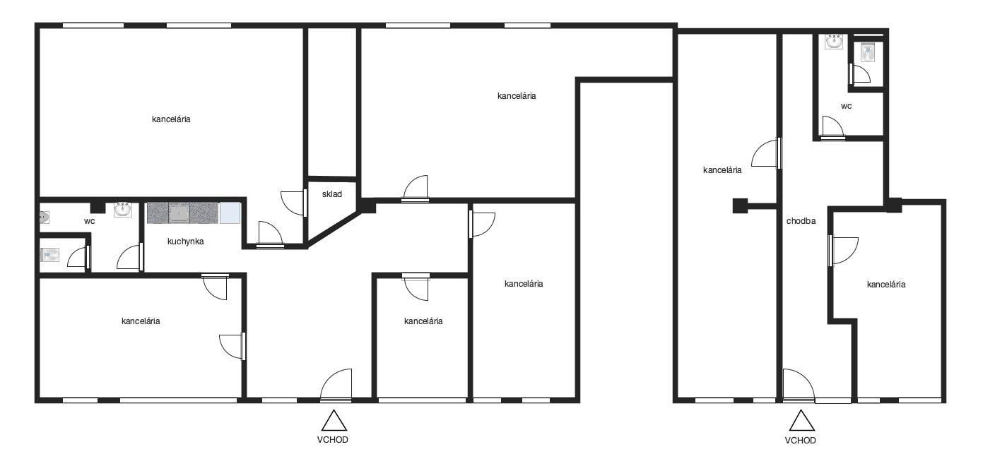Priestor je v súčasnosti rozdelený na dva samostatné celky (146 m² a 64 m²), každý so samostatným vstupom. Dispozične pozostáva z viacerých miestností oddelených sadrokartónovými priečkami – kancelárií, sociálneho zázemia a toaliet. V prípade potreby je možné priestor upraviť na veľký otvorený showroom alebo ho variabilne prispôsobiť podľa vlastných požiadaviek.