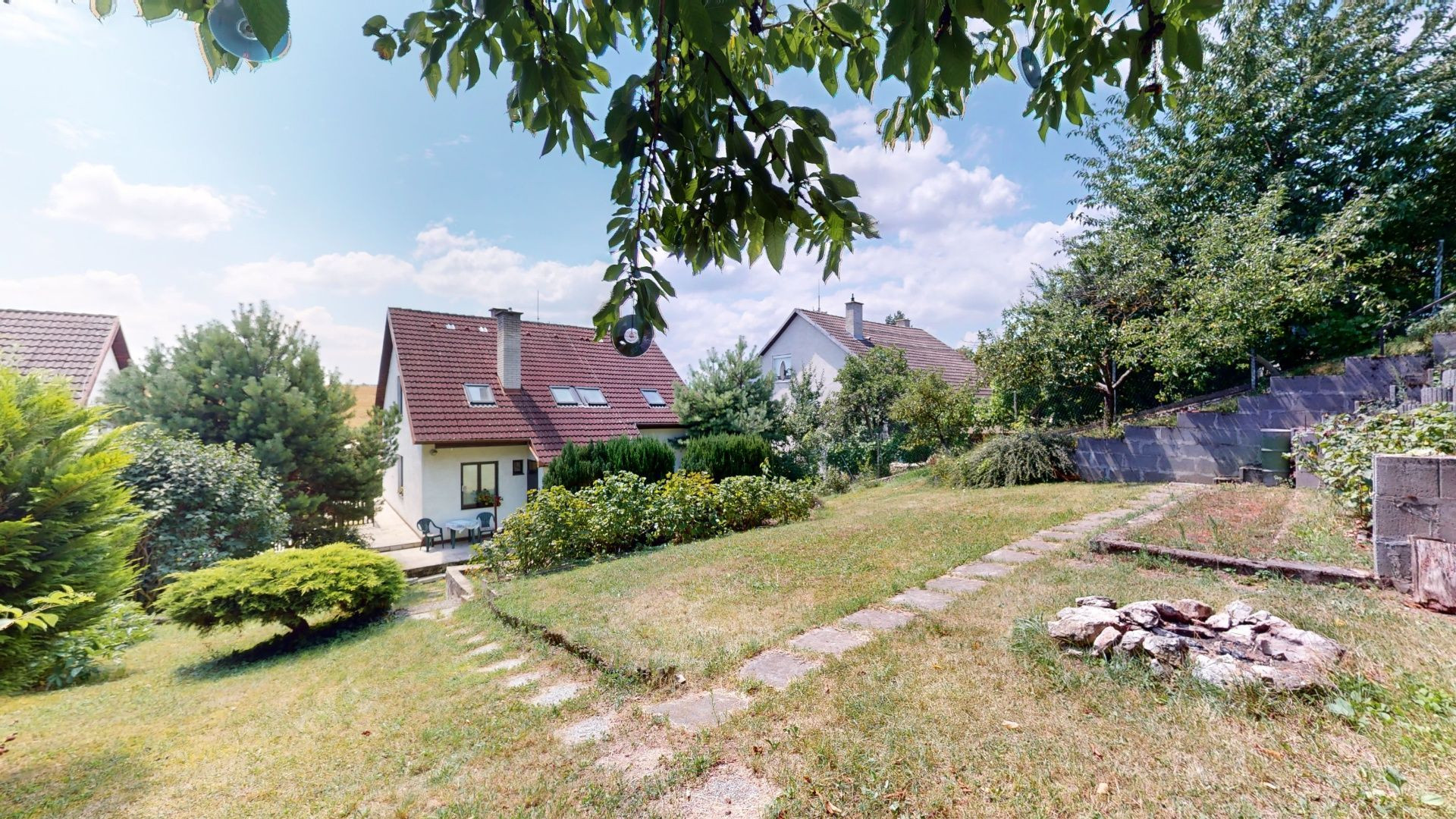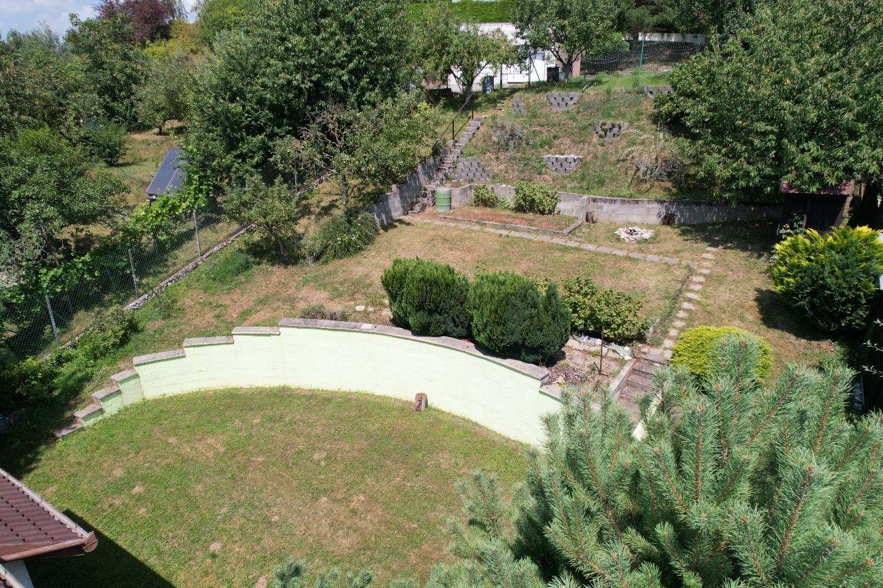 Terasovitý pozemok s výmerou 800 m2 je upravený, celý oplotený, udržiavaný, vysadený ovocnými stromami a kríkmi.