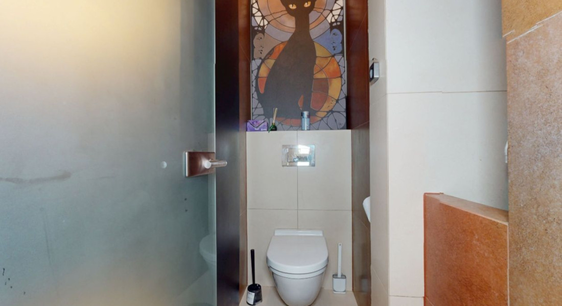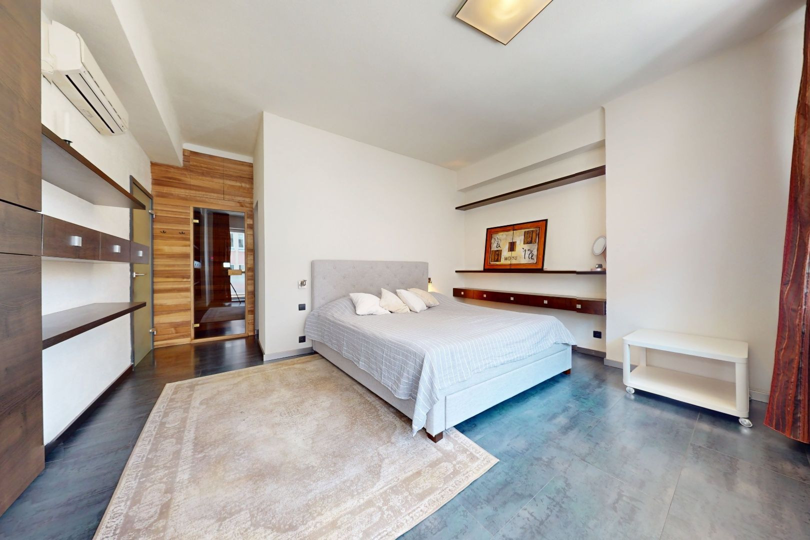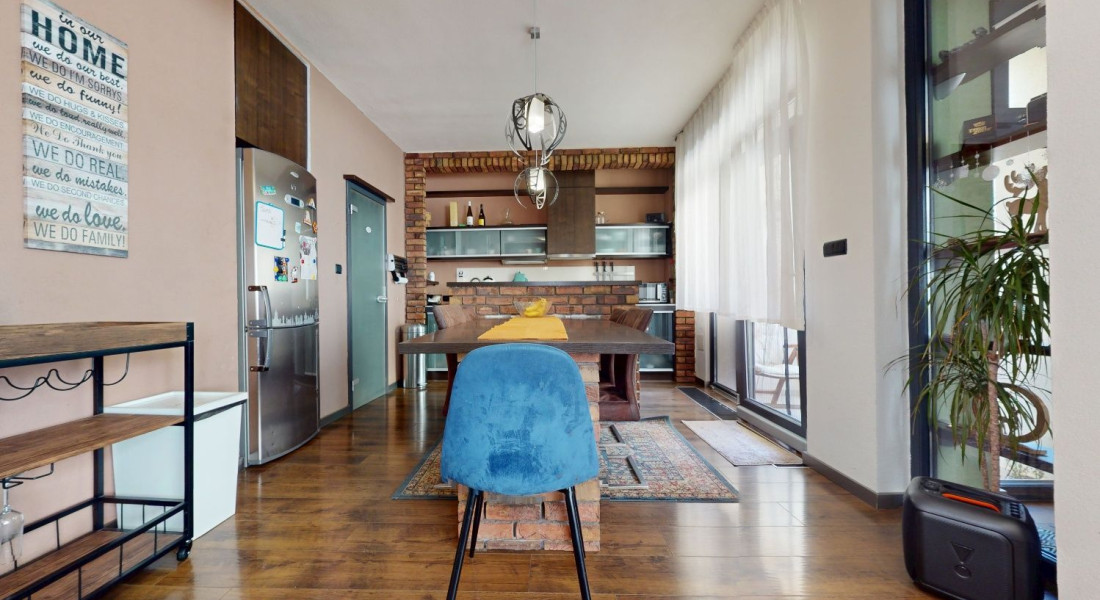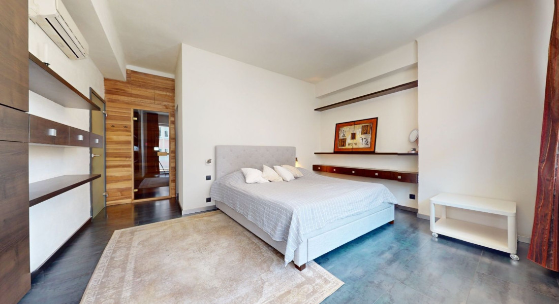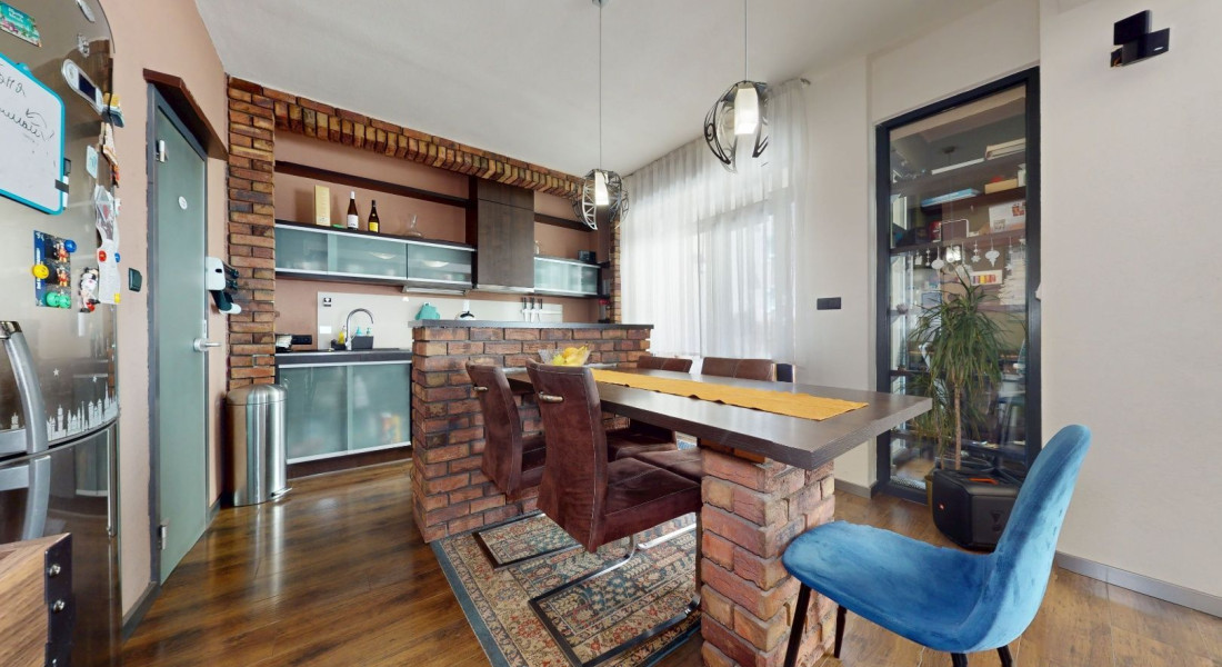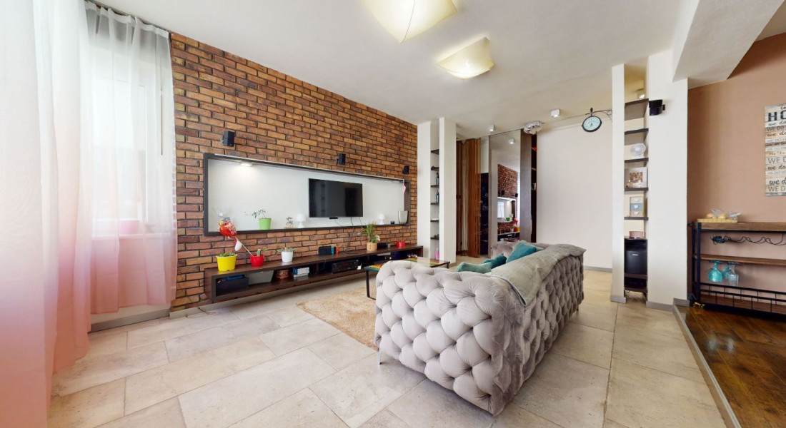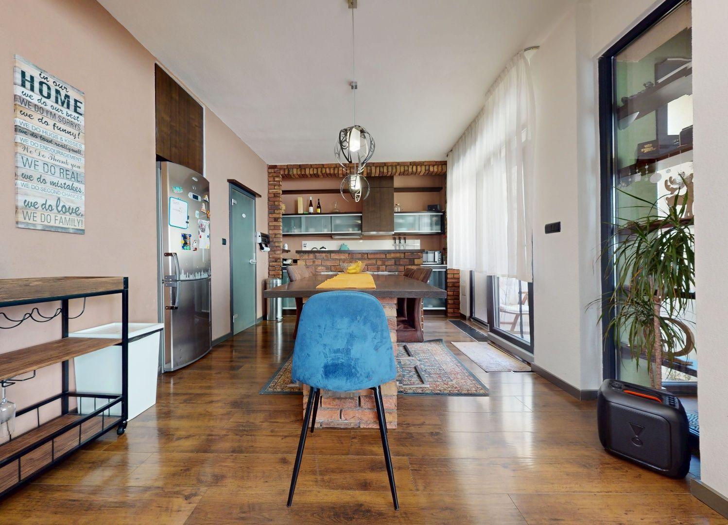 Vstupom do bytu prechádzame do dennej zóny, kde sa nachádza obývacia časť, šatník, jedálenská časť a kuchynská časť. Z kuchynskej časti je vstup na loggiu a malú študovňu. Z tohto priestoru prechádzame chodbou do zadnej časti bytu, kde sa nachádza toaleta, kúpeľňa, detská izba, spálňa so šatníkom, malá sauna a vstup na balkón.