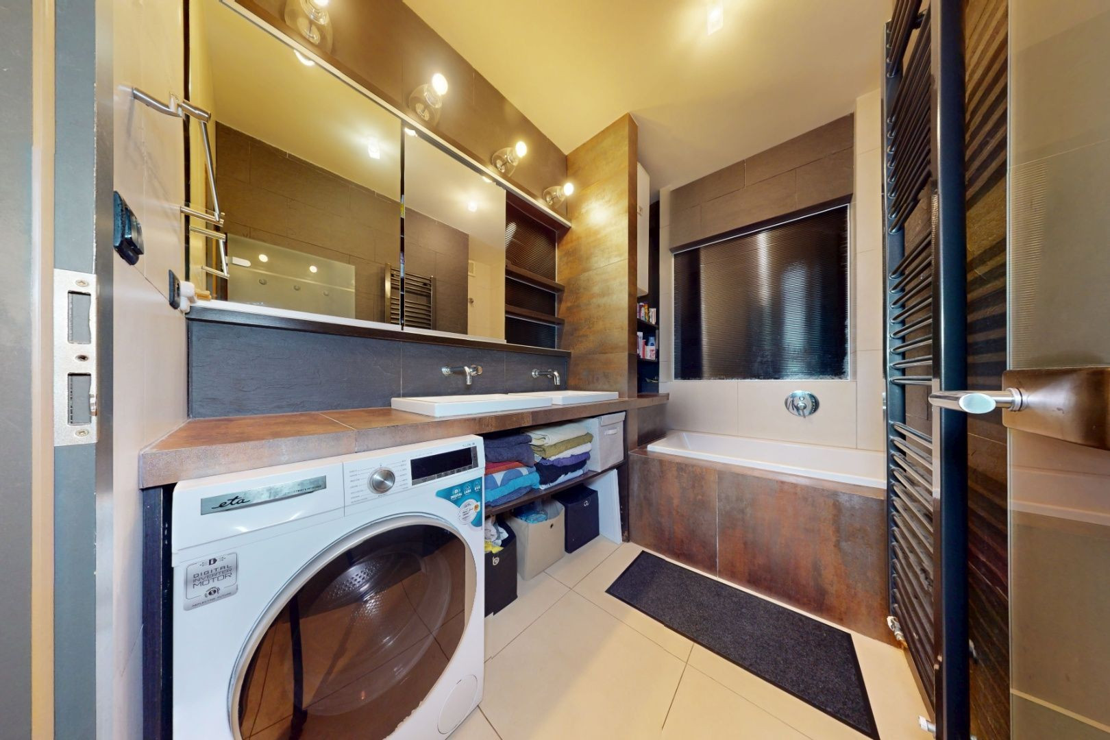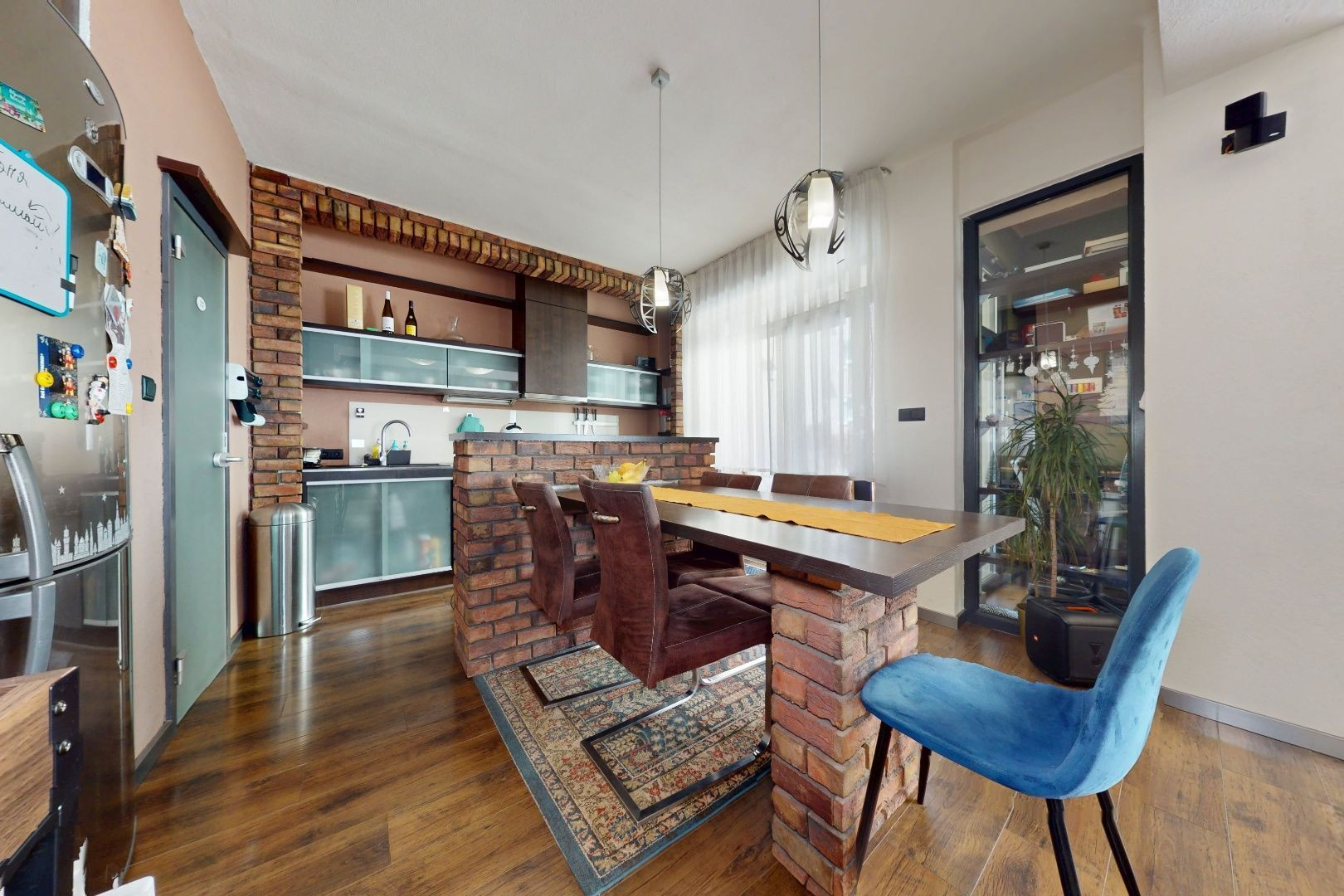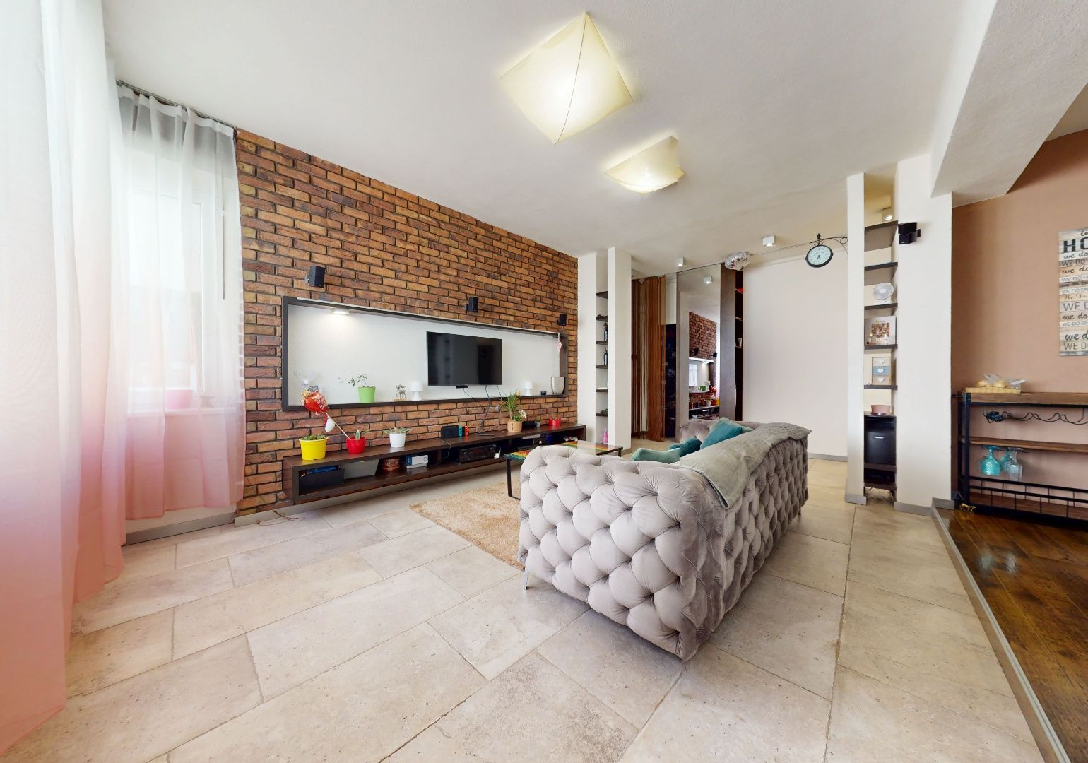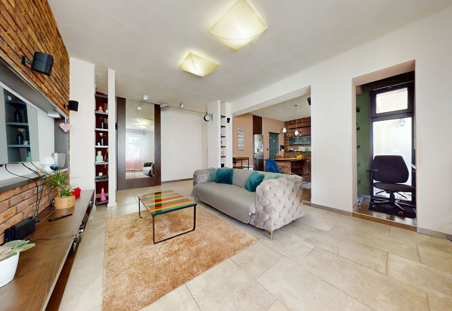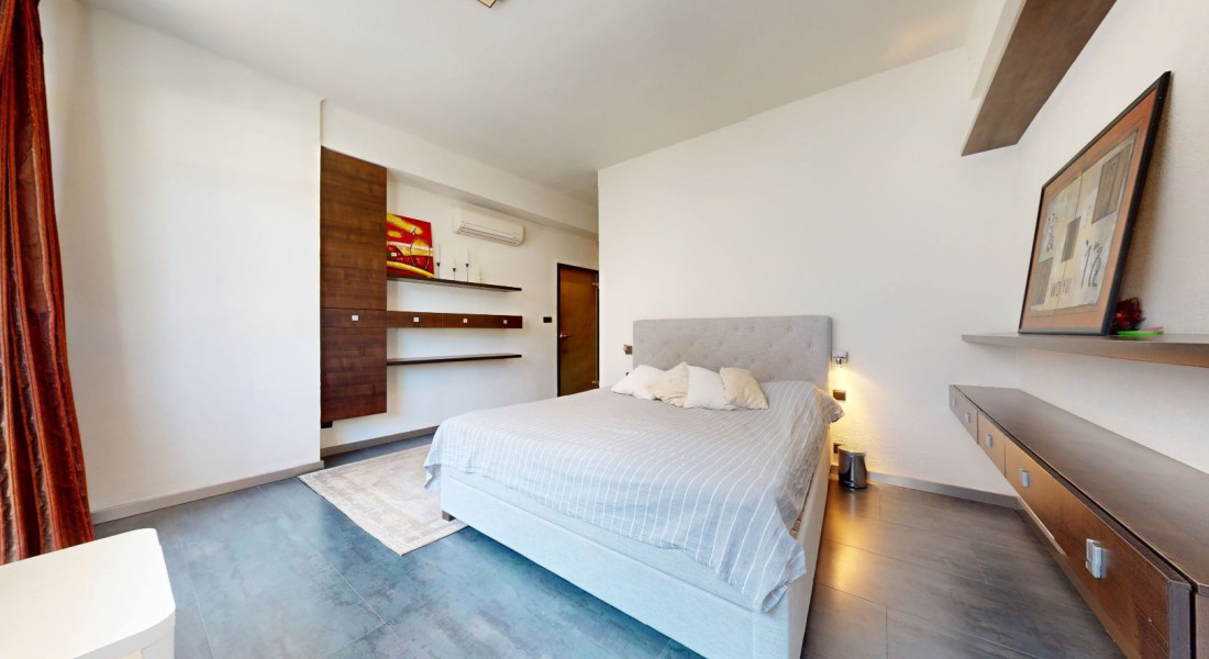 Vstupom do bytu prechádzame do dennej zóny, kde sa nachádza obývacia časť, šatník, jedálenská časť a kuchynská časť. Z kuchynskej časti je vstup na loggiu a malú študovňu. Z tohto priestoru prechádzame chodbou do zadnej časti bytu, kde sa nachádza toaleta, kúpeľňa, detská izba, spálňa so šatníkom, malá sauna a vstup na balkón.