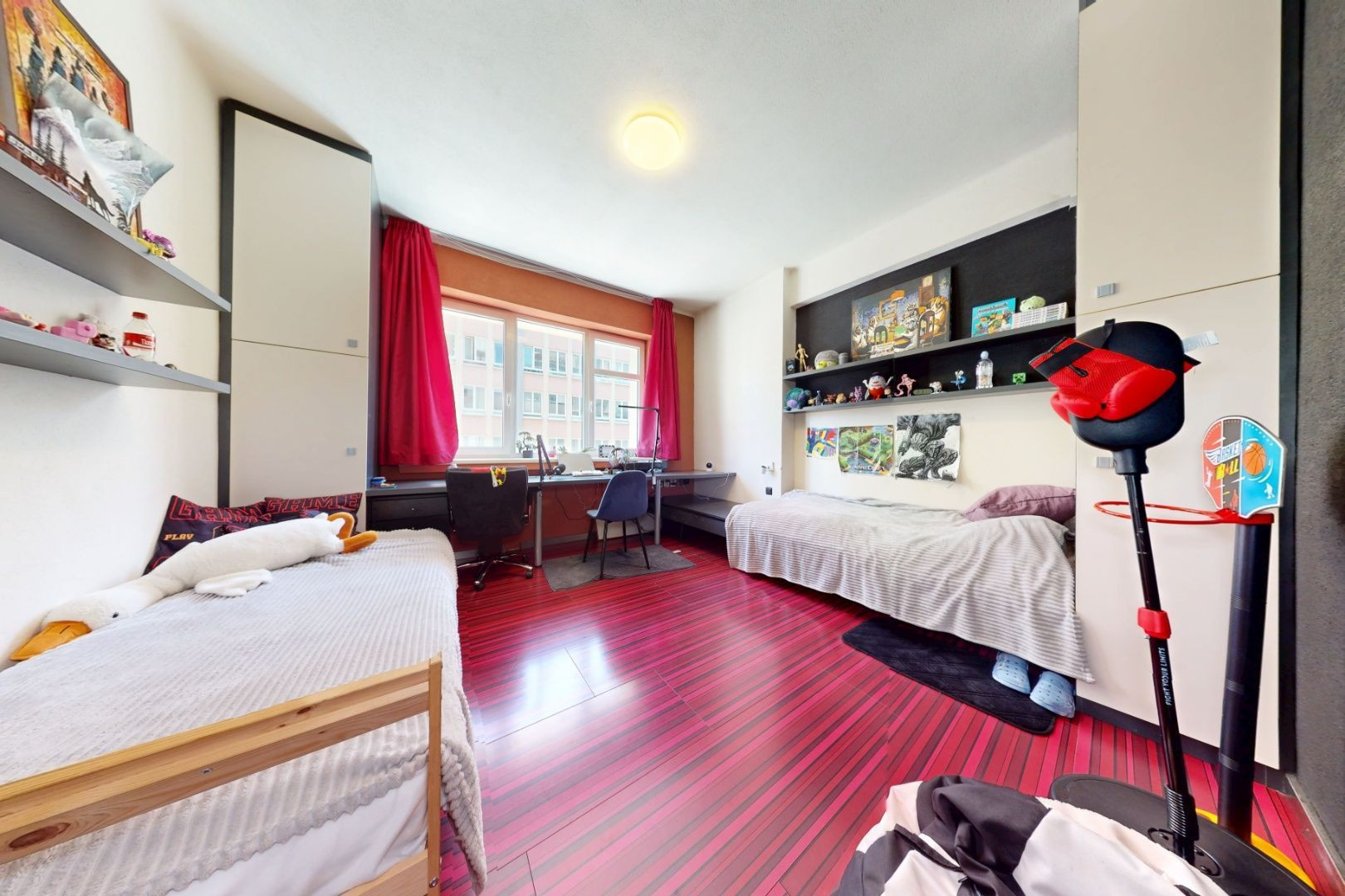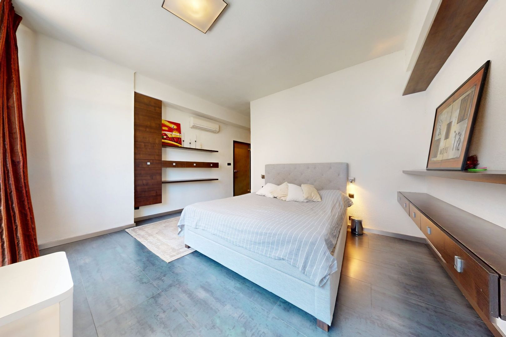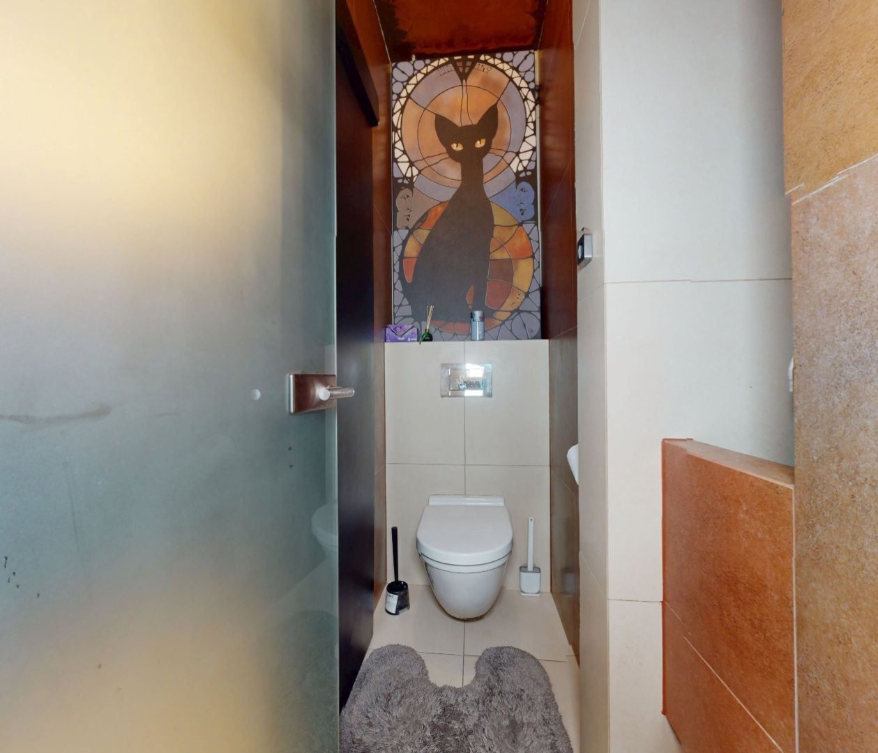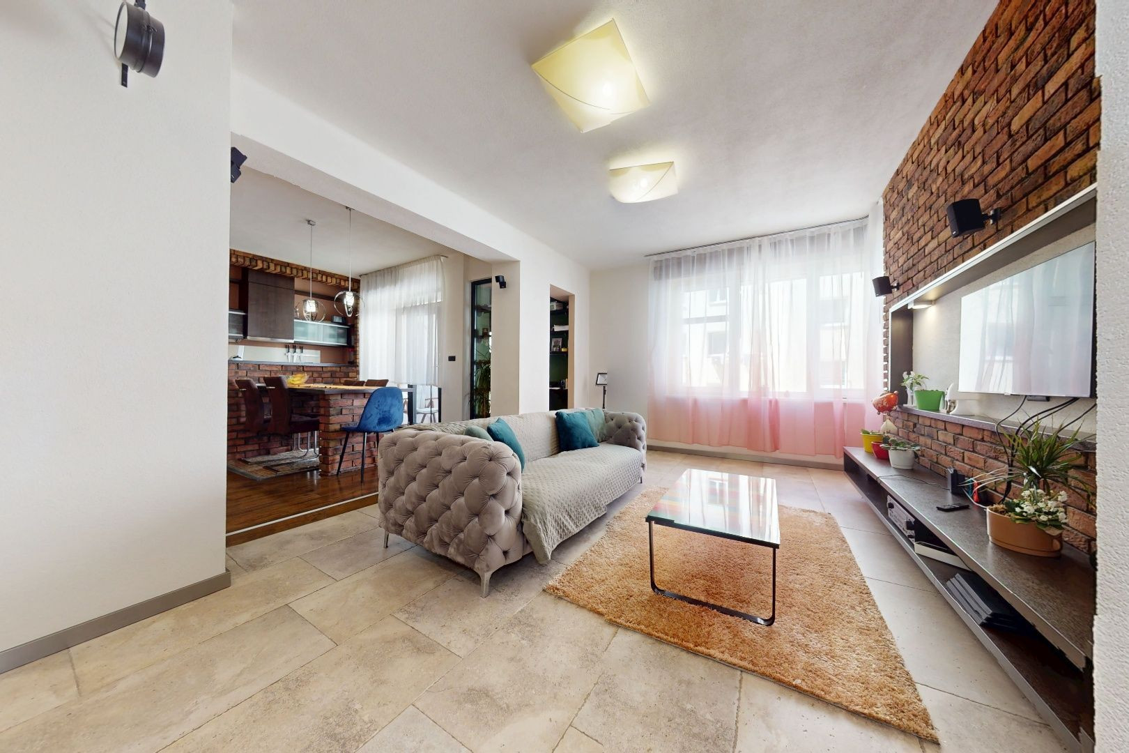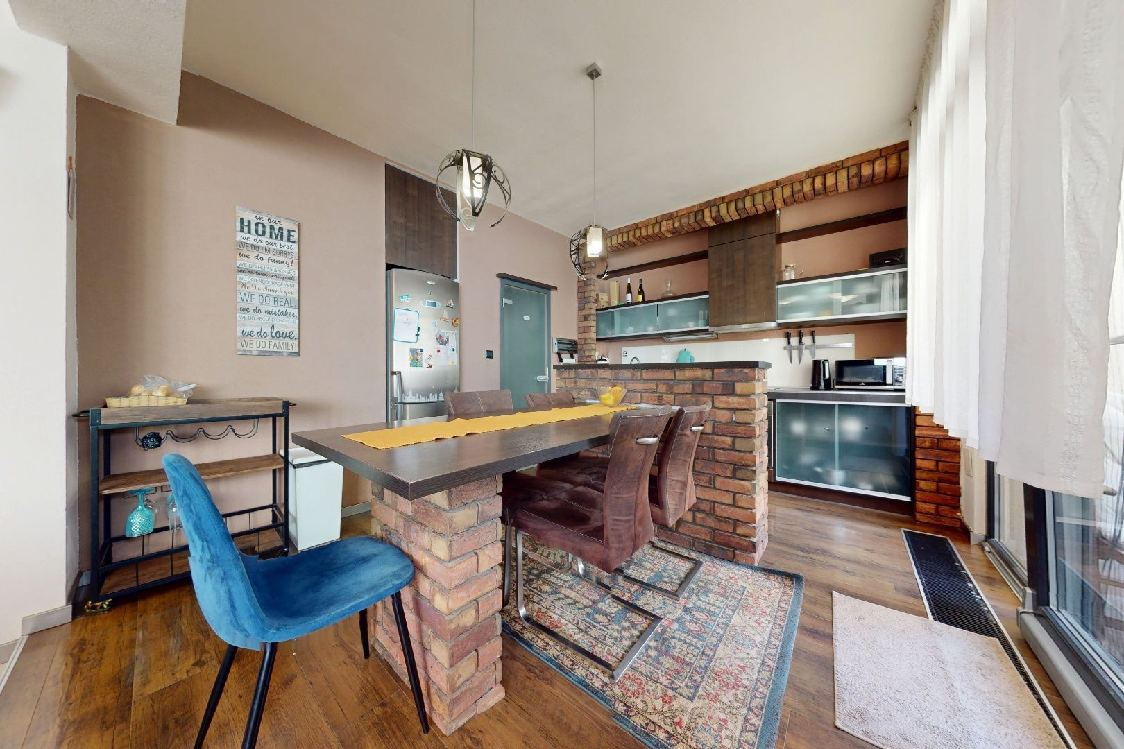 Vstupom do bytu prechádzame do dennej zóny, kde sa nachádza obývacia časť, šatník, jedálenská časť a kuchynská časť. Z kuchynskej časti je vstup na loggiu a malú študovňu. Z tohto priestoru prechádzame chodbou do zadnej časti bytu, kde sa nachádza toaleta, kúpeľňa, detská izba, spálňa so šatníkom, malá sauna a vstup na balkón.
