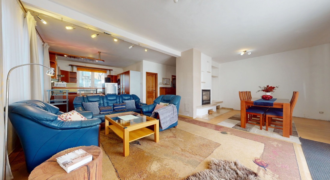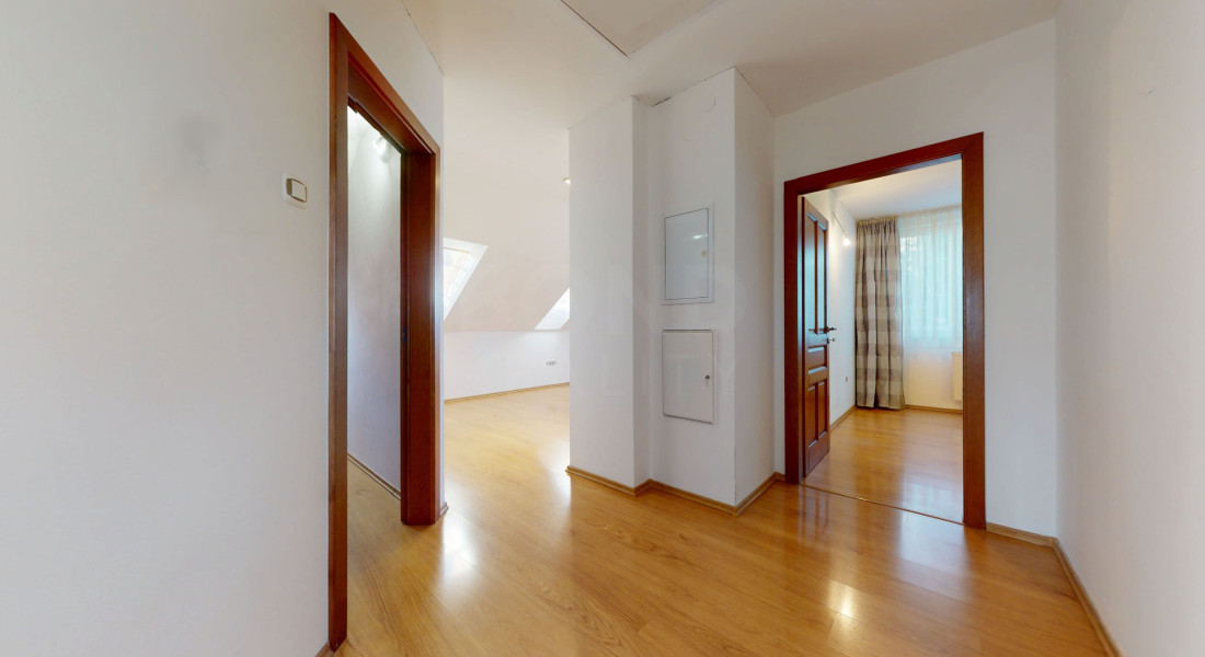 - obývaciu izbu, 2 samostatné izby (spálňa, pracovňa), kuchynský kút vrátane vstavaných spotrebičov (umývačka riadu, mikrovlnná rúra, elektrická rúra, plynový sporák, vstavaná chladnička s mrazničkou),kúpeľňu so sprchovým kútom a WC, predsieň, schodisko, technickú miestnosť s plynovým kondenzačným kotlom Viessmann VITODENS 100.