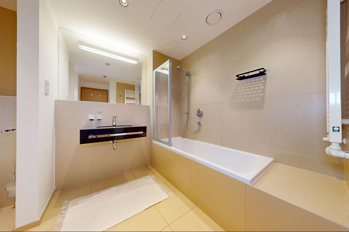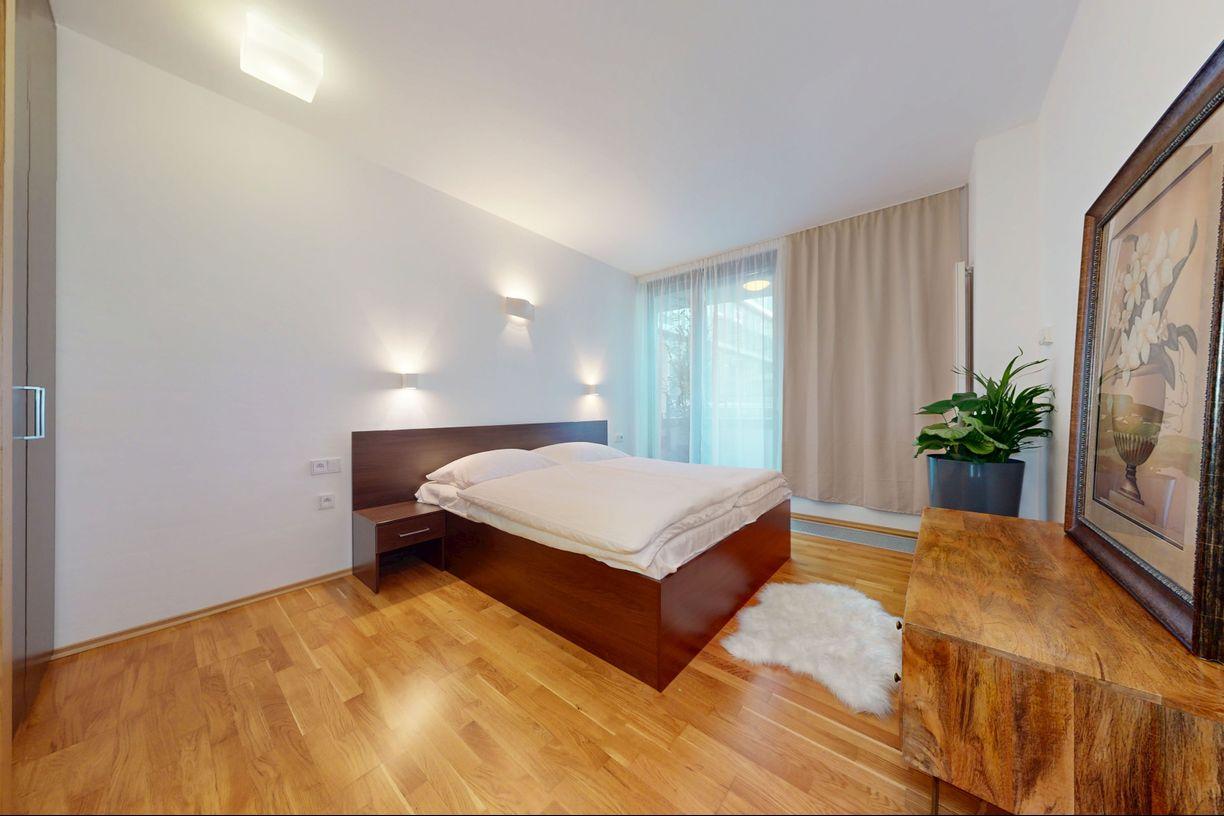 Byt pozostáva zo vstupnej chodby, obývačky s jedálenskou časťou a polootvorenou vybavenou kuchyňou. Z obývacej časti je prechod do spálne, z ktorej je vstup do priestrannej kúpeľne a toalety, ktorá má samostatný vstup. Celý priestor pôsobí ucele a farebne je s citom doladený.