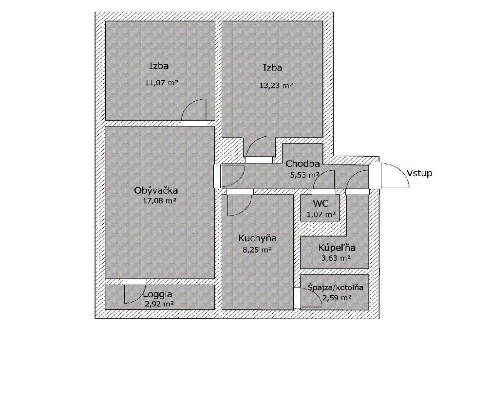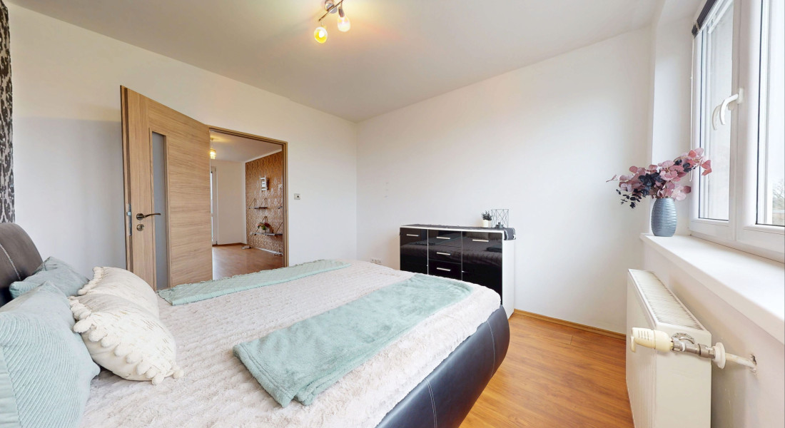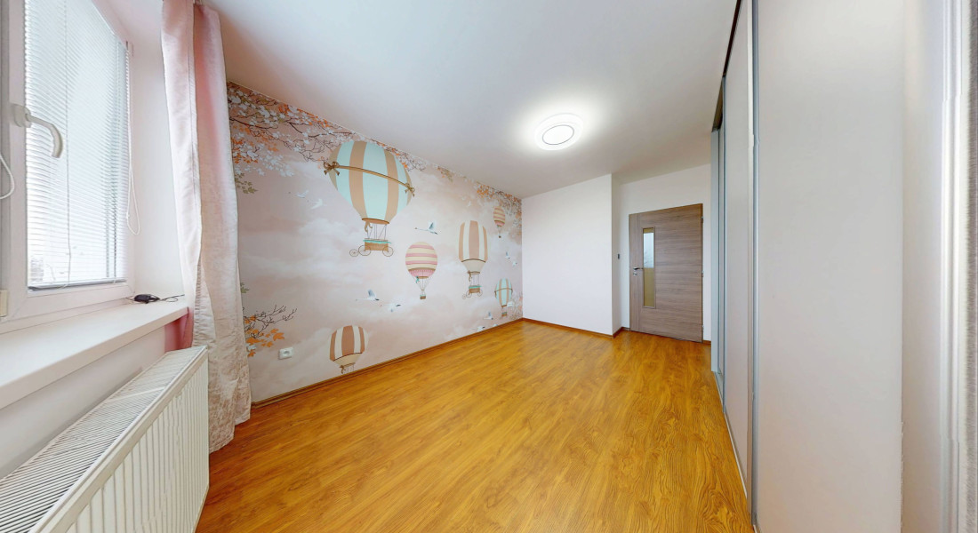 Byt o výmere 63m2, nachádzajúci sa na 2/3 poschodí, pozostáva zo spálne s veľkým rolldorom, izby, priestrannej obývačky s východom na loggiu a s klimatizáciou, sam. kuchyne, cez ktorú sa vchádza do špajze/kotolne, chodby s rolldorom, kúpeľne s veľkým sprchovým kútom a sam. WC (viď. pôdorys posledná foto). K bytu podľa listu vlastníctva prislúcha priestranná pivnica o rozmere 14m2 a loggia, teda spolu výborných 79,94m2. Pozemok pod bytovým domom je odkúpený.