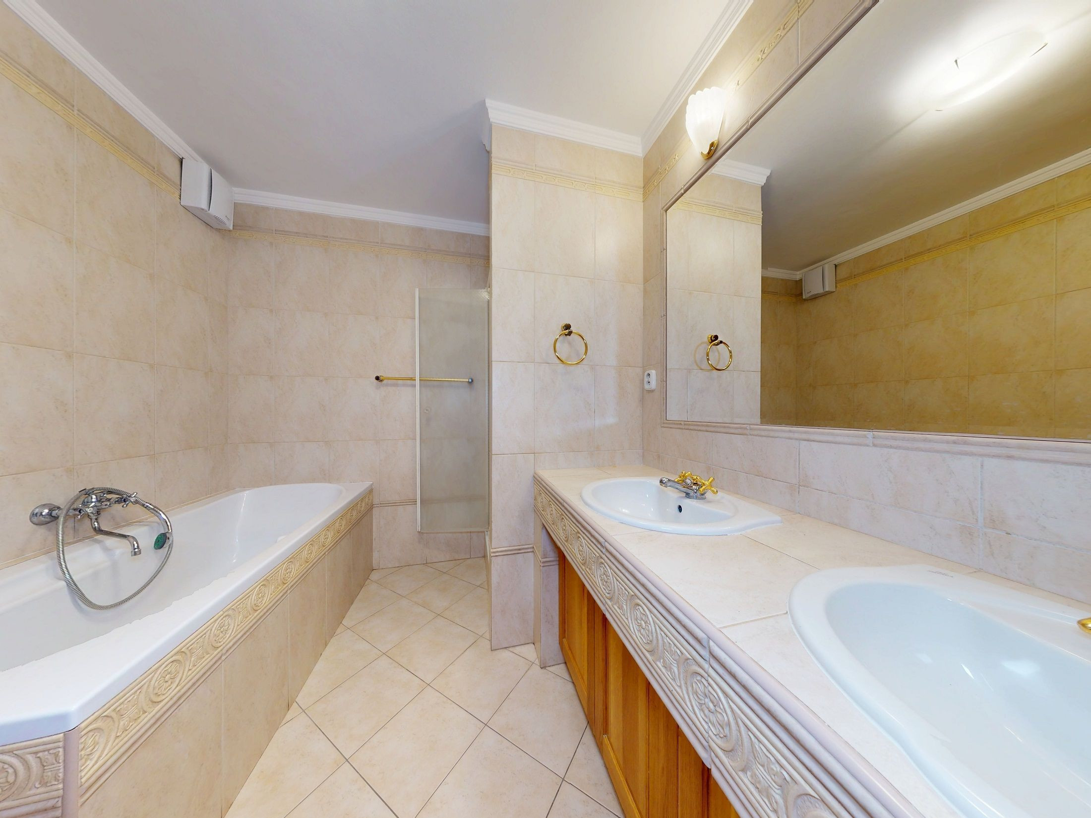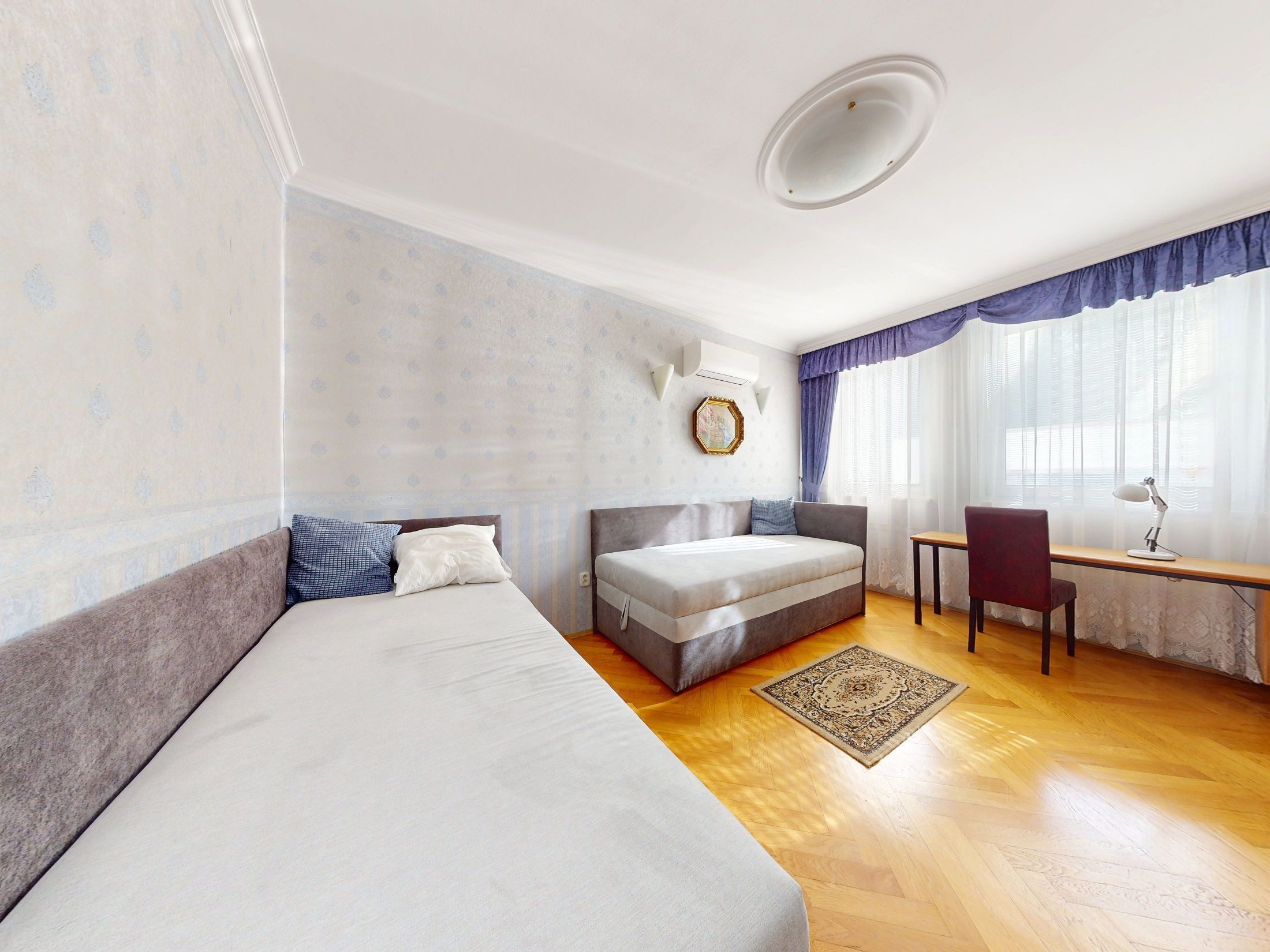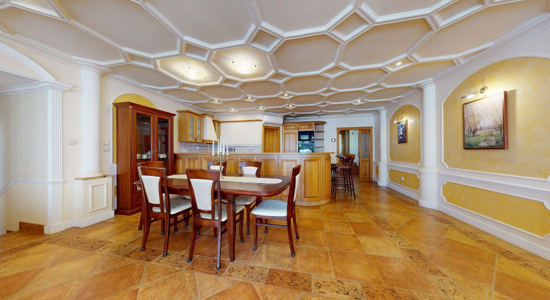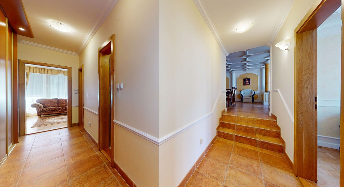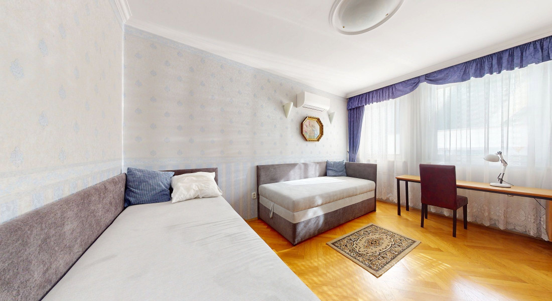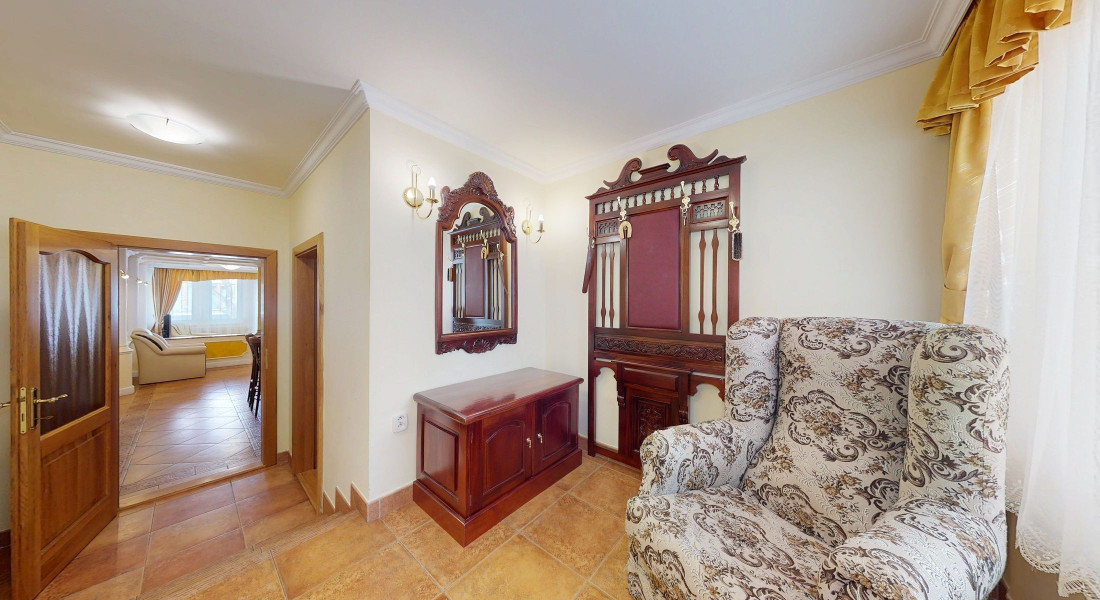Dispozícia: 4 izby (priestranná obývacia izba prepojená s kuchyňou + 3 samostatné izby), dostatok úložného priestoru, spálňa s výstupom na zasklennú zimnú záhradu s posedením, veľkorysý vstup, kúpeľňa s vaňou a sprchovým kútom, WC s bidetom a umývadlom.