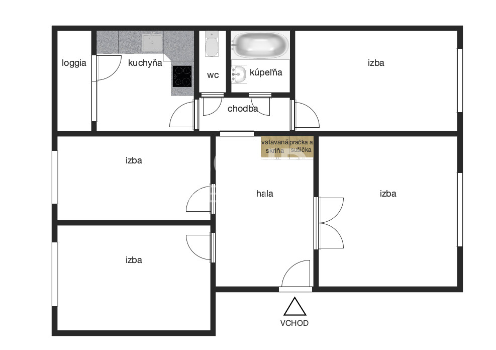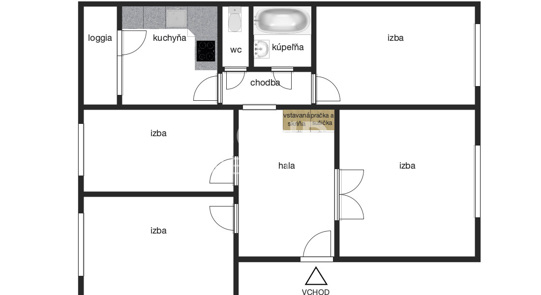 Dispozične je veľmi dobre riešený: veľká vstupná hala, priestranná obývačka, kuchyňa s východom na lodžiu, samostatné WC, kúpeľňa, tri samostatné, neprechodné izby a pivnica.