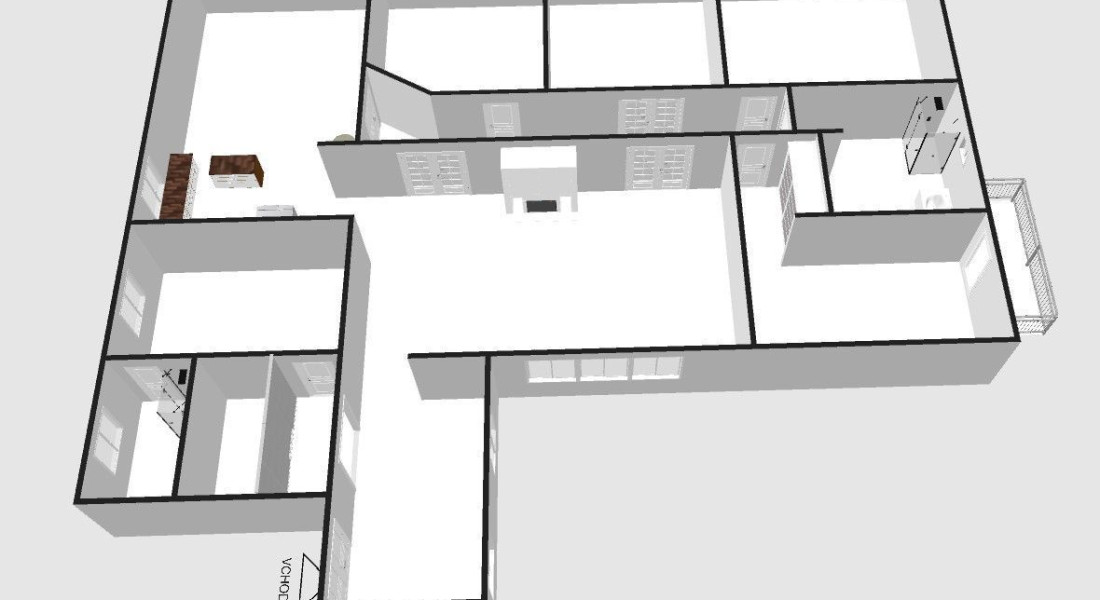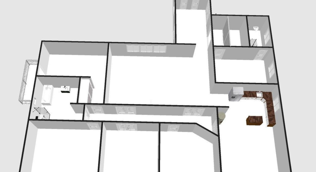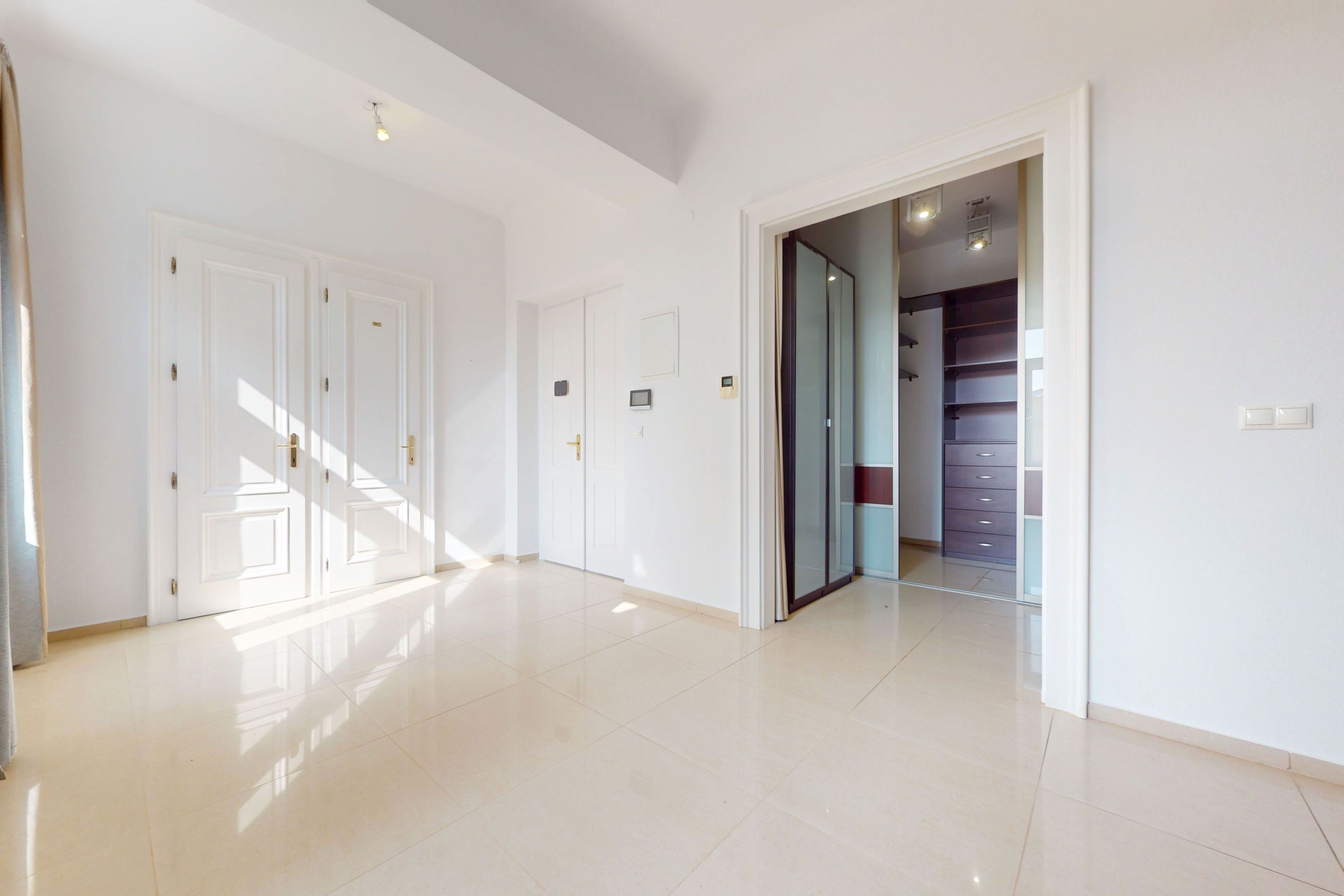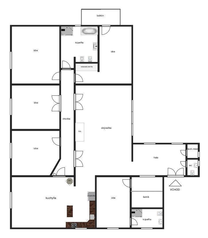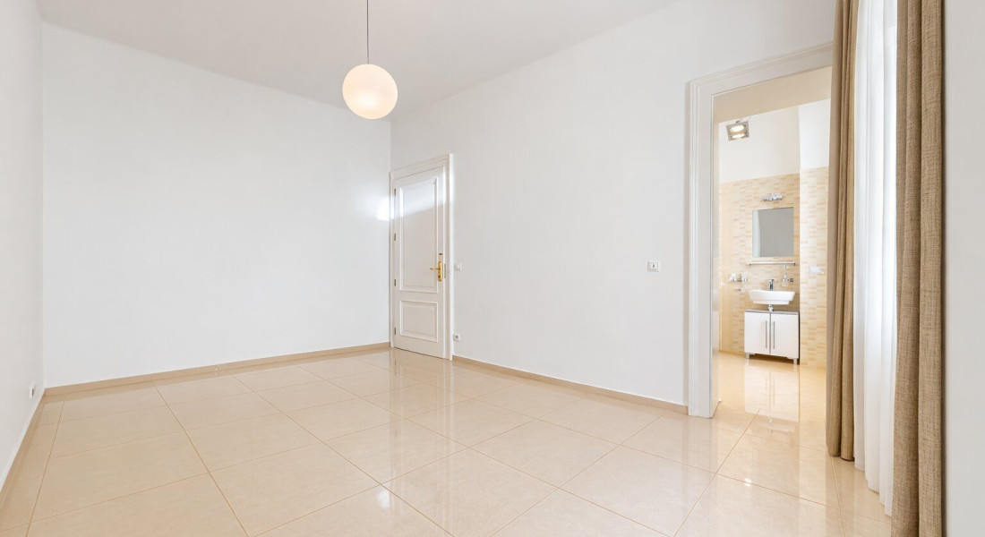 Dispozícia pozostáva zo vstupnej haly, kuchyne s jedálňou (36 m²), priestrannej obývačky (42 m²), 5 samostatných izieb, šatníka, dvoch kúpeľní, troch WC a balkóna o výmere 3,9 m². Byt je orientovaný na všetky štyri svetové strany a je jediným bytom na poschodí.