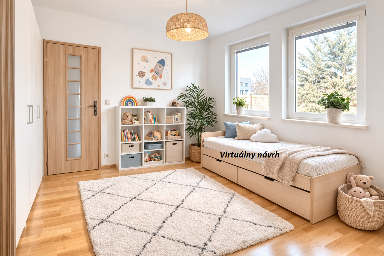 • Denná zóna: Priestranná obývacia izba s krbom prepojená s kuchyňou, doplnená o praktickú komoru s oknom.