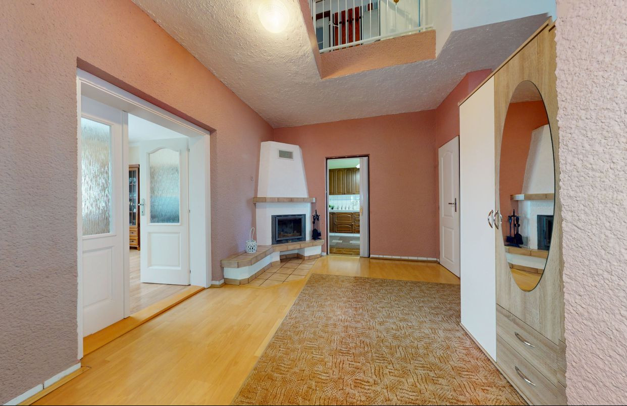 Prízemie: vstupná chodba, kúpeľňa (sprchovací kút, toaleta, umývadlo), hala s krbom, samostatná toaleta, kuchyňa so špajzou, obývacia izba, izba.