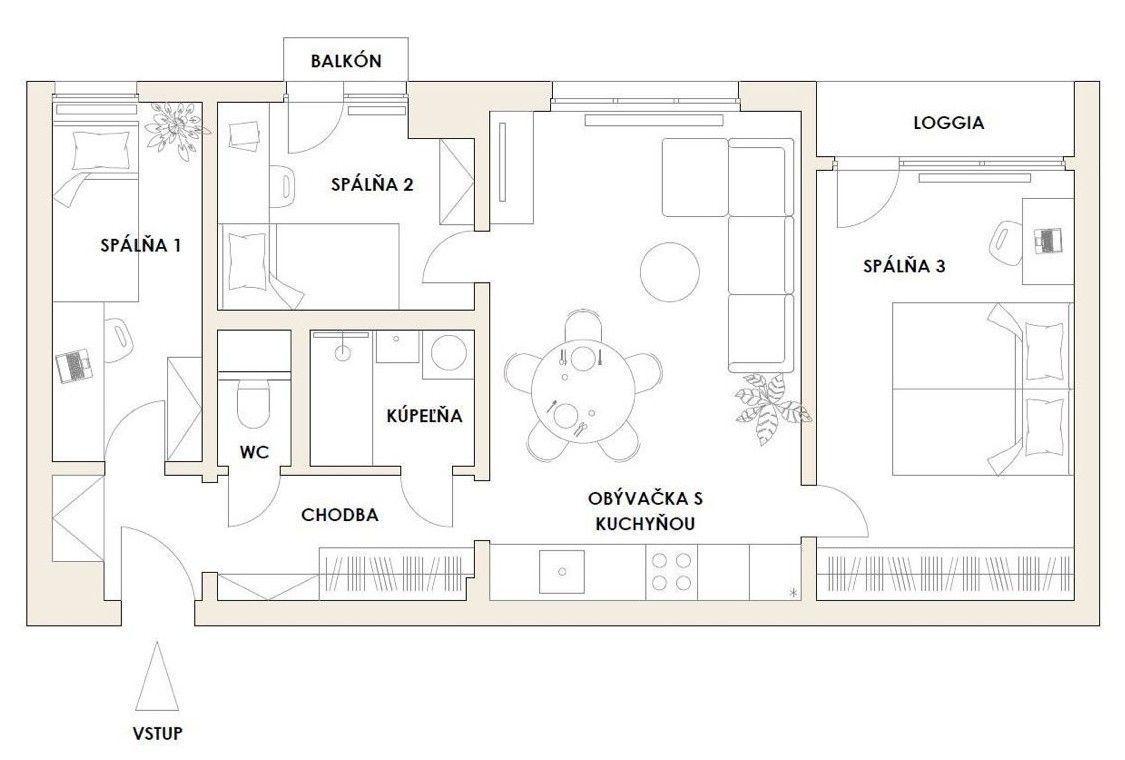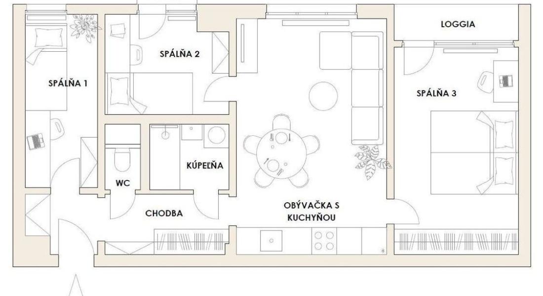 Je výborne dispozične riešený: vstupná chodba s bezpečnostnými dverami, kúpeľňa so sprchovacím kútom, samostatné WC, kuchyňa s jedálenským kútom a otvorenou dispozíciou do obývačky s výstupom na loggiu, spálňa, dve nepriechodné izby, balkón.