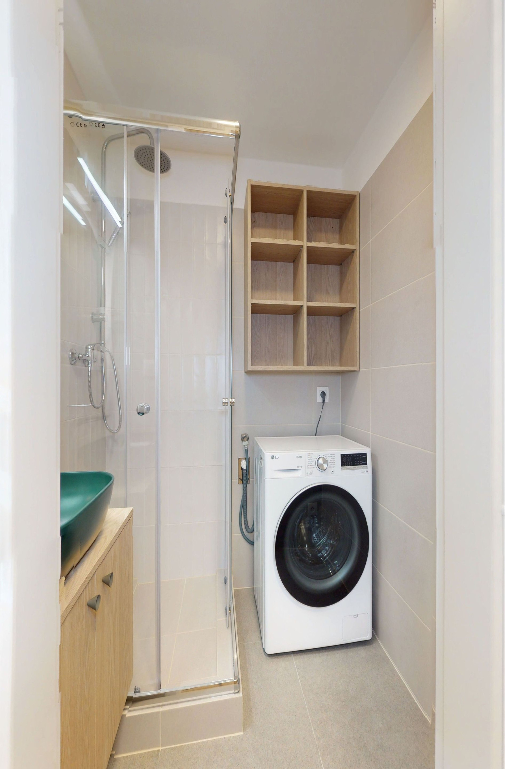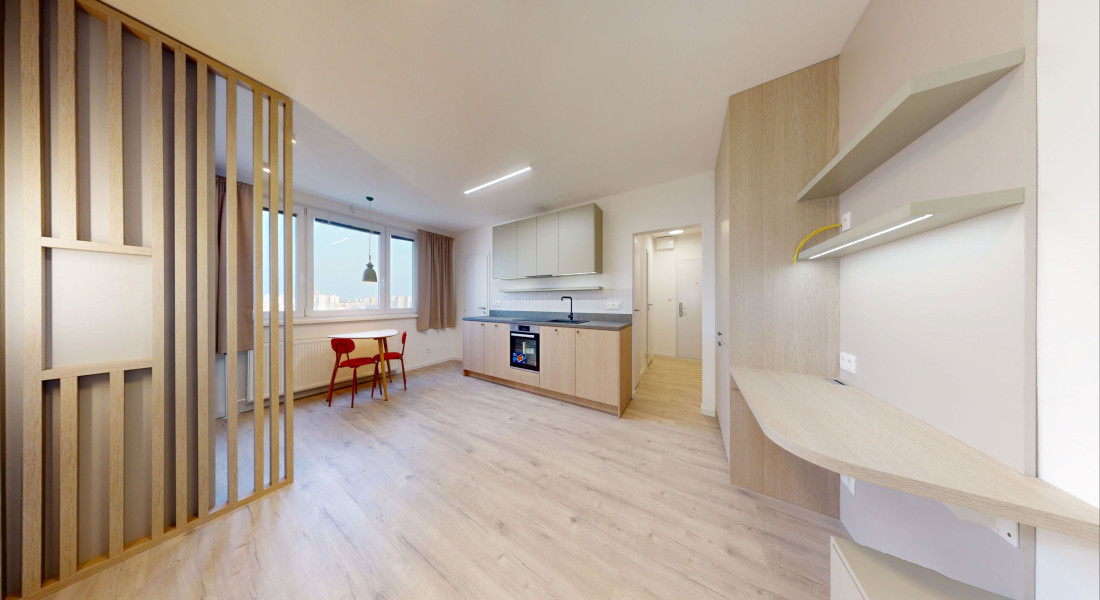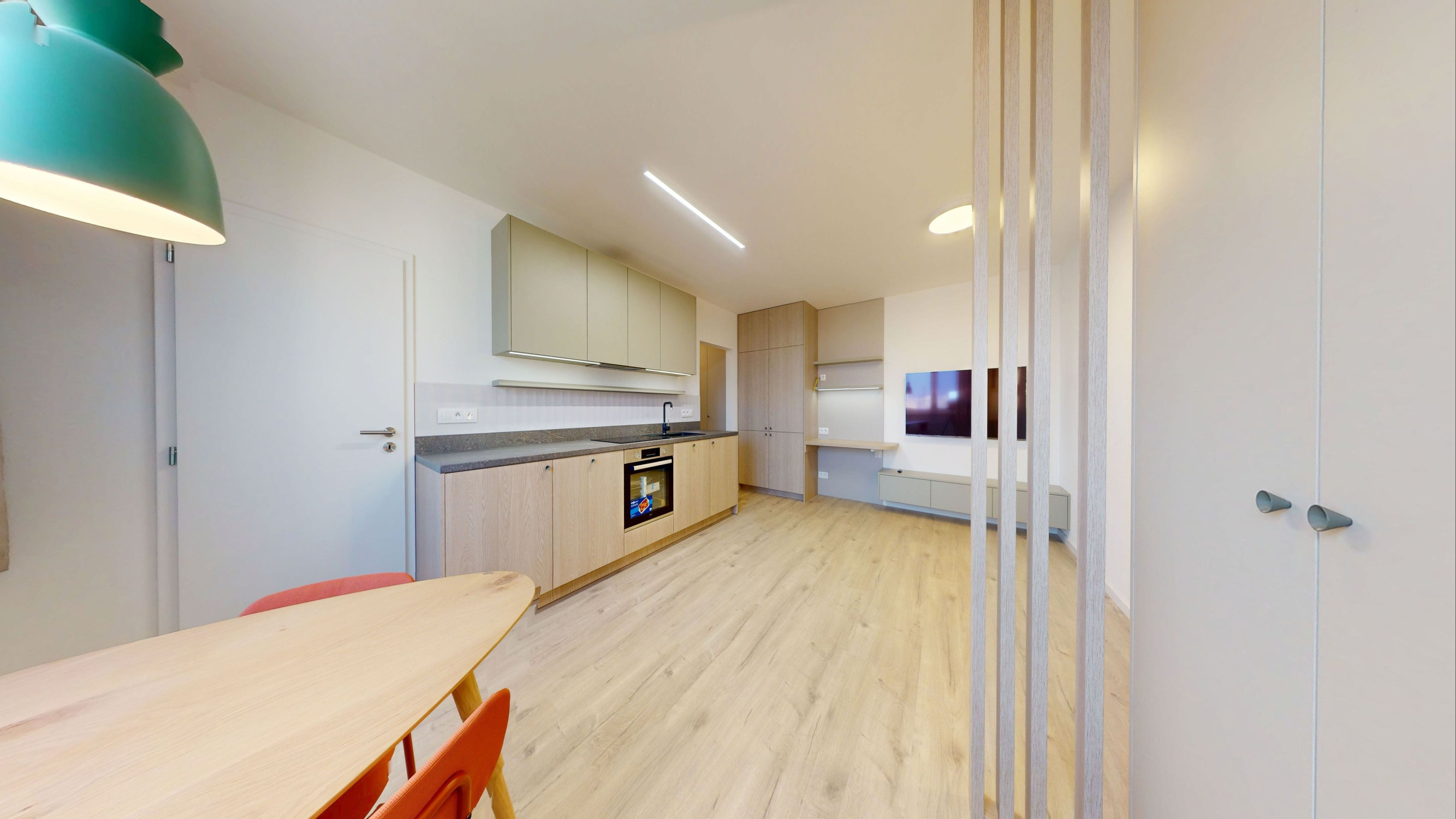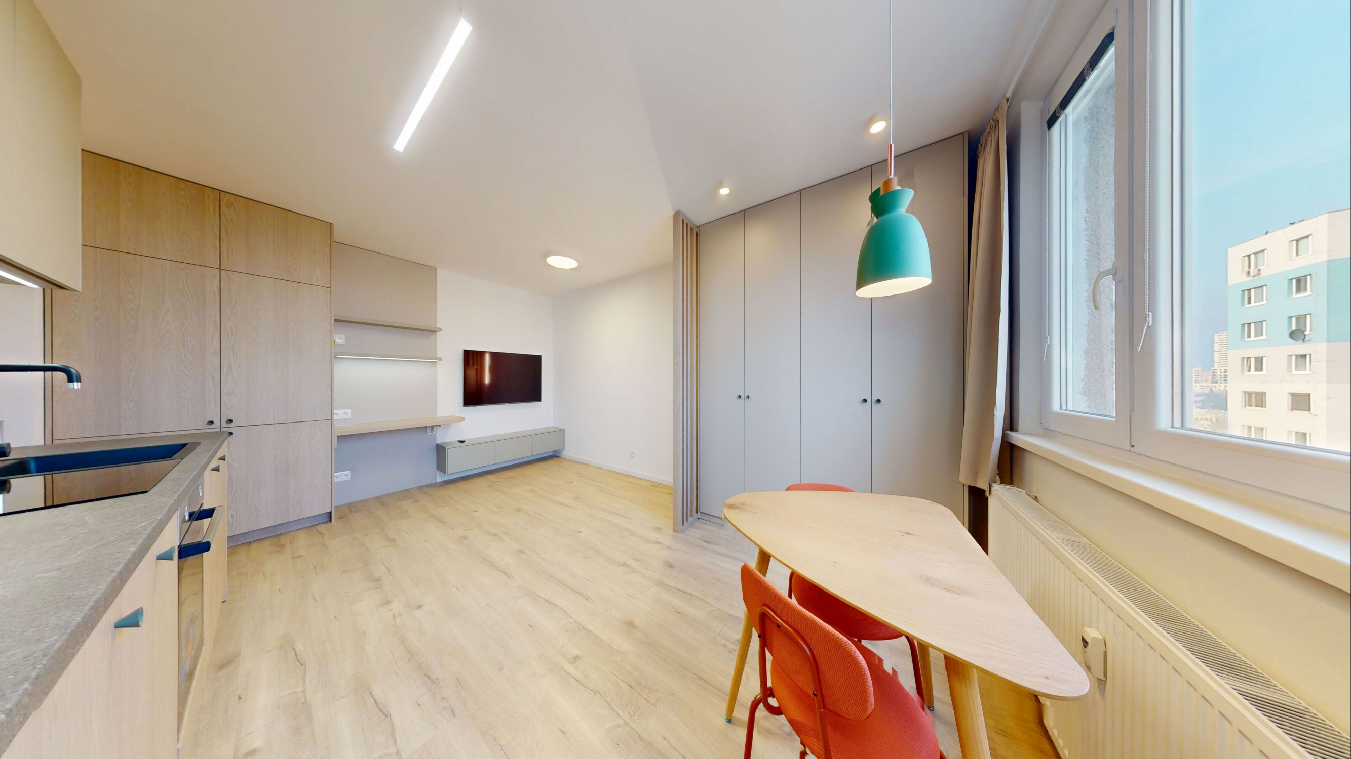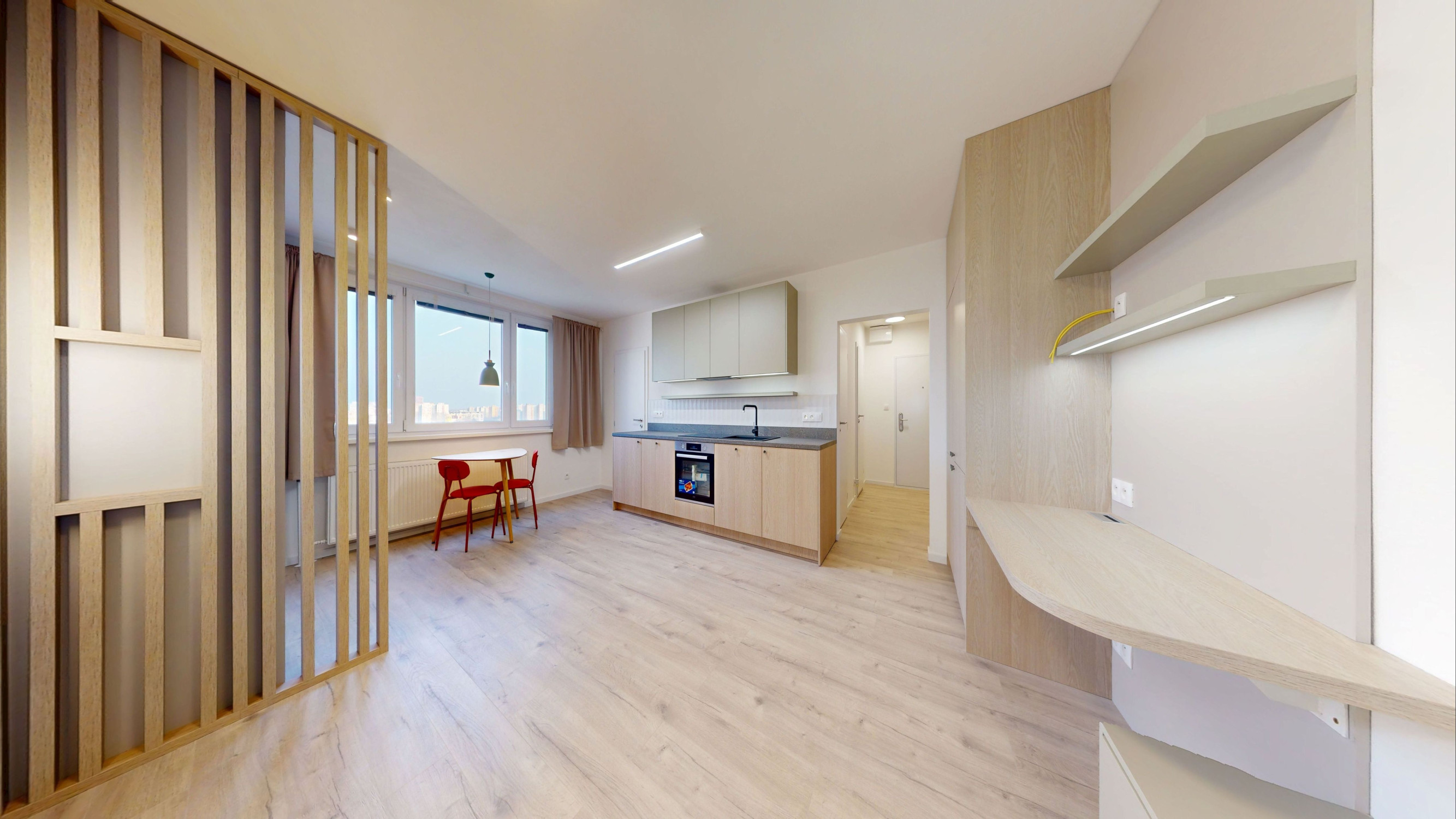 Dispozícia: vstupná hala s dostatkom úložného priestoru, samostatné WC, kúpeľňa so sprchovým kútom a práčkou so sušičkou, obývacia izba prepojená s kuchyňou, samostatná spálňa, pracovný kút. Kuchyňa je plne vybavená spotrebičmi.