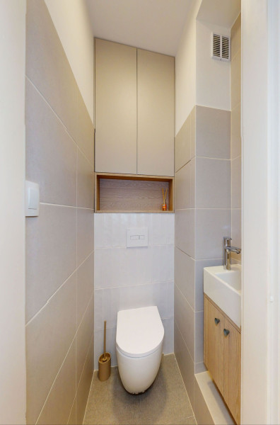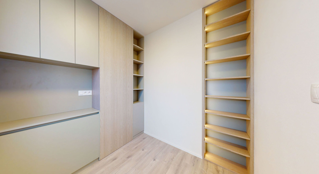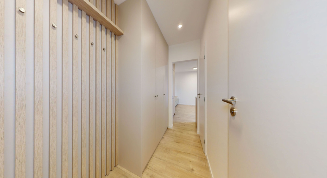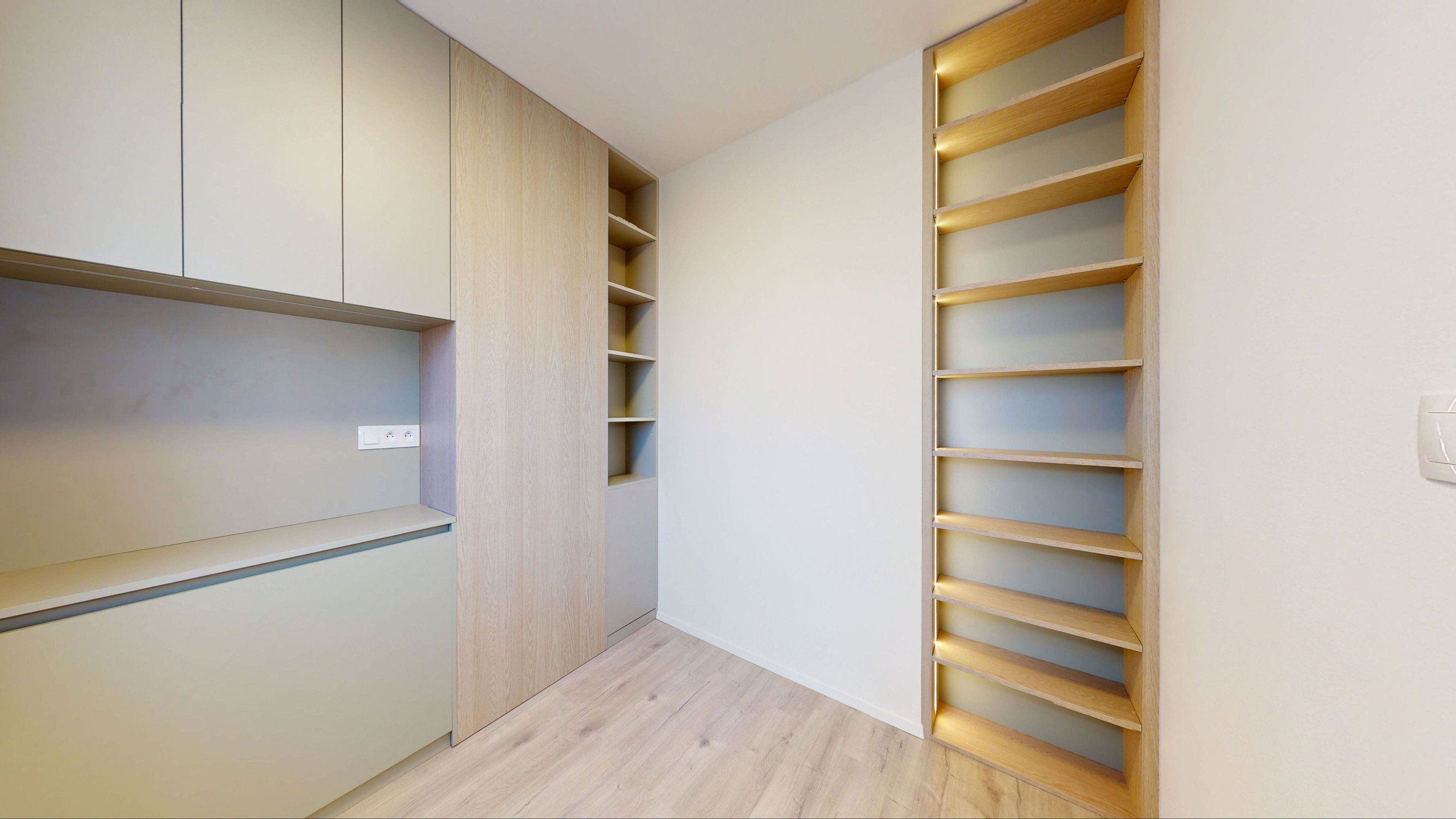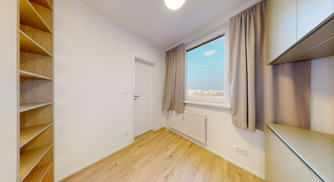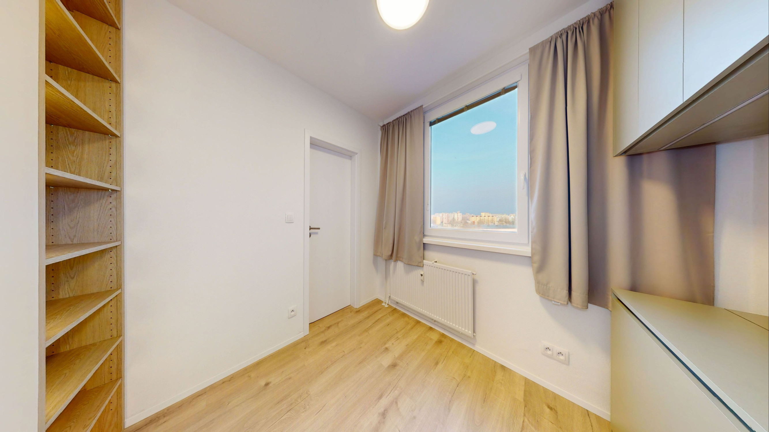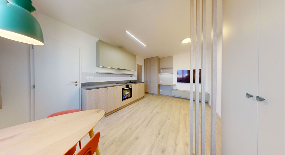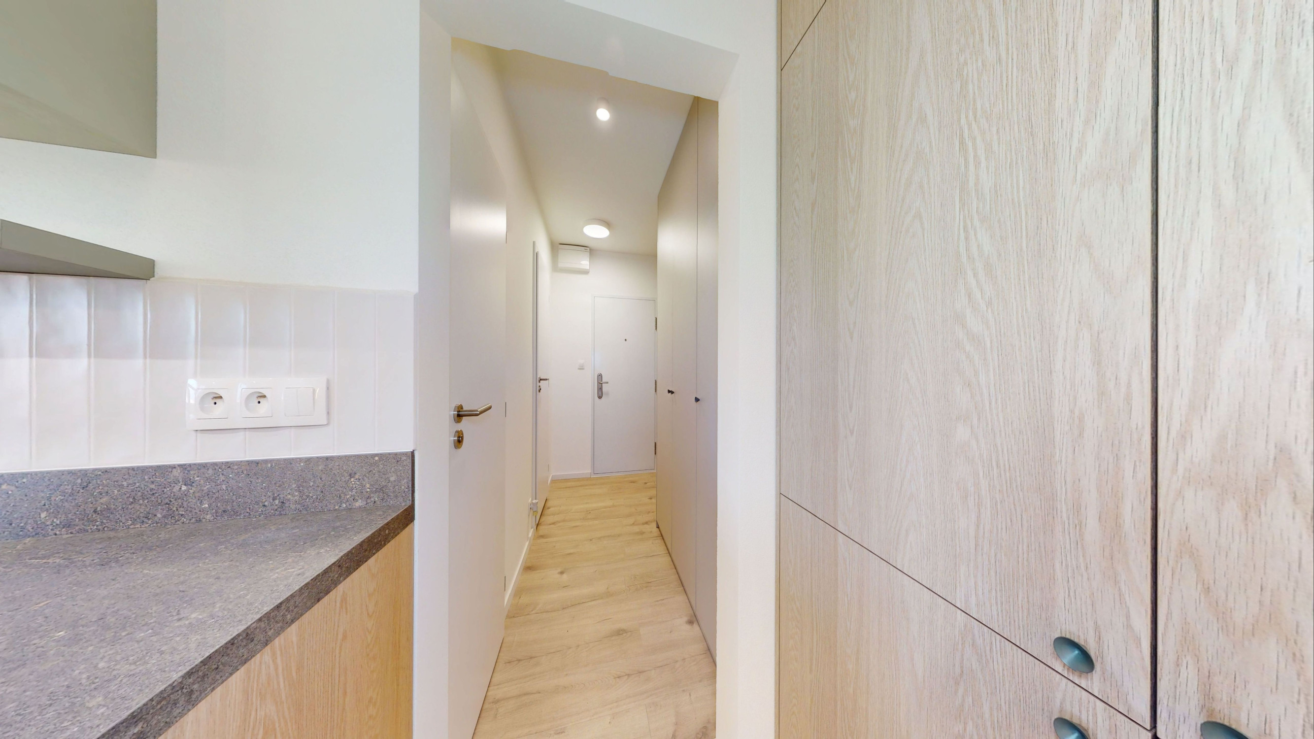 Dispozícia: vstupná hala s dostatkom úložného priestoru, samostatné WC, kúpeľňa so sprchovým kútom a práčkou so sušičkou, obývacia izba prepojená s kuchyňou, samostatná spálňa, pracovný kút. Kuchyňa je plne vybavená spotrebičmi.