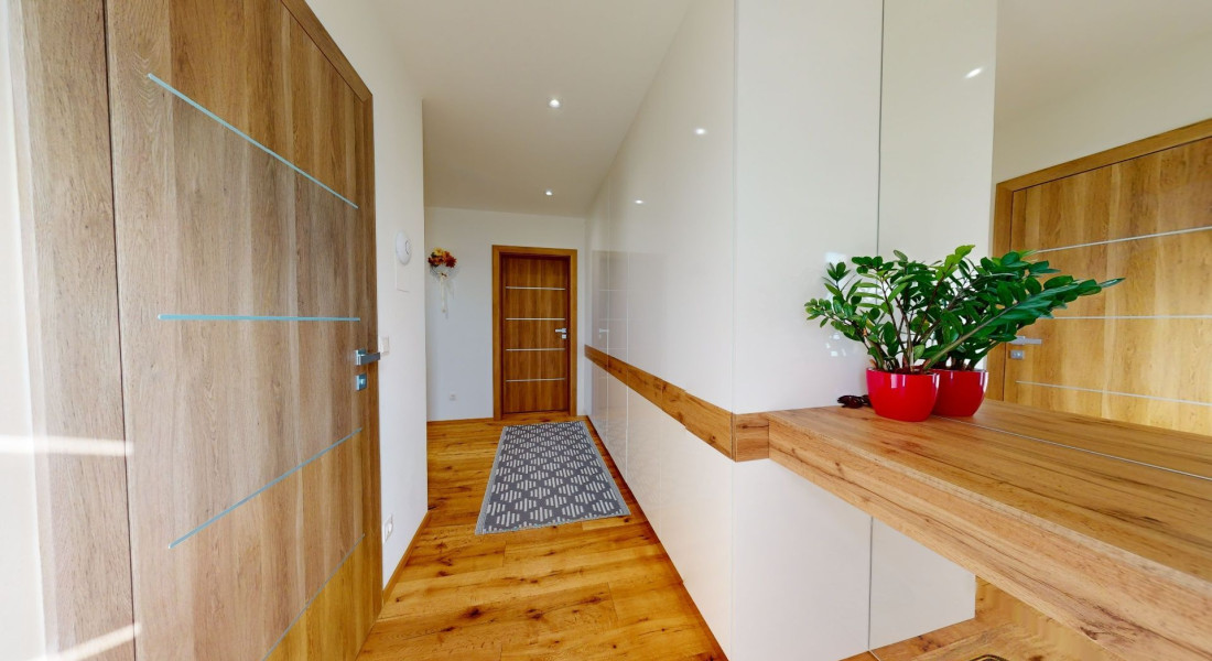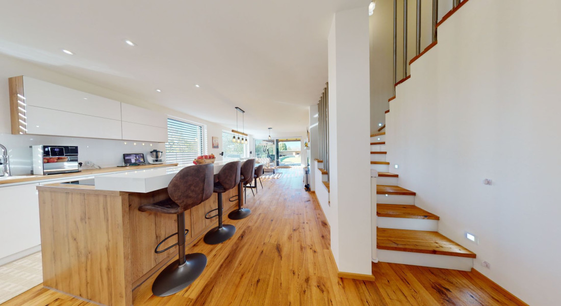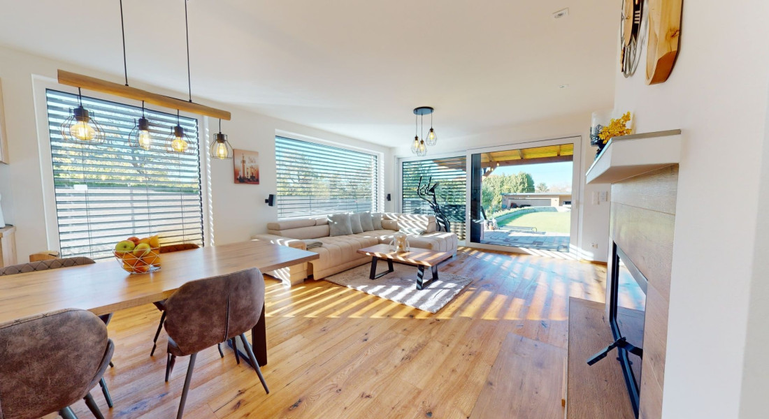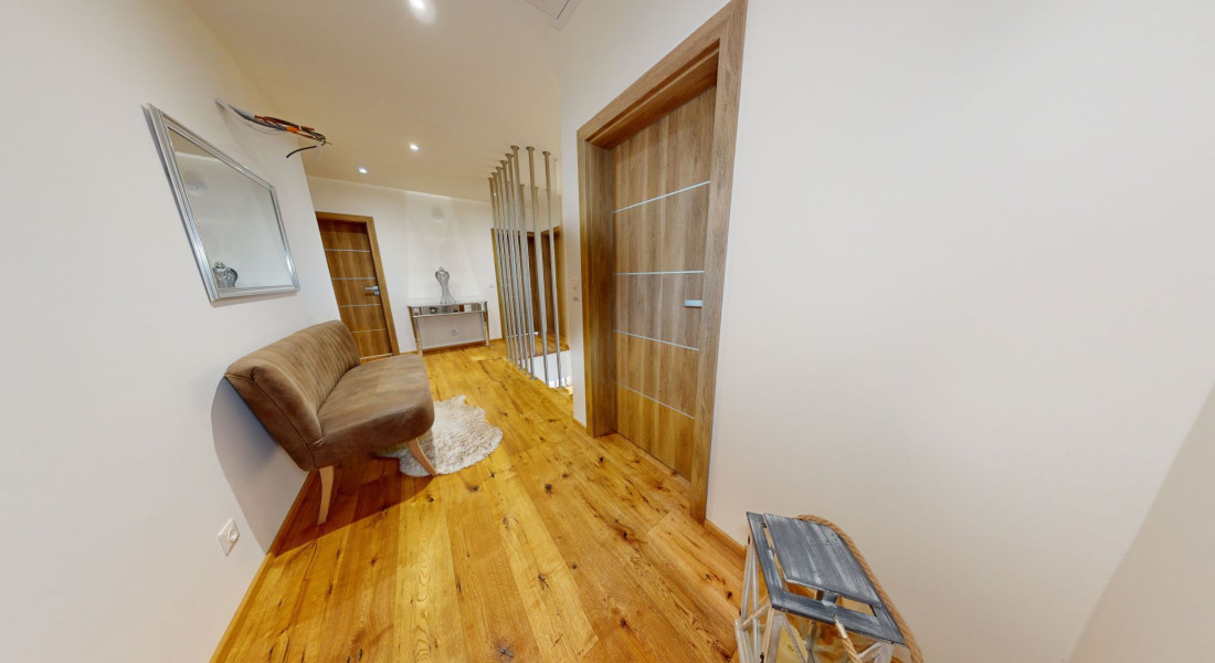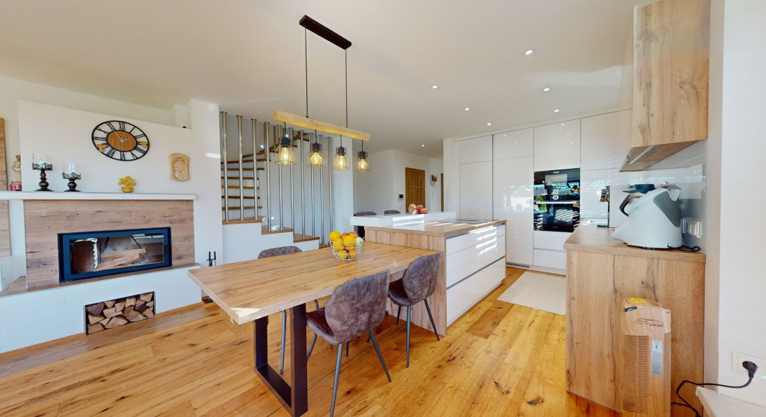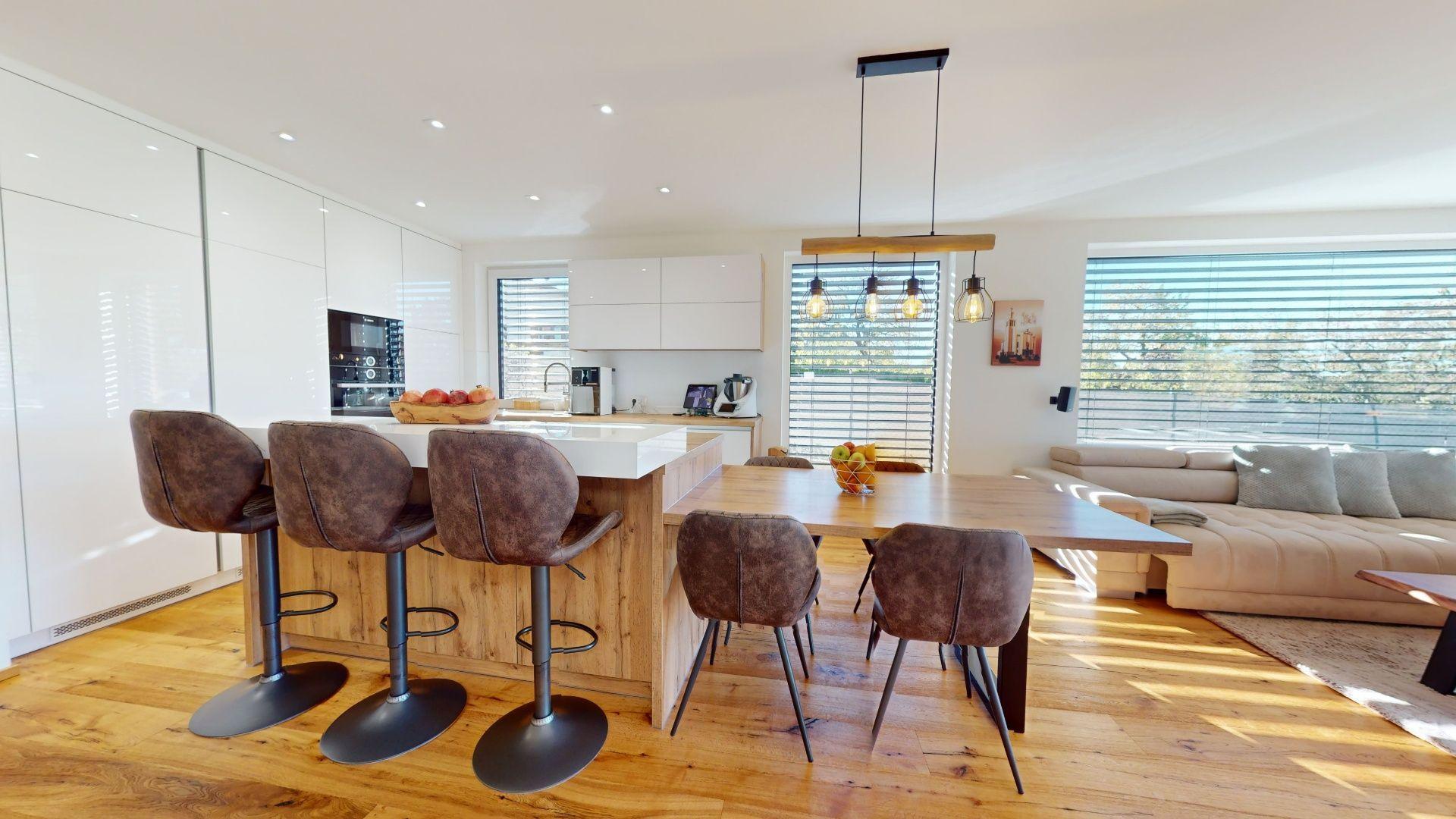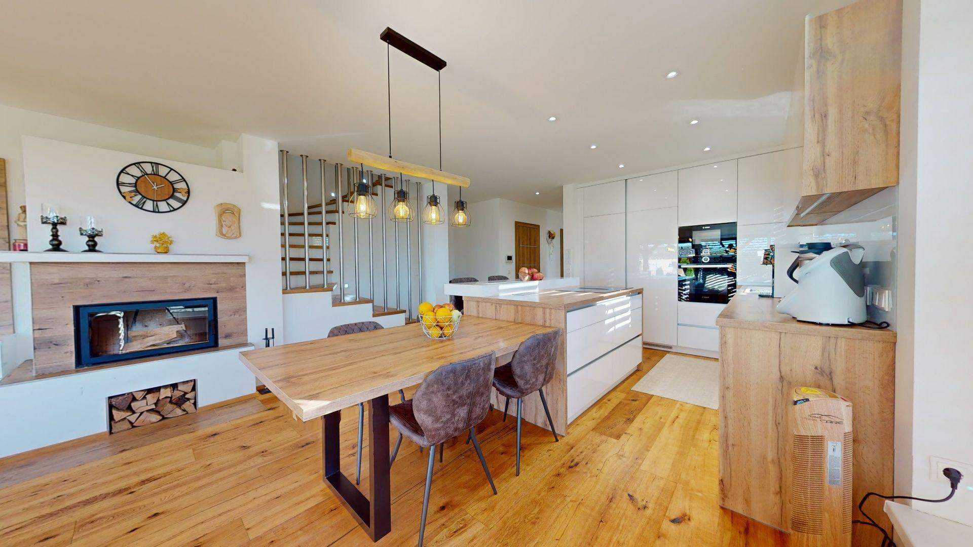 Celý dom je postavený s dôrazom najmä na používanie trvalo udržateľných a ekologických stavebných materiálov a predovšetkým na ekologický spôsob vykurovania. So vzduchovým tepelným čerpadlom v kombinácii s fotovoltaickým systémom je dom vybavený tým najlepším z najlepšieho a má teda nízke náklady na vykurovanie a elektrinu. Pomocou podlahového kúrenia môžete vykurovať a chladiť celý dom, takže si ľahko zabezpečíte príjemnú vnútornú klímu. Kuchyňa na mieru s moderným varným ostrovčekom je vybavená spotrebičmi Bosch. Ďalšou zaujímavosťou je dvojgaráž s priľahlou kanceláriou a toaletou. Originál drevené podlahy a dvere z masívu dodávajú domu šarm a eleganciu. Každý kúsok tejto nehnuteľnosti odráža kvalitu a pozornosť k detailom.