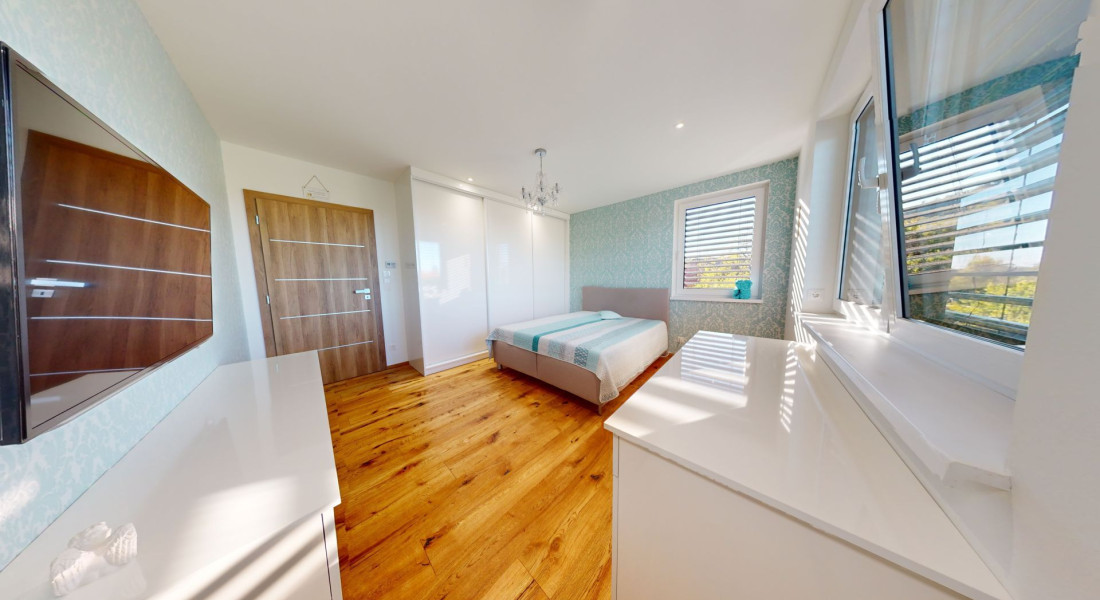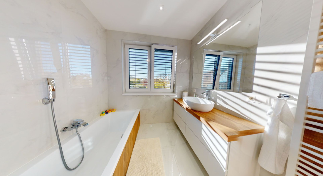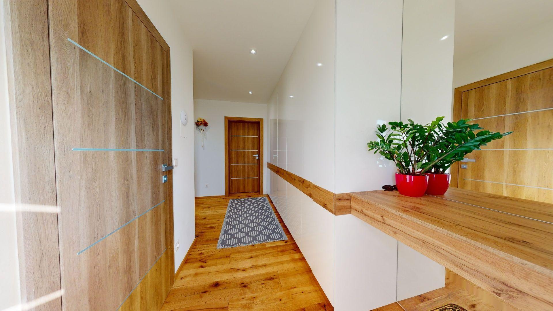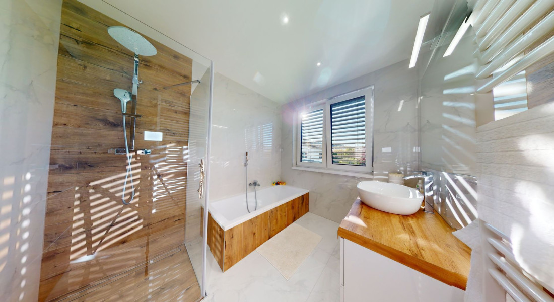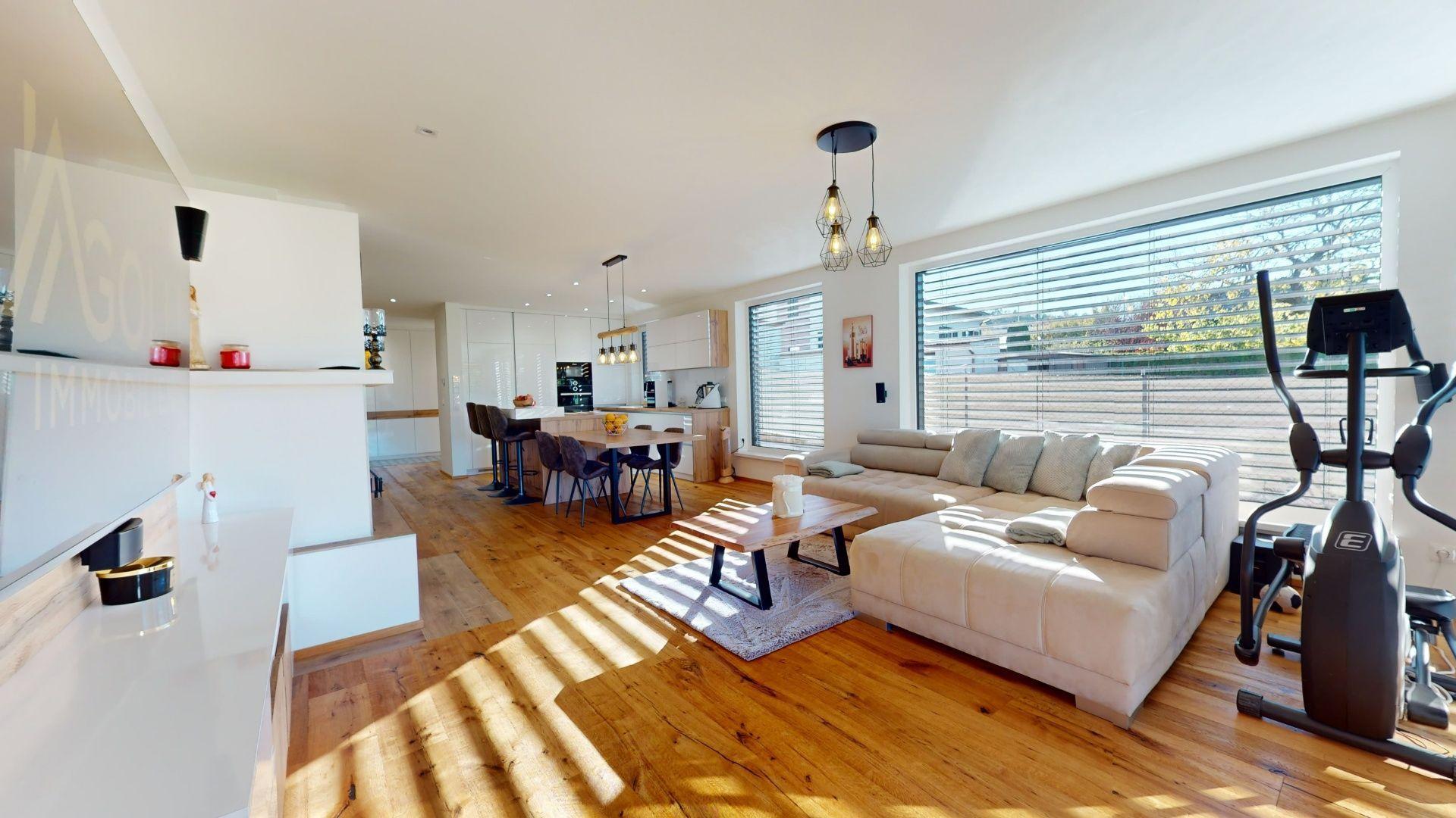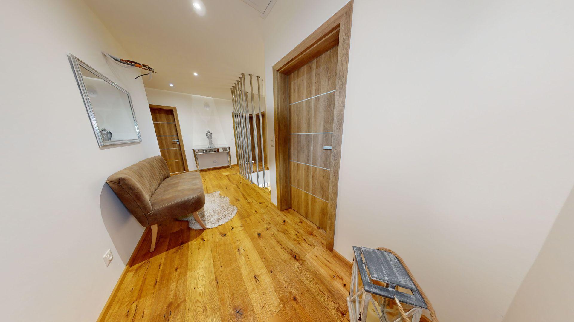 Celý dom je postavený s dôrazom najmä na používanie trvalo udržateľných a ekologických stavebných materiálov a predovšetkým na ekologický spôsob vykurovania. So vzduchovým tepelným čerpadlom v kombinácii s fotovoltaickým systémom je dom vybavený tým najlepším z najlepšieho a má teda nízke náklady na vykurovanie a elektrinu. Pomocou podlahového kúrenia môžete vykurovať a chladiť celý dom, takže si ľahko zabezpečíte príjemnú vnútornú klímu. Kuchyňa na mieru s moderným varným ostrovčekom je vybavená spotrebičmi Bosch. Ďalšou zaujímavosťou je dvojgaráž s priľahlou kanceláriou a toaletou. Originál drevené podlahy a dvere z masívu dodávajú domu šarm a eleganciu. Každý kúsok tejto nehnuteľnosti odráža kvalitu a pozornosť k detailom.