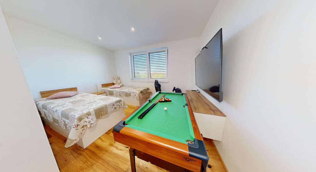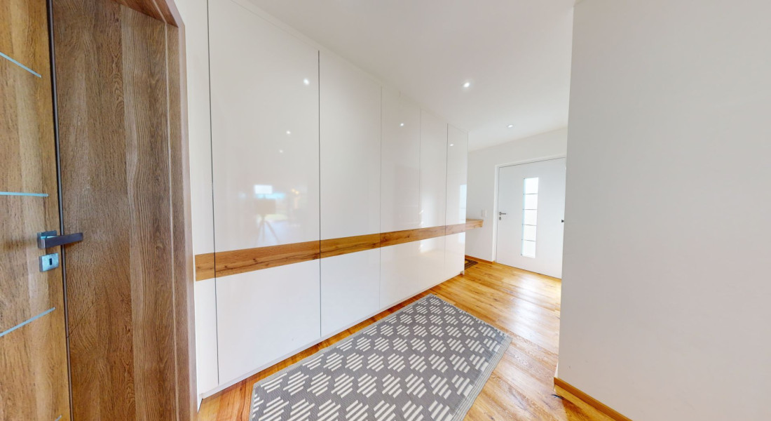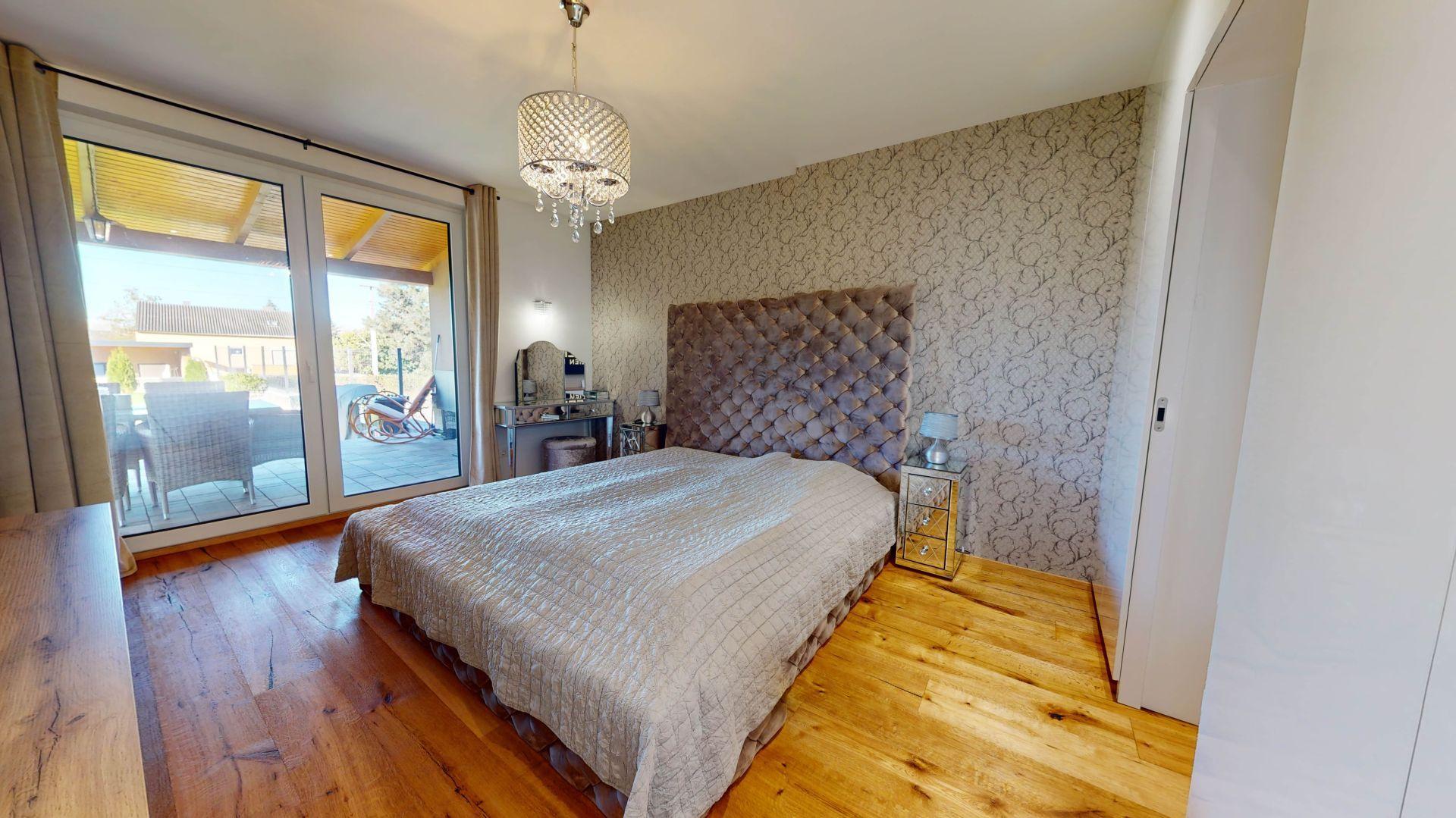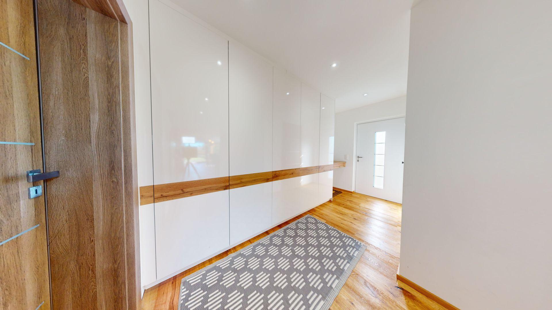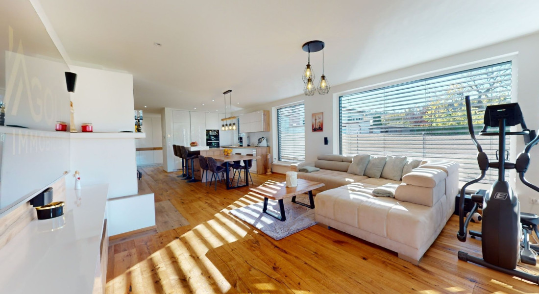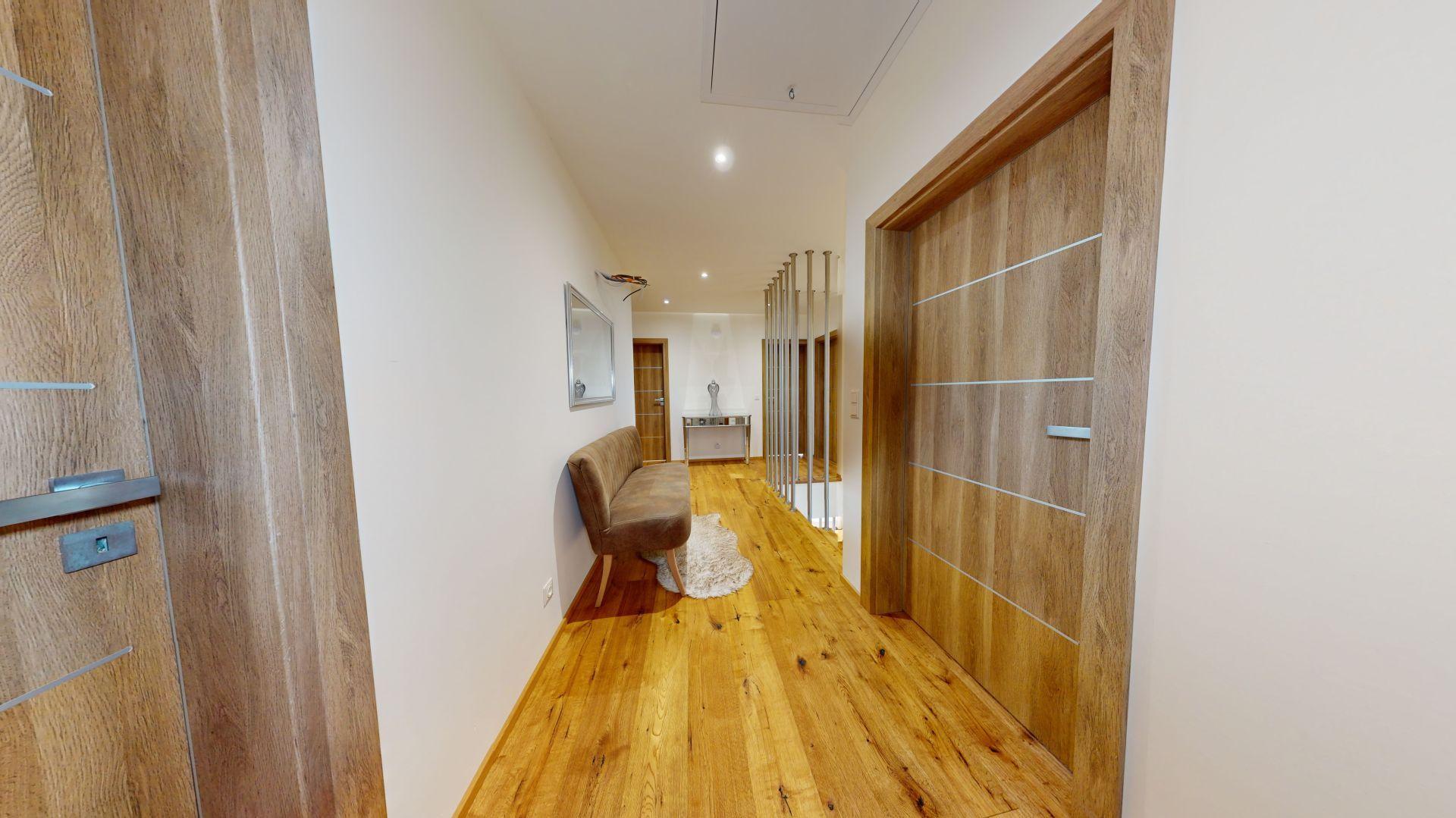 Celý dom je postavený s dôrazom najmä na používanie trvalo udržateľných a ekologických stavebných materiálov a predovšetkým na ekologický spôsob vykurovania. So vzduchovým tepelným čerpadlom v kombinácii s fotovoltaickým systémom je dom vybavený tým najlepším z najlepšieho a má teda nízke náklady na vykurovanie a elektrinu. Pomocou podlahového kúrenia môžete vykurovať a chladiť celý dom, takže si ľahko zabezpečíte príjemnú vnútornú klímu. Kuchyňa na mieru s moderným varným ostrovčekom je vybavená spotrebičmi Bosch. Ďalšou zaujímavosťou je dvojgaráž s priľahlou kanceláriou a toaletou. Originál drevené podlahy a dvere z masívu dodávajú domu šarm a eleganciu. Každý kúsok tejto nehnuteľnosti odráža kvalitu a pozornosť k detailom.