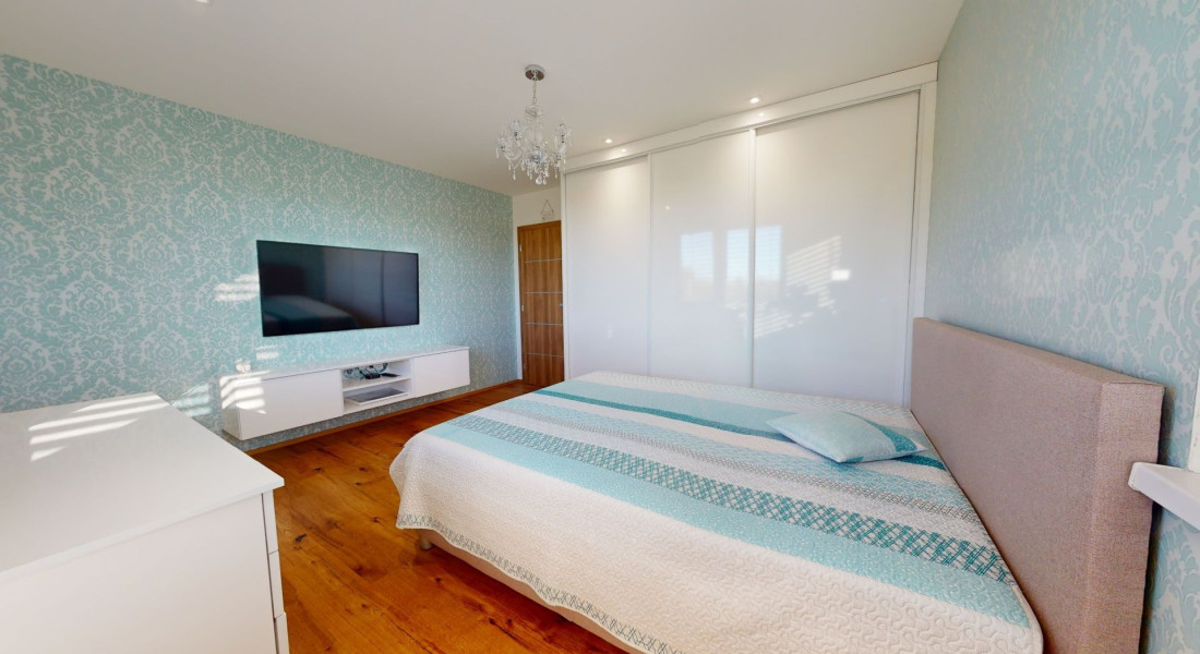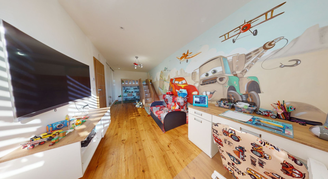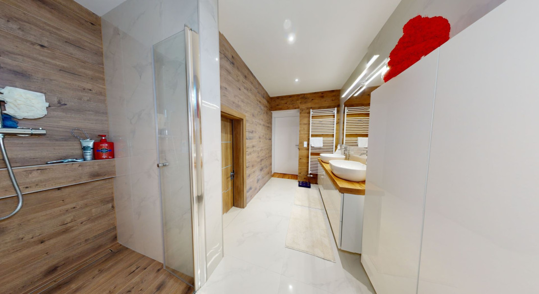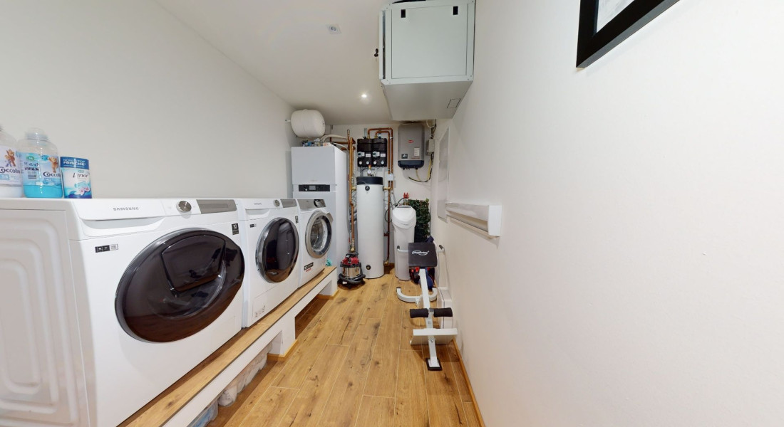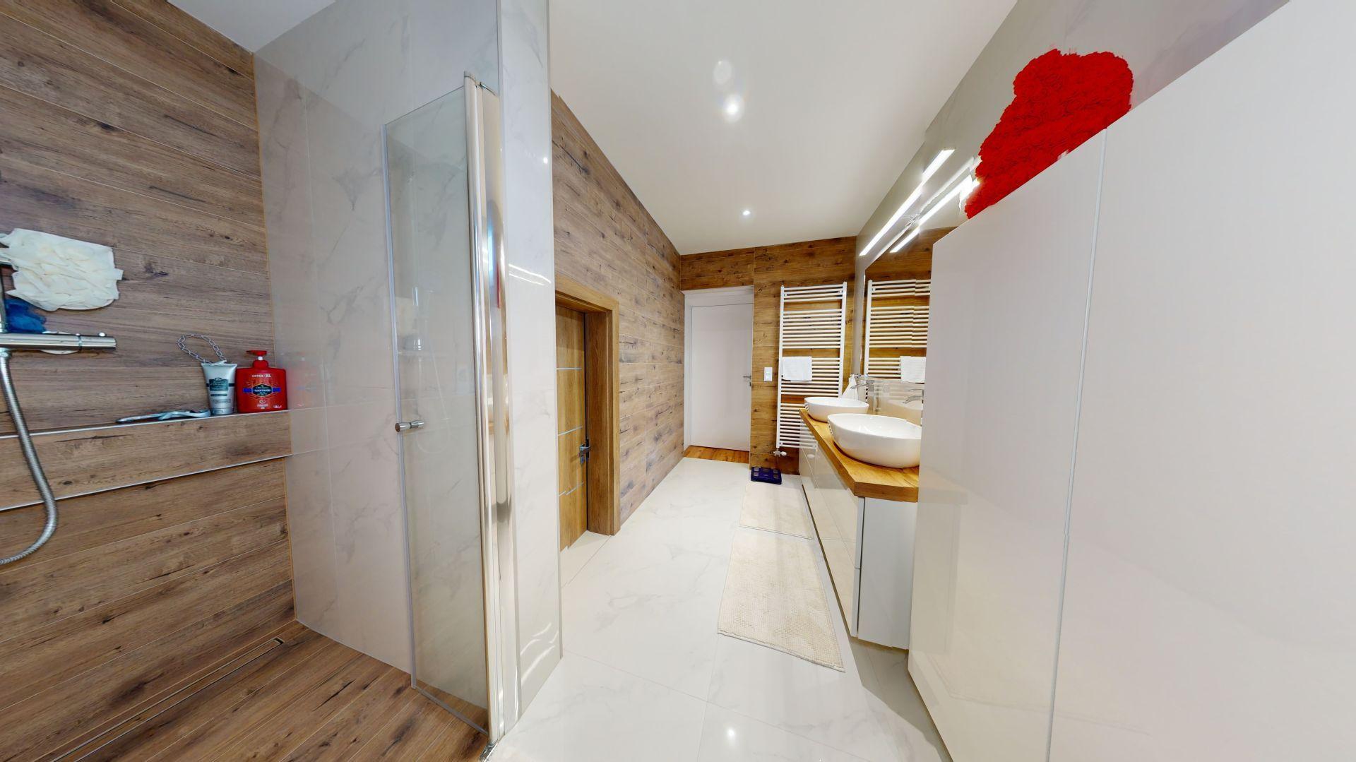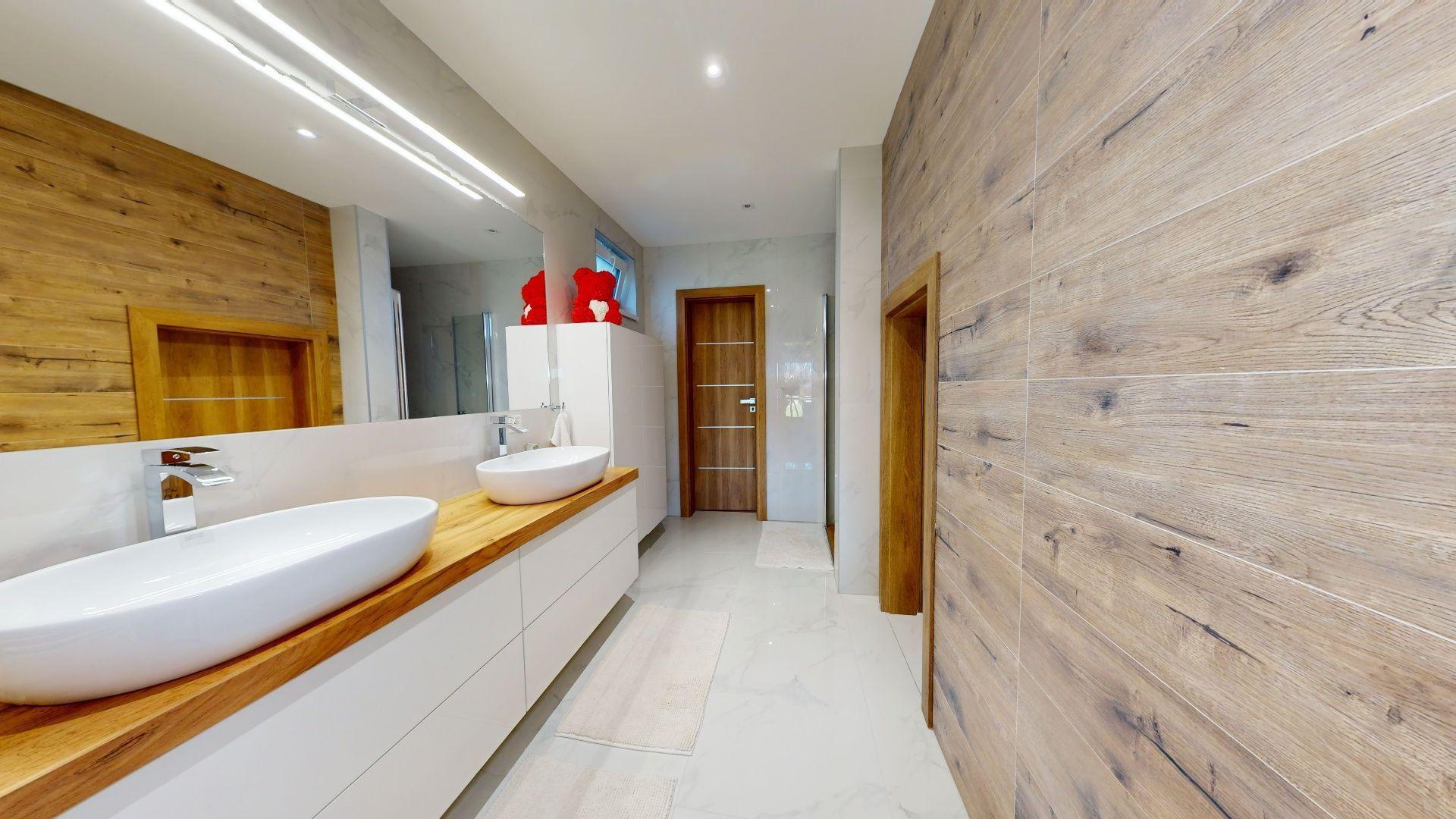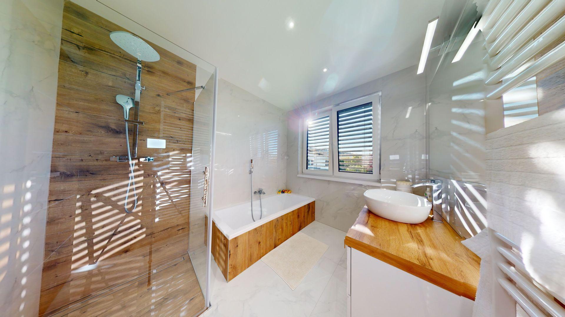 Celý dom je postavený s dôrazom najmä na používanie trvalo udržateľných a ekologických stavebných materiálov a predovšetkým na ekologický spôsob vykurovania. So vzduchovým tepelným čerpadlom v kombinácii s fotovoltaickým systémom je dom vybavený tým najlepším z najlepšieho a má teda nízke náklady na vykurovanie a elektrinu. Pomocou podlahového kúrenia môžete vykurovať a chladiť celý dom, takže si ľahko zabezpečíte príjemnú vnútornú klímu. Kuchyňa na mieru s moderným varným ostrovčekom je vybavená spotrebičmi Bosch. Ďalšou zaujímavosťou je dvojgaráž s priľahlou kanceláriou a toaletou. Originál drevené podlahy a dvere z masívu dodávajú domu šarm a eleganciu. Každý kúsok tejto nehnuteľnosti odráža kvalitu a pozornosť k detailom.