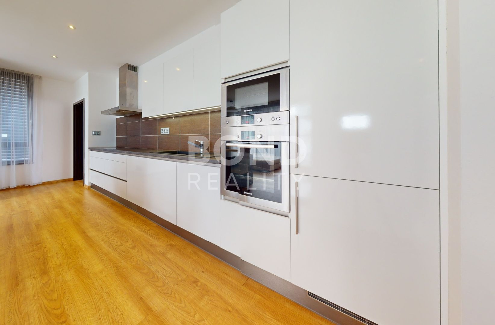 Kuchynská linka plne vybavená spotrebičmi Bosch - umývačka riadu, indukčná varná doska, chladnička, mraznička, mikrovlnka, elektrická rúra.