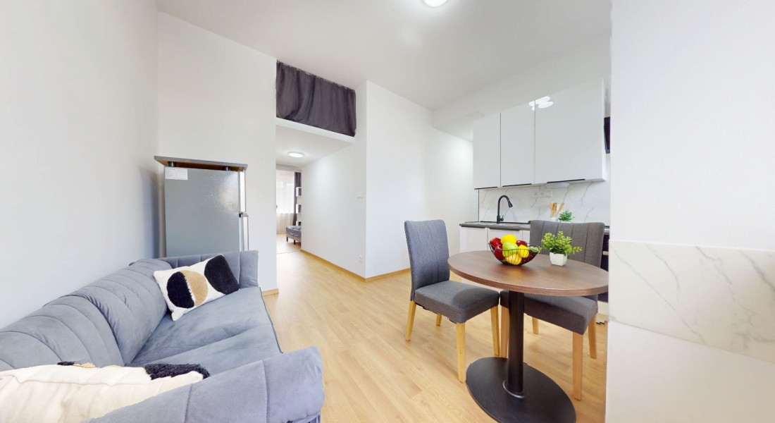 Srdcom bytu je veľkorysá kuchyňa prepojená s jedálenským stolom a pohodlným gaučom. Ideálne miesto na rannú kávu, večere s priateľmi aj pokojné večery.