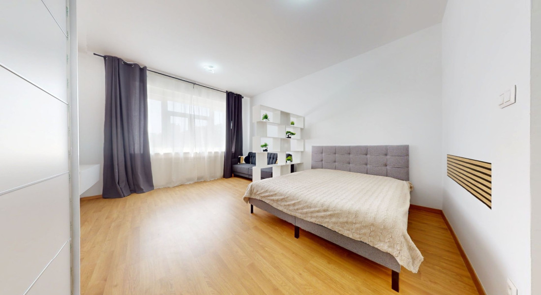 Druhá izba je dômyselne rozdelená na dve zóny – nočnú s manželskou posteľou a dennú s gaučom a televíziou. Elegantná knižnica vytvára prirodzené oddelenie a dodáva priestoru charakter.