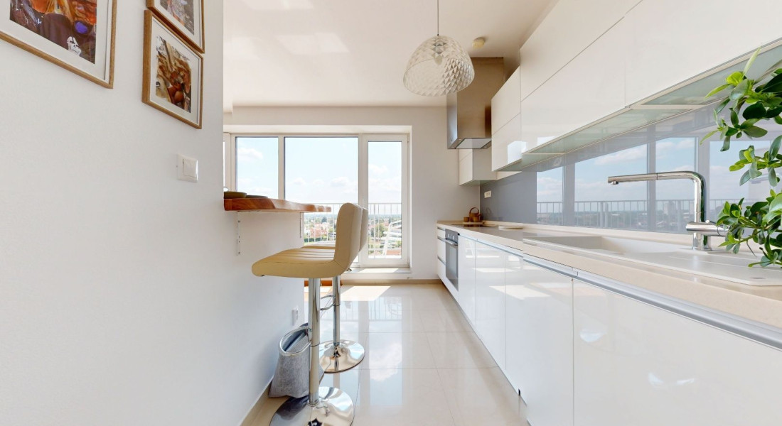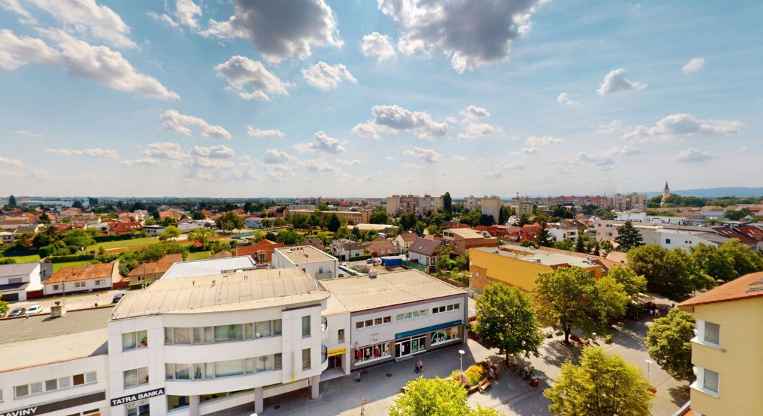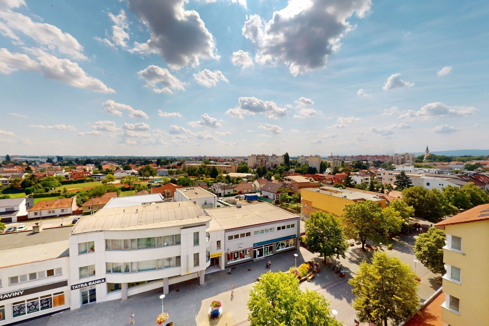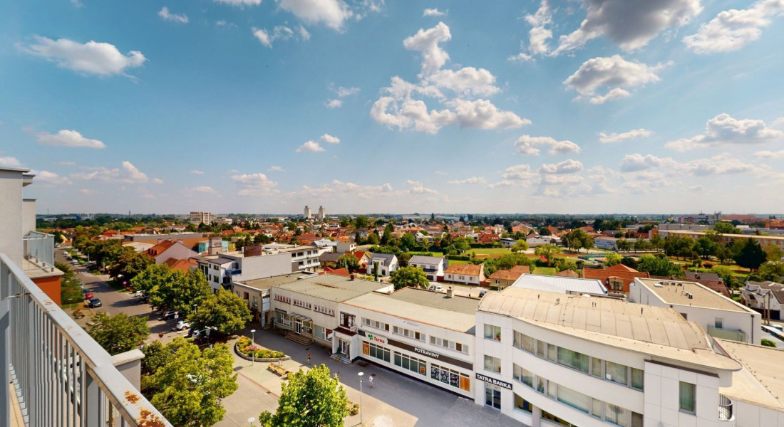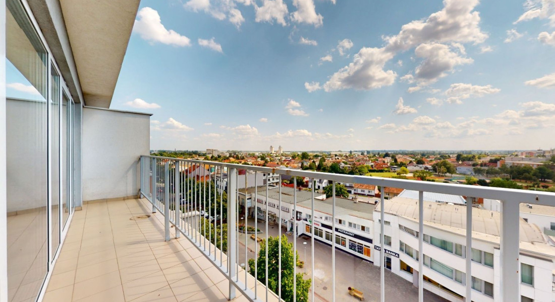 Byt má priestrannú vstupnú chodbu, obývaciu miestnosť prepojenú s kuchyňou a s prekrásnym výhľadom na Senec. Obývacia miestnosť má západnú orientáciu. Izby majú východnú orientáciu. Z obývacej miestnosti je východ na loggiu /9,10m2/. Dominantou bytu sú veľkometrážne okná v obývacej izbe. Kuchyňa má samostatnú špajzu, je plne vybavená spotrebičmi a má elegantnú pracovnú dosku z umelého kameňa.