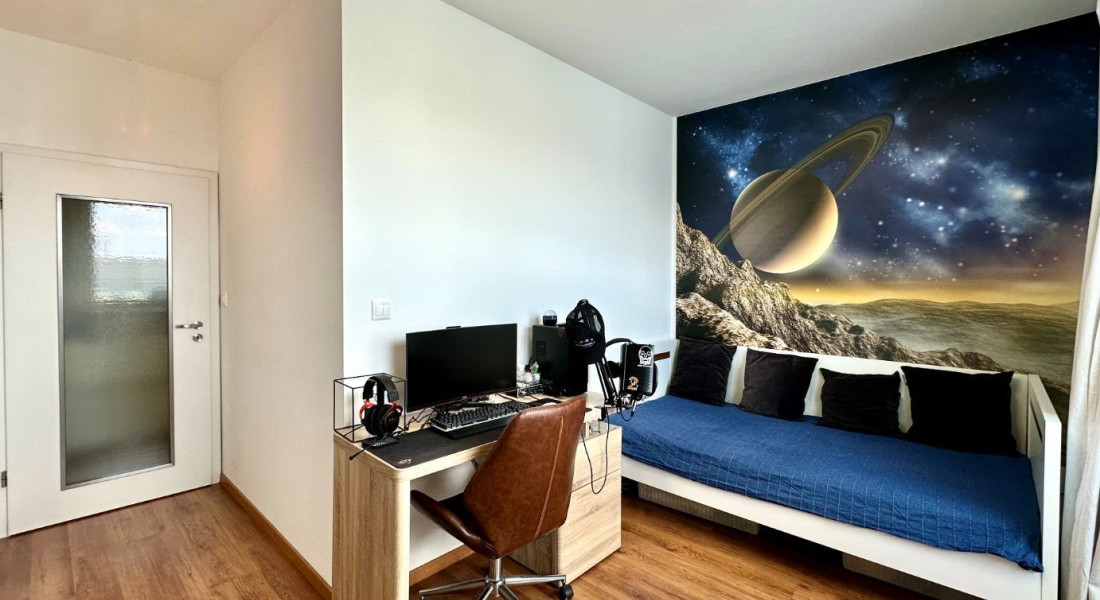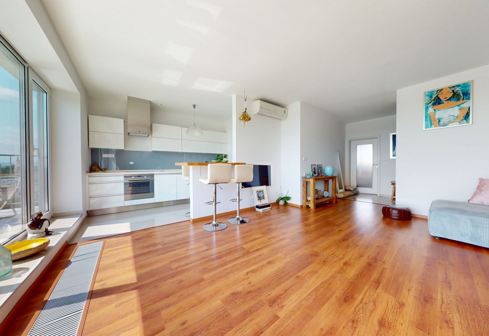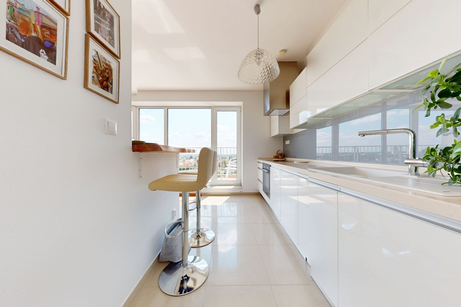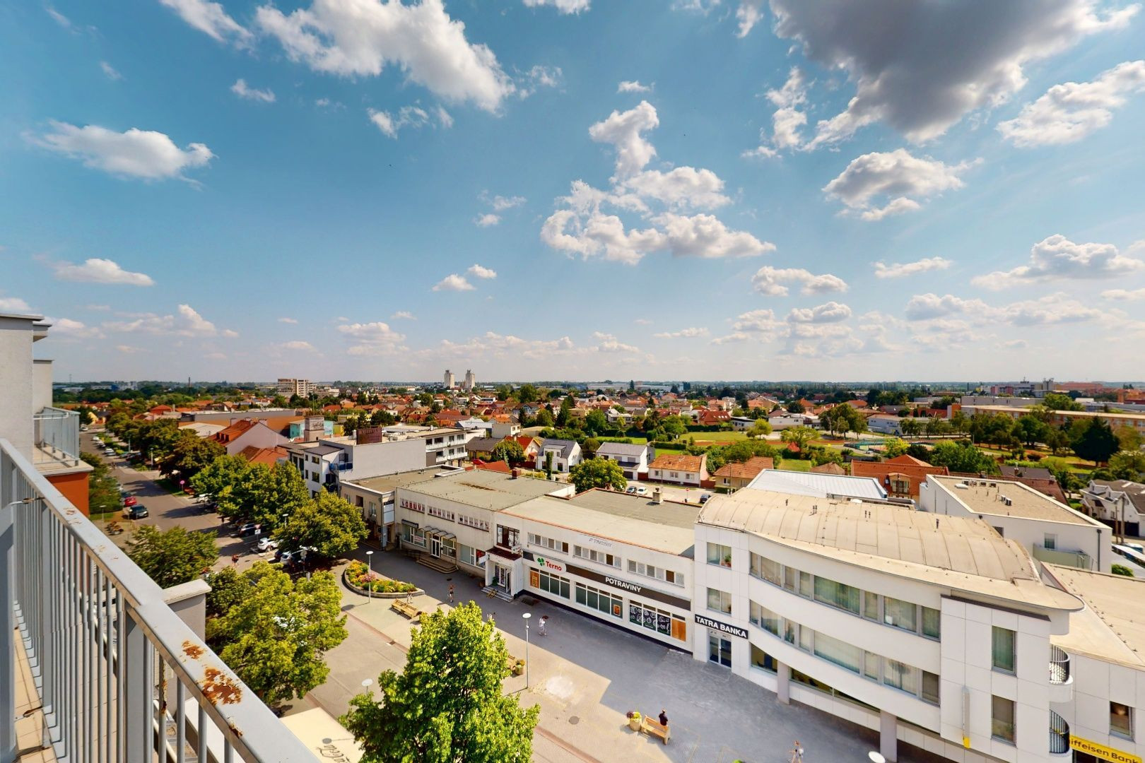 Byt má priestrannú vstupnú chodbu, obývaciu miestnosť prepojenú s kuchyňou a s prekrásnym výhľadom na Senec. Obývacia miestnosť má západnú orientáciu. Izby majú východnú orientáciu. Z obývacej miestnosti je východ na loggiu /9,10m2/. Dominantou bytu sú veľkometrážne okná v obývacej izbe. Kuchyňa má samostatnú špajzu, je plne vybavená spotrebičmi a má elegantnú pracovnú dosku z umelého kameňa.
