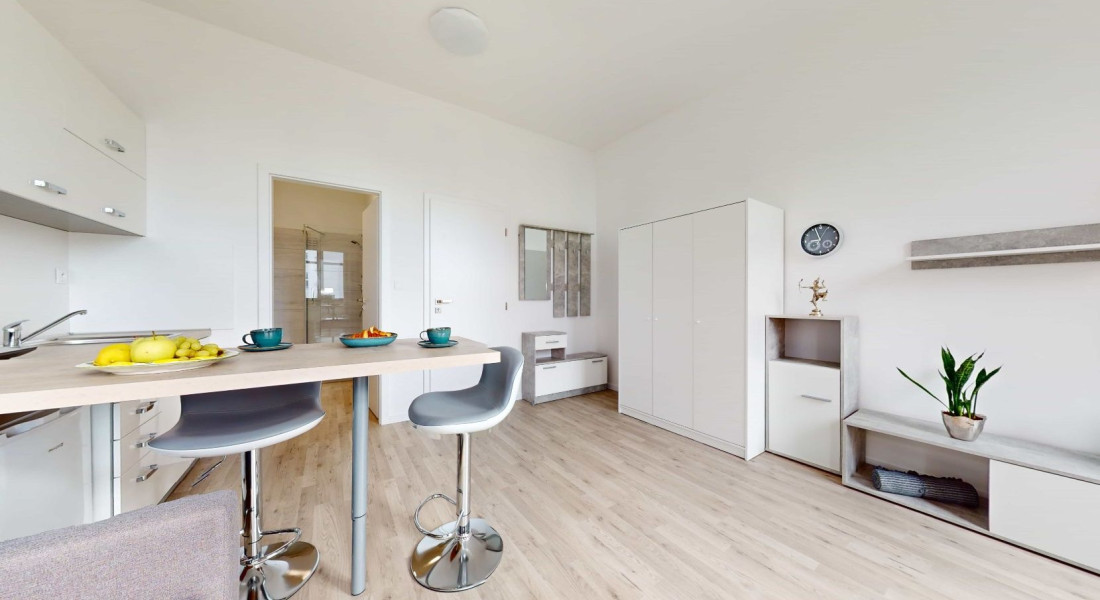 Pozostáva z izby spojenej s kuchynskou časťou + kúpeľňa vybavená WC a sprchovým kútom a práčkou.