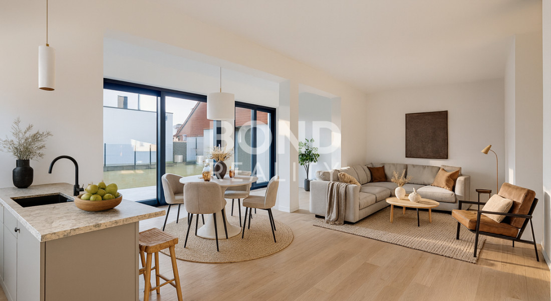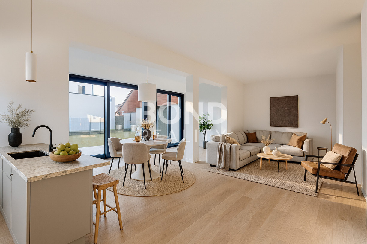 • Prízemie: Vstupná chodba, toaleta pre hostí, práčovňa, kuchyňa s jedálňou a obývačkou s výstupom na terasu a do záhrady, hlavná spáľňa s vlastnou kúpeľňou a walk-in šatníkom.