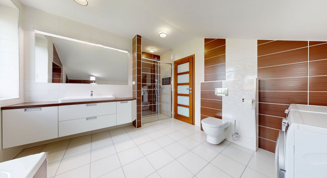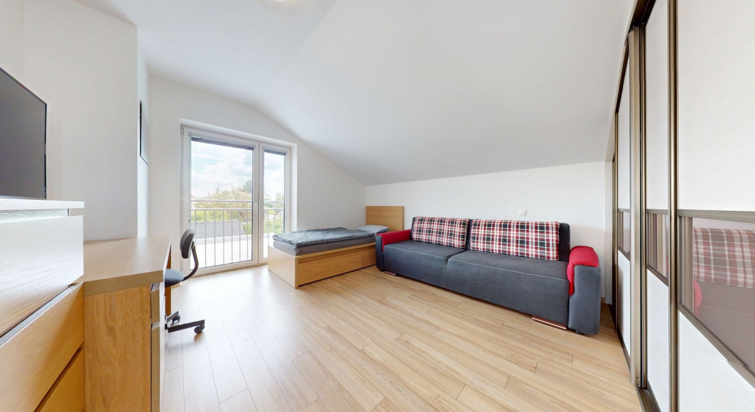Prízemie: obývačka spojená s kuchyňou a zimnou záhradou, krb, izba na prízemí, wc, kúpeľňa, šatník, predsieň. Poschodie: 3x spálňa, pracovňa, kúpeľňa s wc.