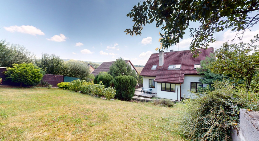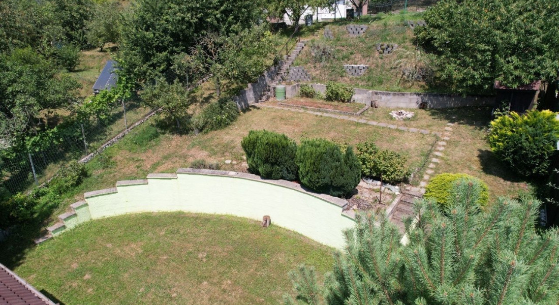 Terasovitý pozemok s výmerou 800 m2 je upravený, celý oplotený, udržiavaný, vysadený ovocnými stromami a kríkmi.