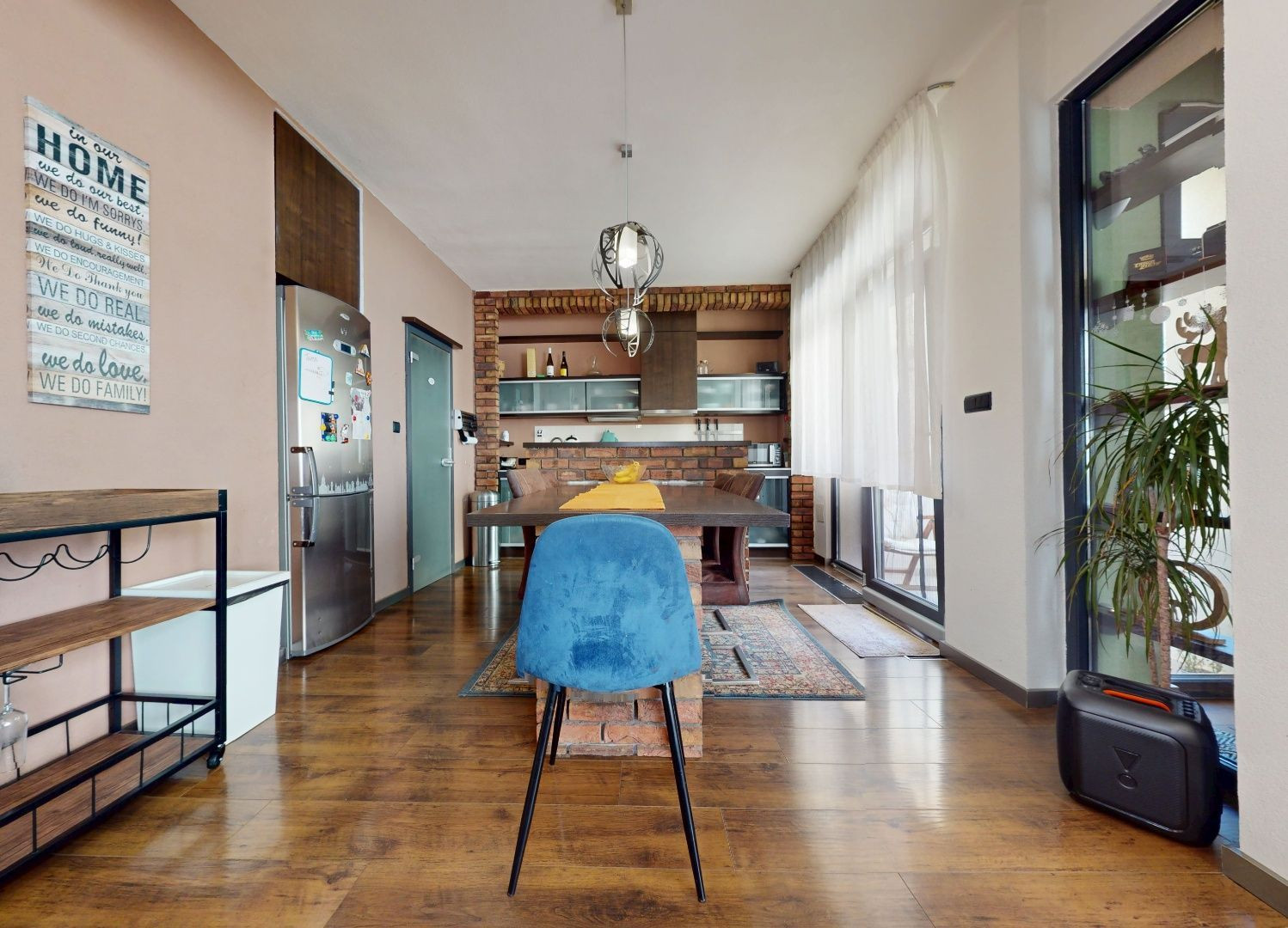 Vstupom do bytu prechádzame do dennej zóny, kde sa nachádza obývacia časť, šatník, jedálenská časť a kuchynská časť. Z kuchynskej časti je vstup na loggiu a malú študovňu. Z tohto priestoru prechádzame chodbou do zadnej časti bytu, kde sa nachádza toaleta, kúpeľňa, detská izba, spálňa so šatníkom, malá sauna a vstup na balkón.