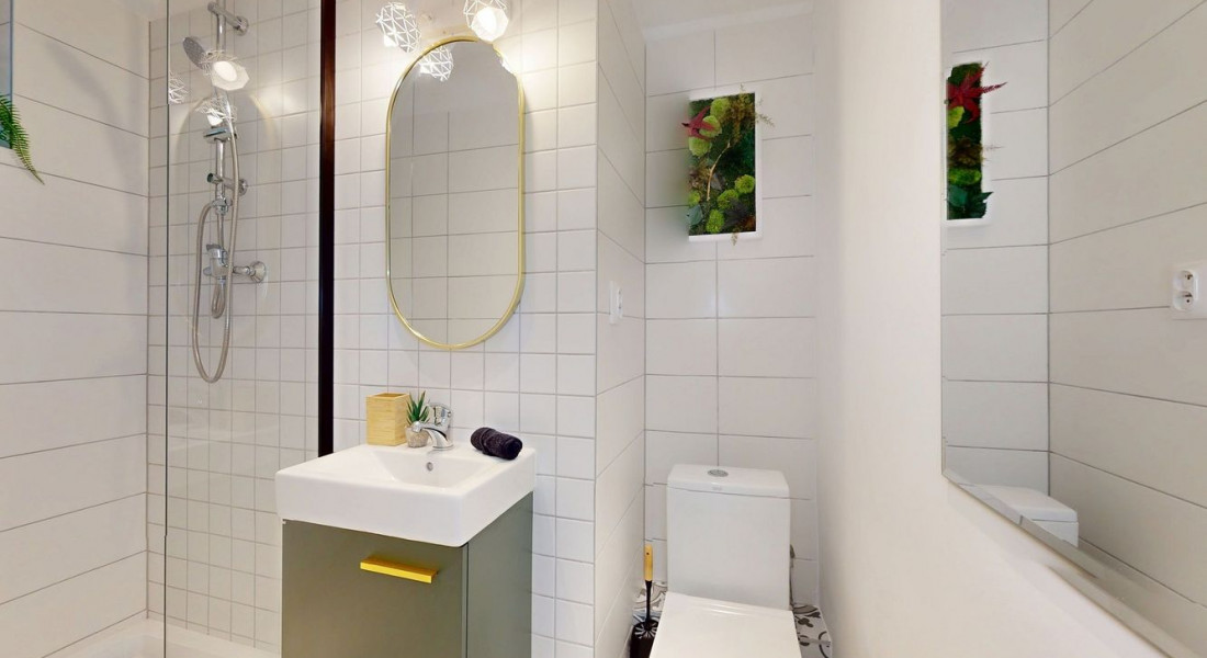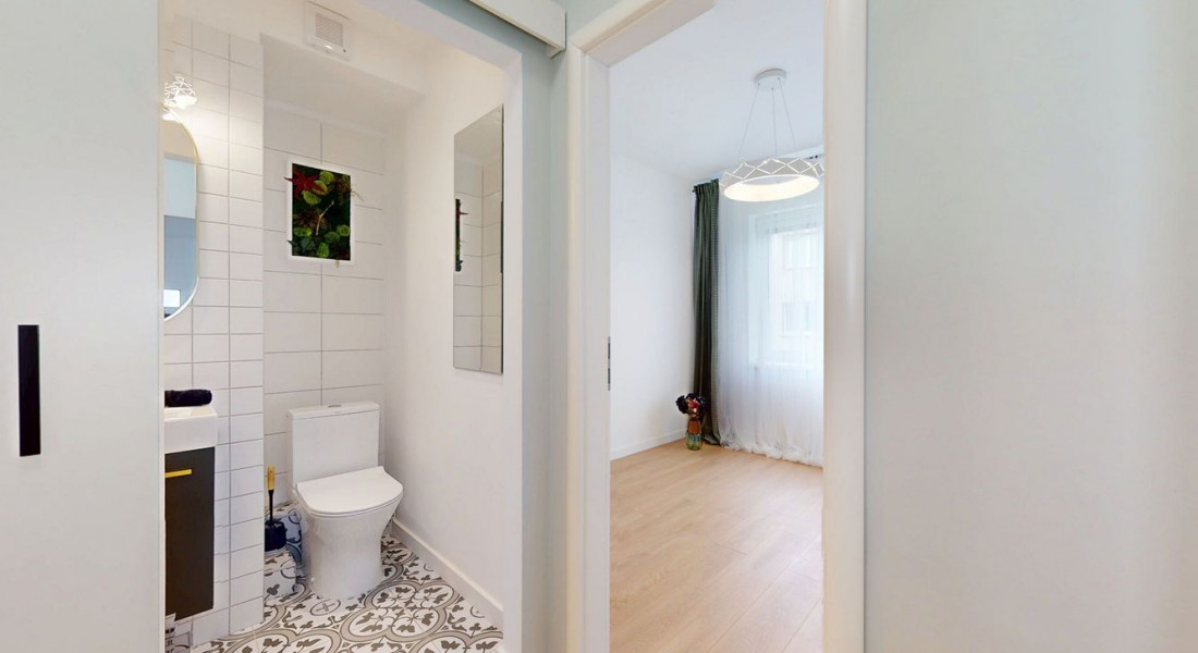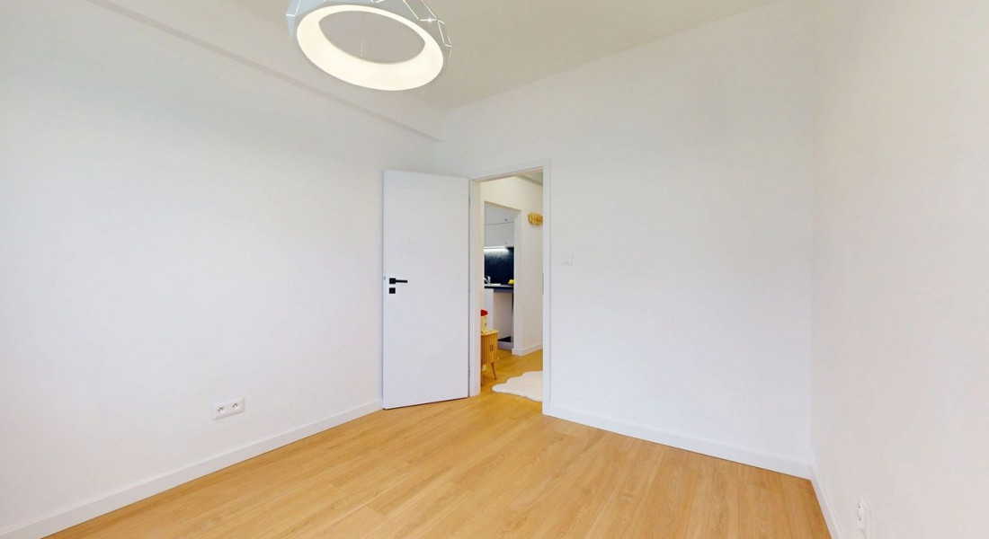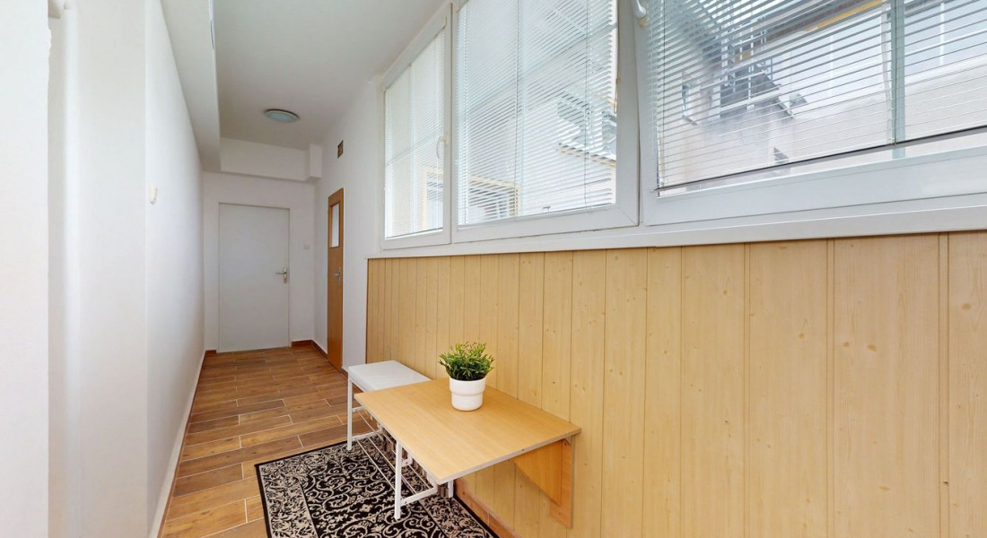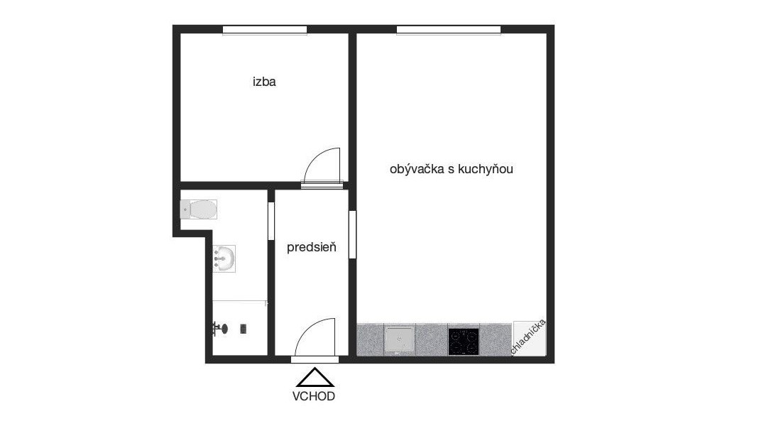 Dispozícia bytu: vstupná chodba, veľká obývacia izba s kuchynským kútom, spálňa, kúpeľňa so sprchovým kútom s WC a okienkom na vetranie. V komore prislúchajúcej k bytu je umiestnený plynový kotol a práčka.