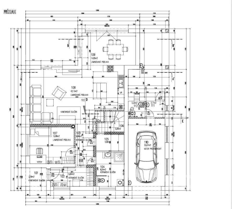 Na prízemí sa nachádza praktické závetrie, vstupná predsieň, chodba so schodiskom, kúpeľňa, špajza a hosťovská izba. Dominantou je otvorená obývacia izba s krbom, ktorá sa prepája s modernou kuchyňou a jedálňou s príjemným výhľadom do záhrady.