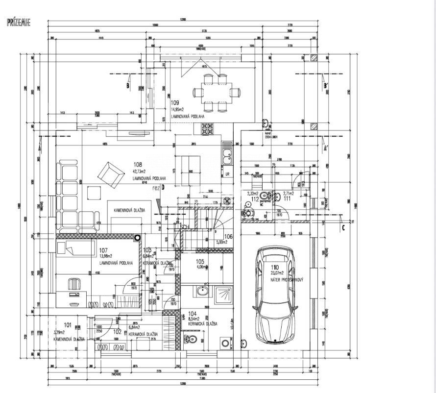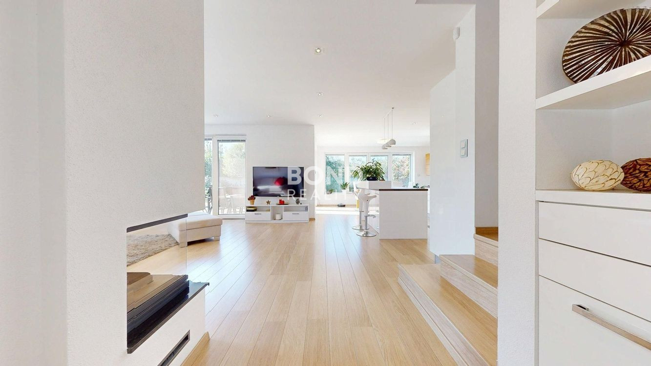 Na prízemí sa nachádza praktické závetrie, vstupná predsieň, chodba so schodiskom, kúpeľňa, špajza a hosťovská izba. Dominantou je otvorená obývacia izba s krbom, ktorá sa prepája s modernou kuchyňou a jedálňou s príjemným výhľadom do záhrady.