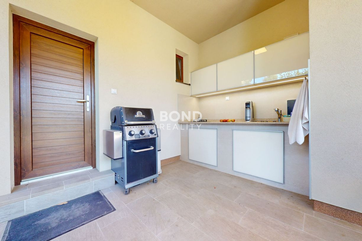 Komfort bývania dopĺňa terasa a vonkajšia prestrešená letná kuchyňa so sedením. Záhrada je vybavená automatickou závlahou a vlastnou studňou.