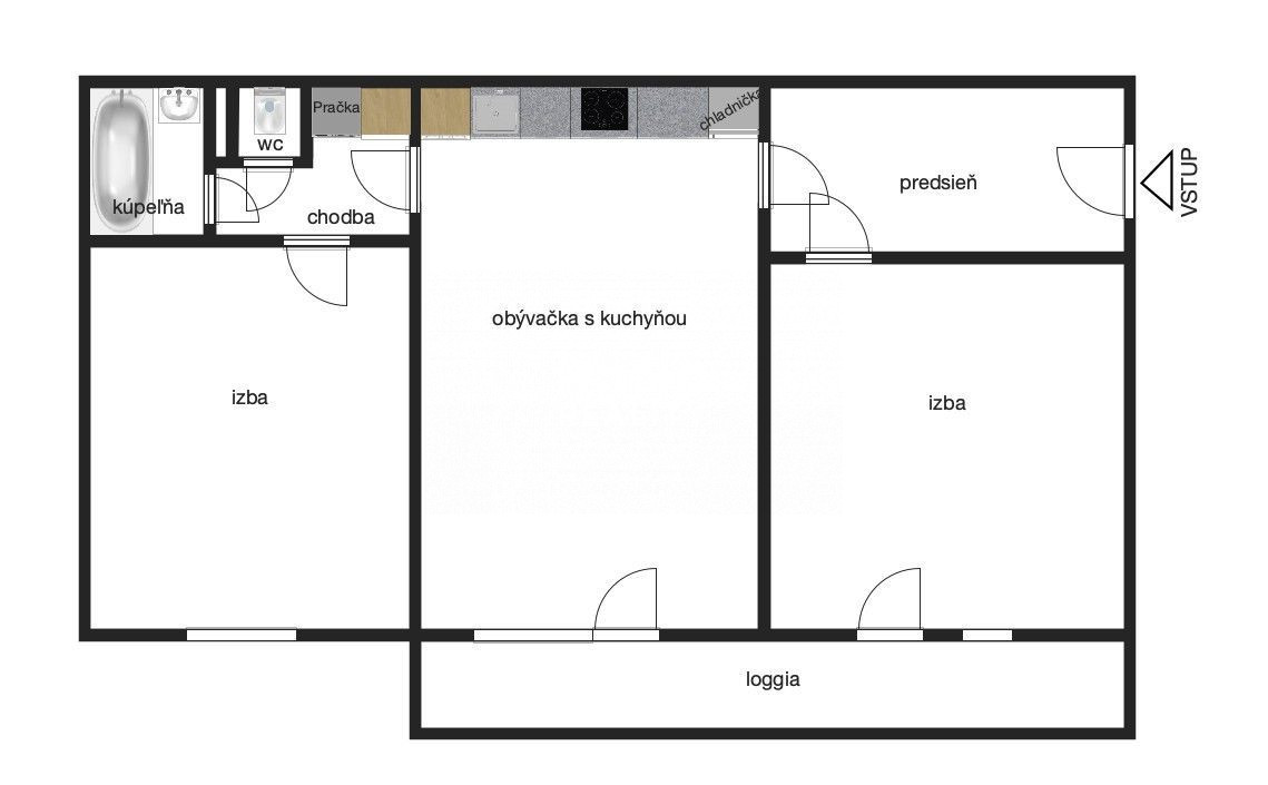 Byt je dobre dispozične riešený, pozostáva zo vstupnej predsiene, samostatnej izby s výstupom na balkón, kuchyne s otvorenou dispozíciou do obývačky (21,6 m²) s výstupom na balkón, samostatnej spálne, kúpeľne, samostatného WC a murovanej pivnice na poschodí (1,26 m²).