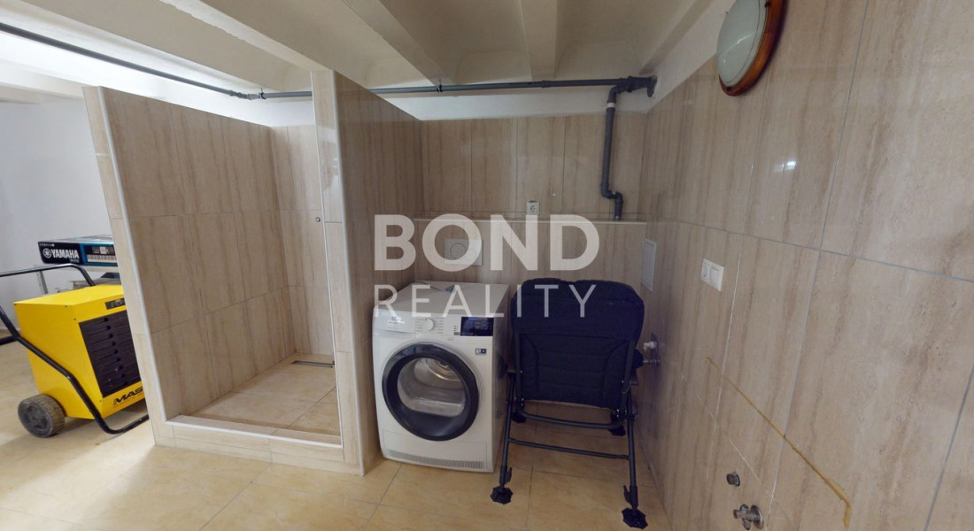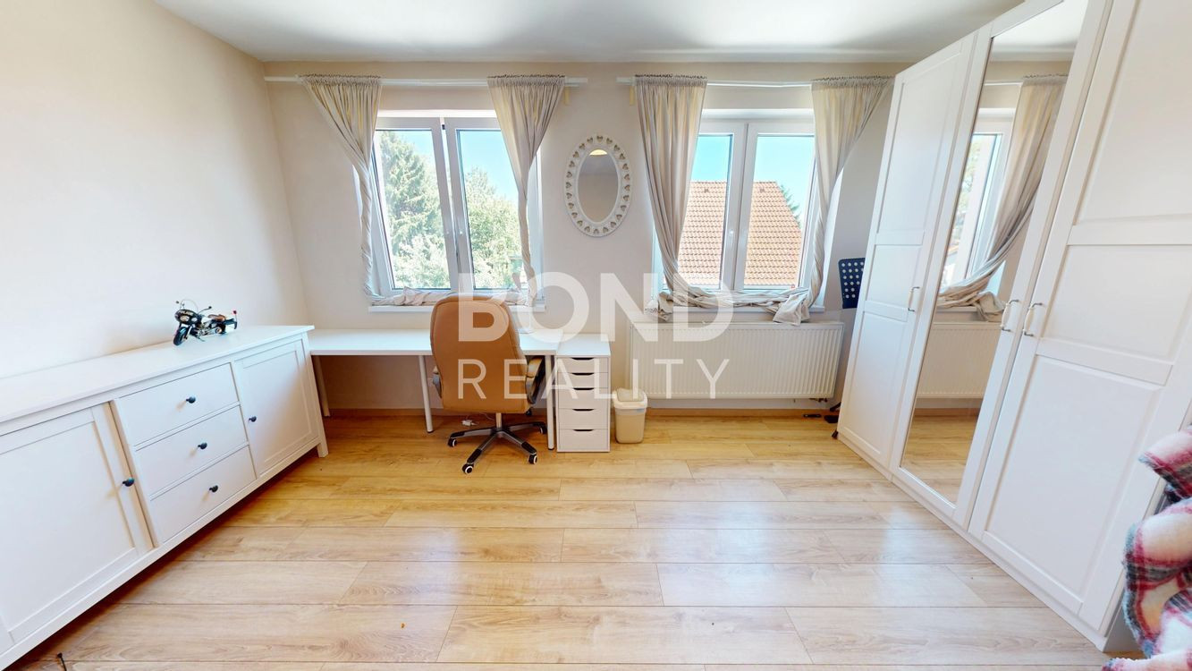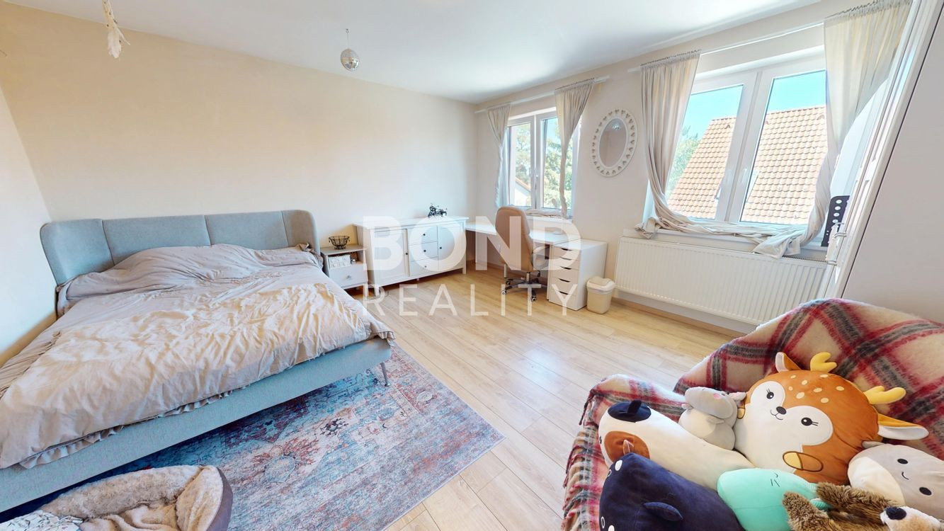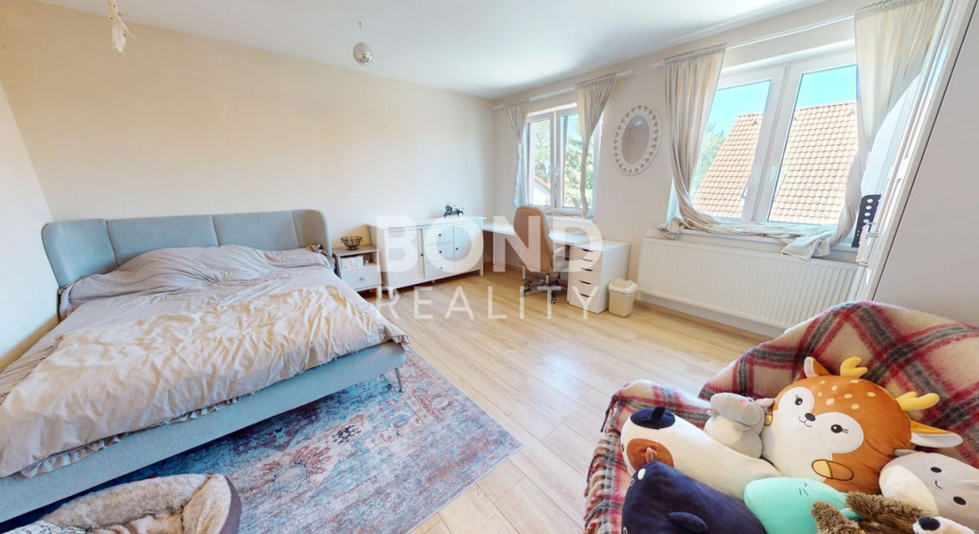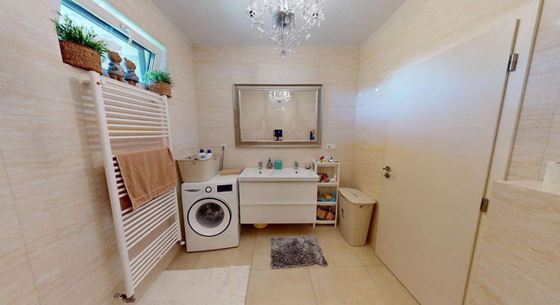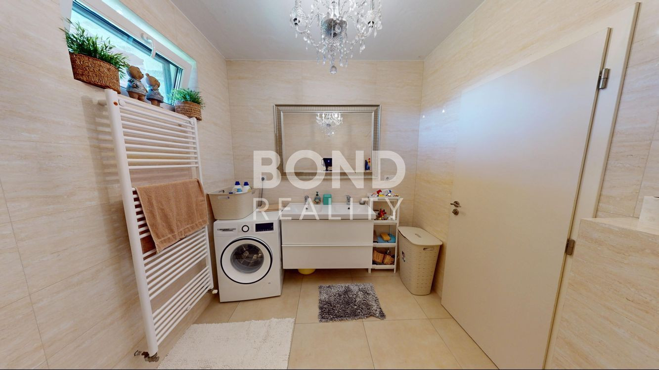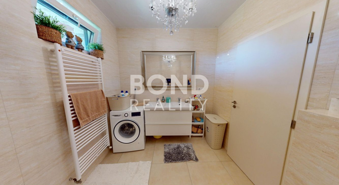 Na poschodí sú tri priestranné spálne a druhá kúpeľňa s vaňou, dvojumývadlom a toaletou. V pivnici nájdete technickú miestnosť, práčovňu a ďalšiu sprchu – praktické riešenie pre každodenný komfort.