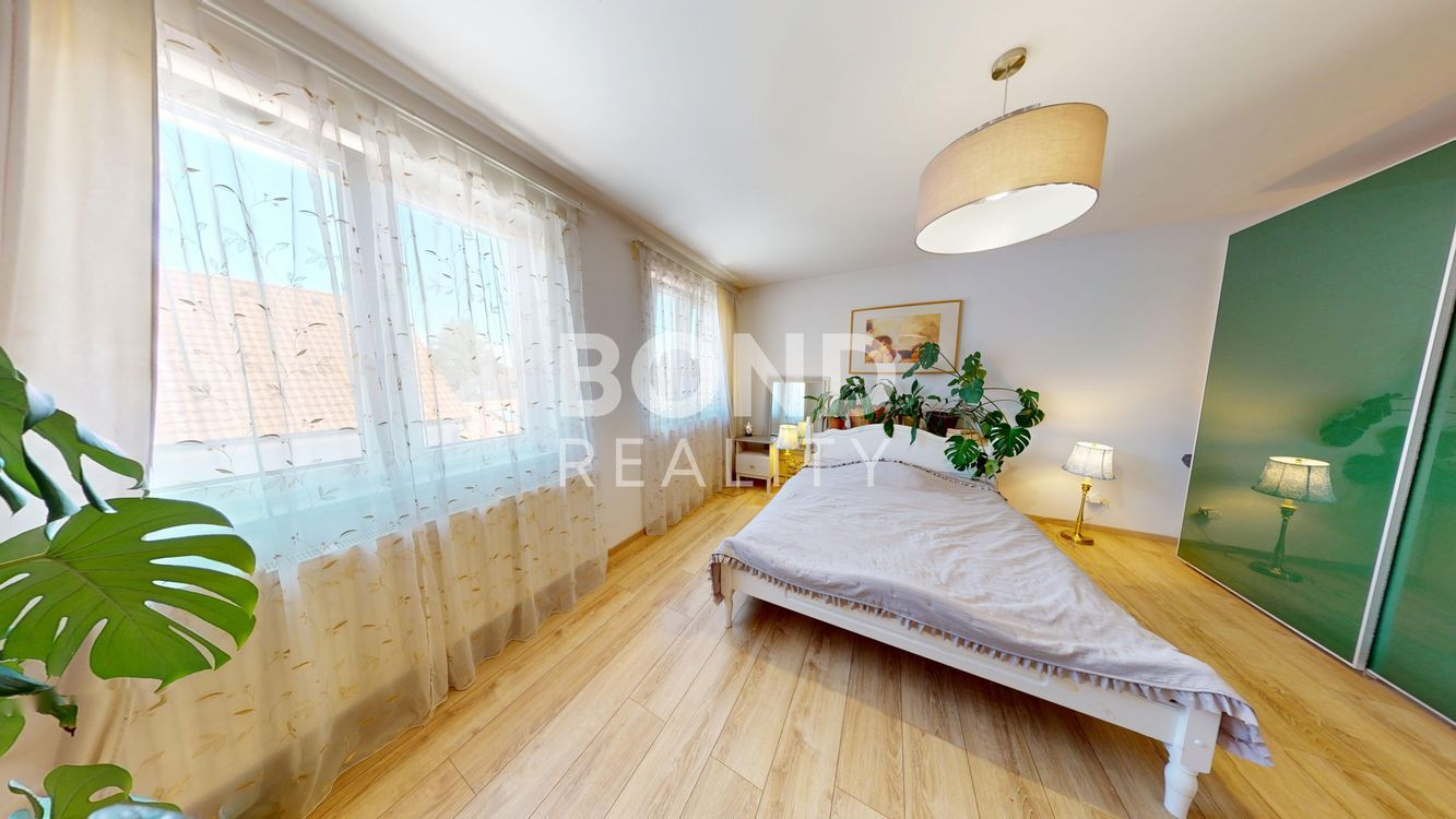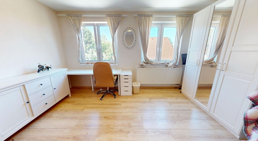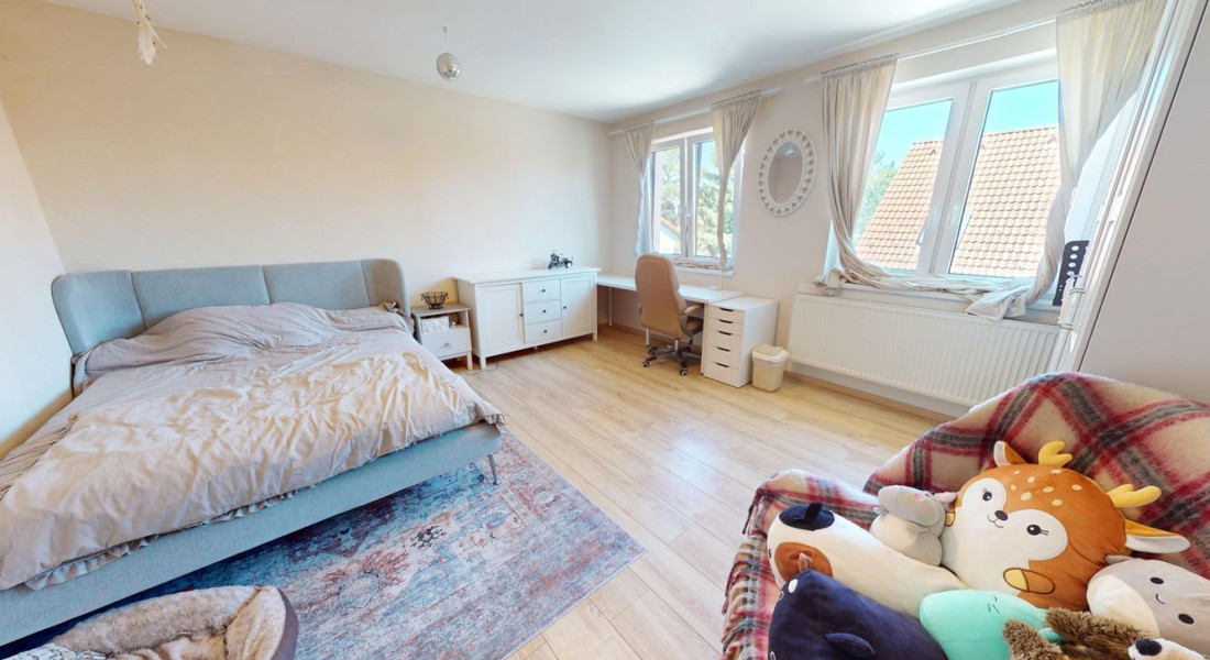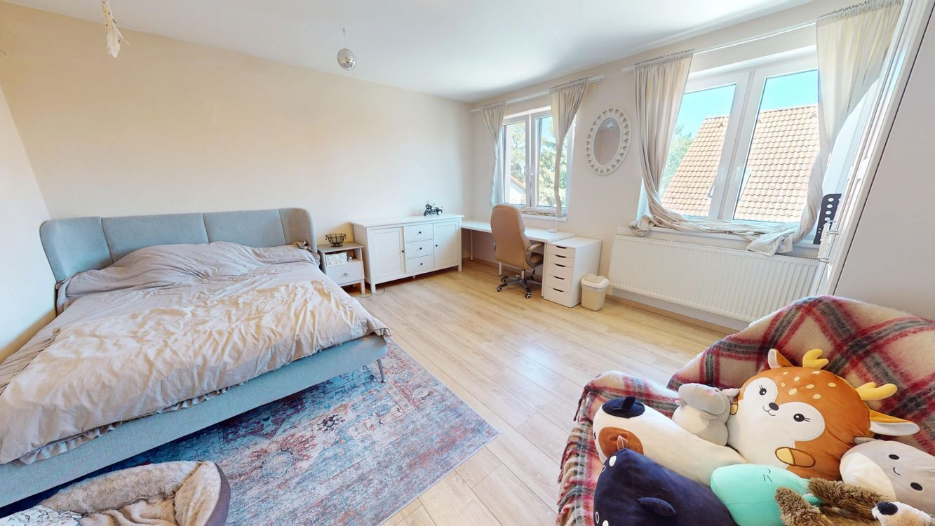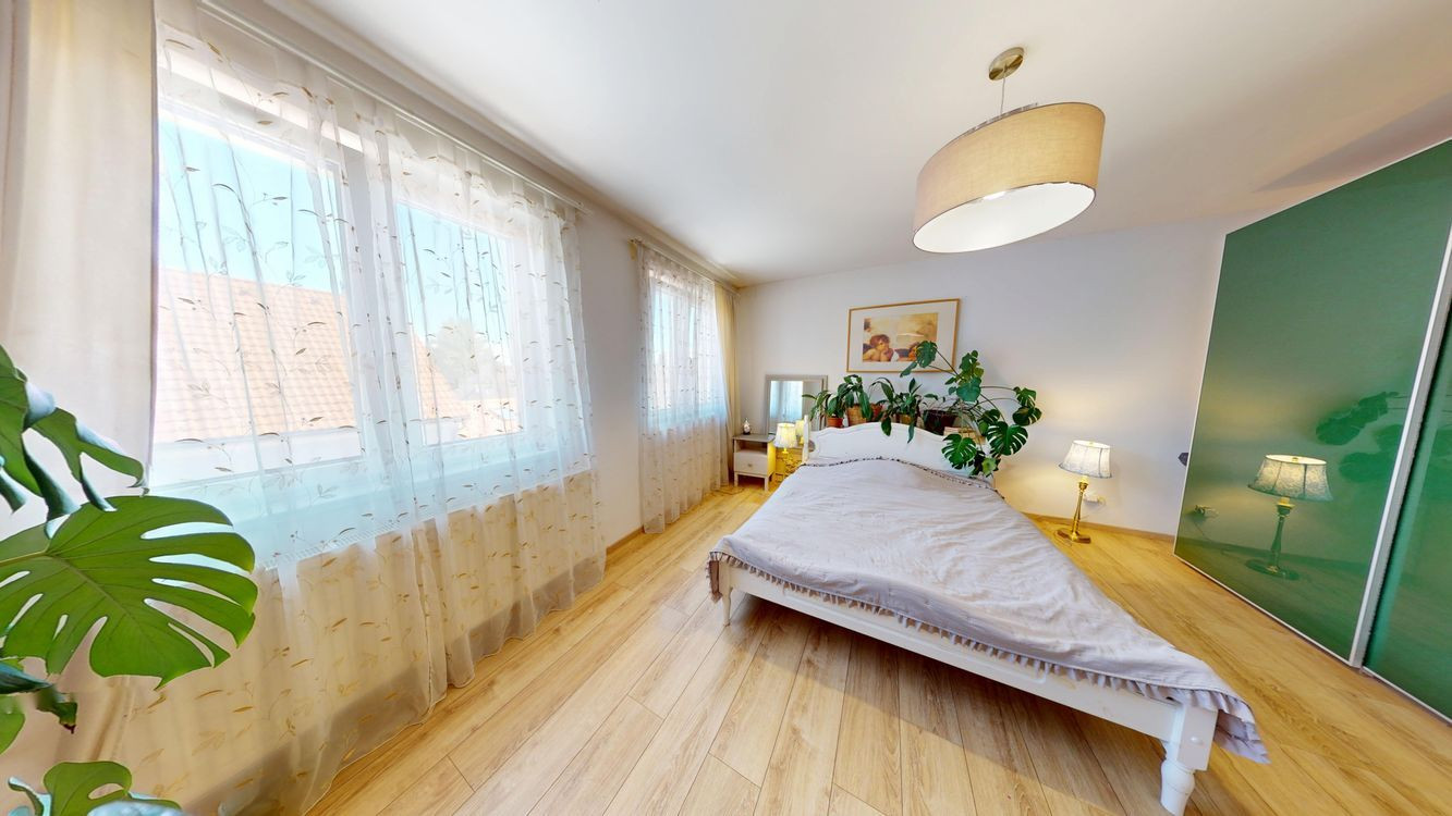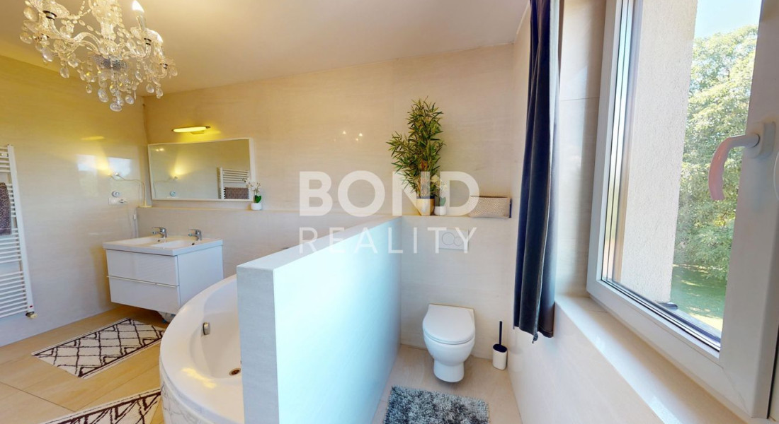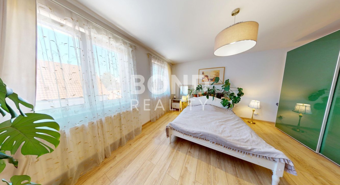 Na poschodí sú tri priestranné spálne a druhá kúpeľňa s vaňou, dvojumývadlom a toaletou. V pivnici nájdete technickú miestnosť, práčovňu a ďalšiu sprchu – praktické riešenie pre každodenný komfort.
