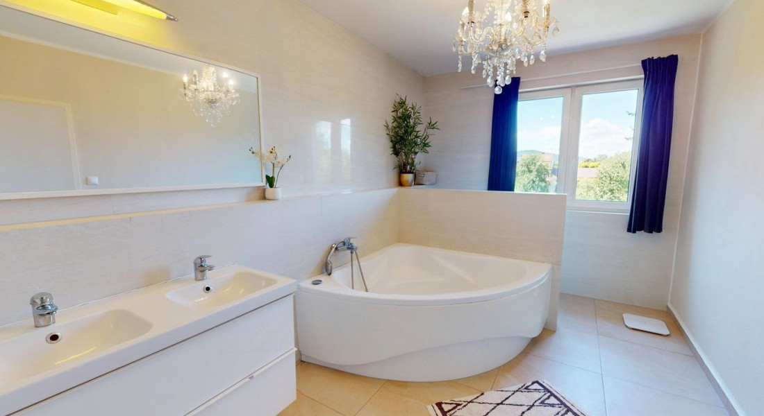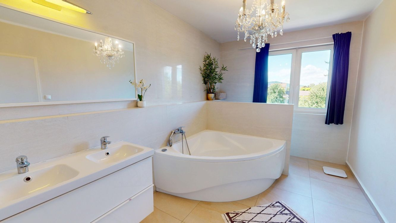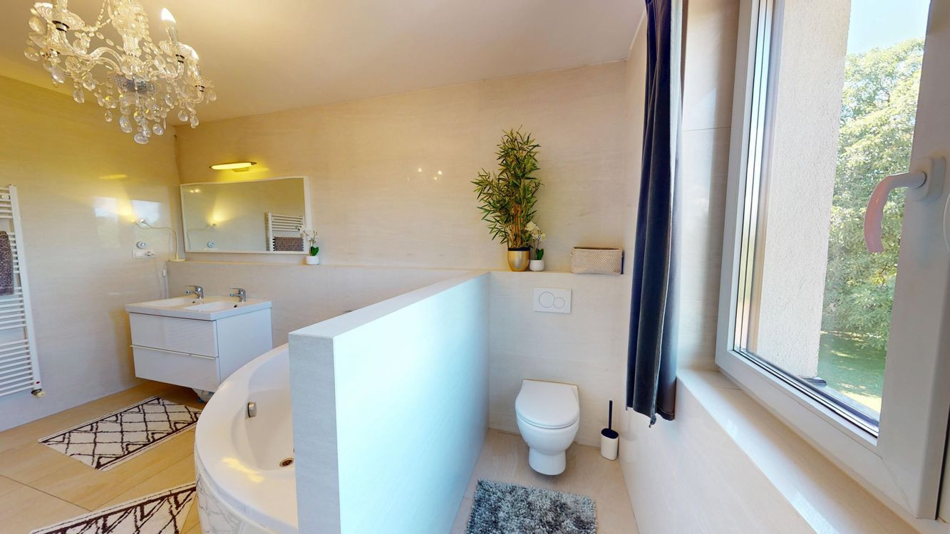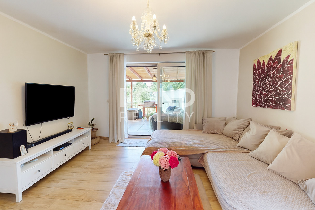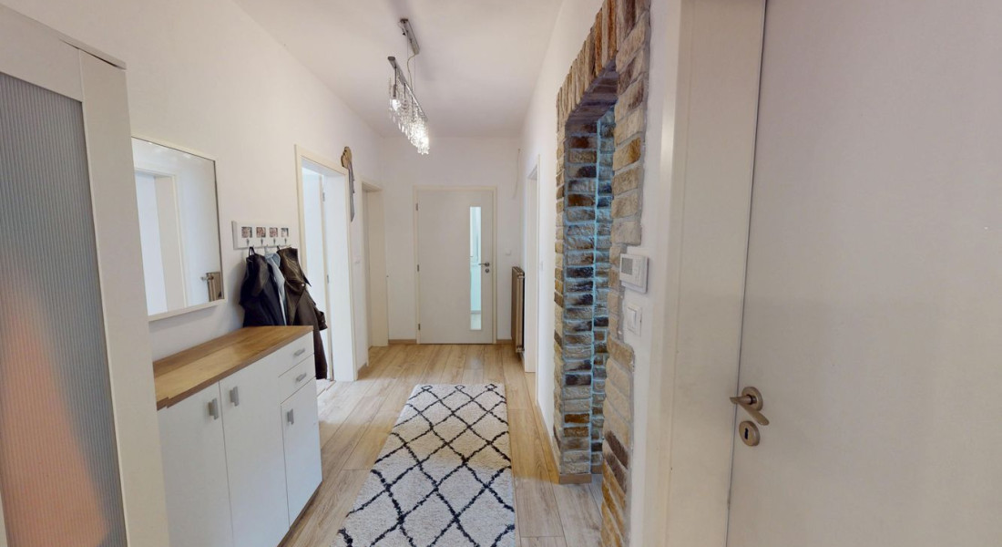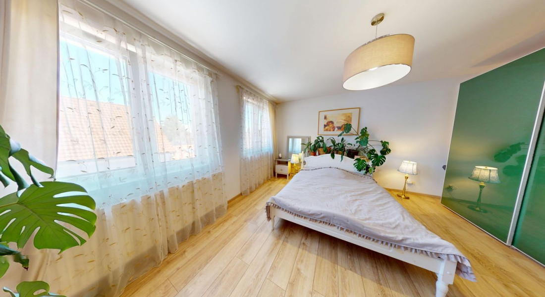 Na poschodí sú tri priestranné spálne a druhá kúpeľňa s vaňou, dvojumývadlom a toaletou. V pivnici nájdete technickú miestnosť, práčovňu a ďalšiu sprchu – praktické riešenie pre každodenný komfort.