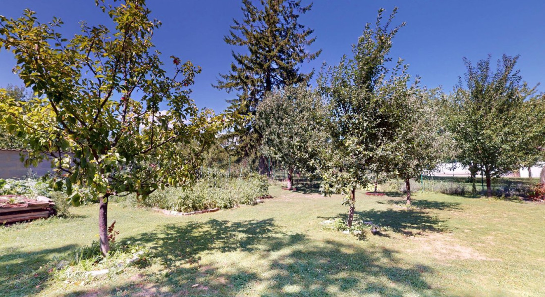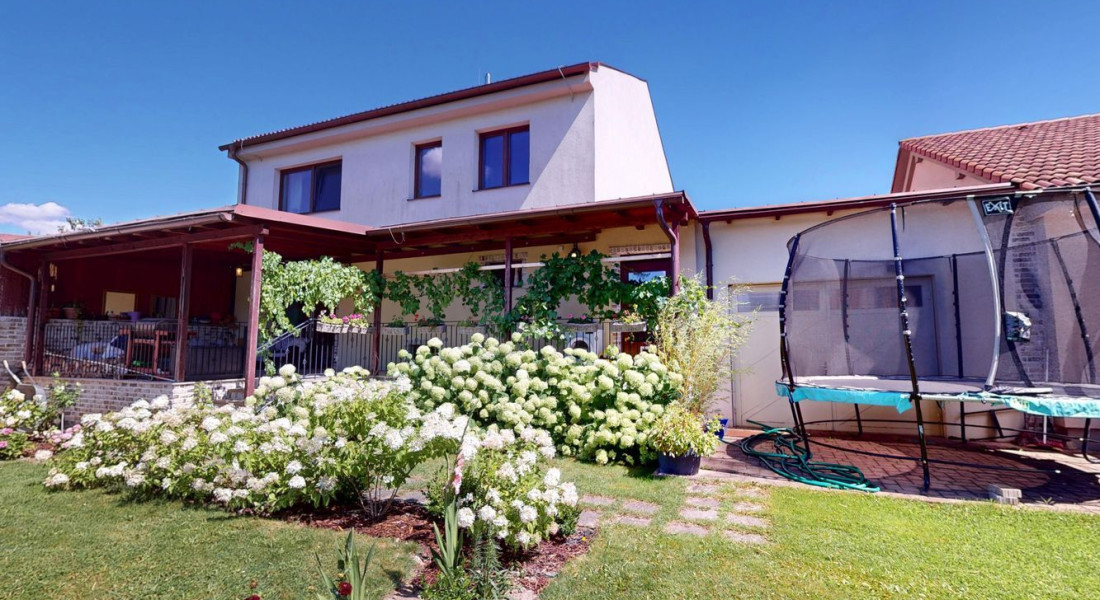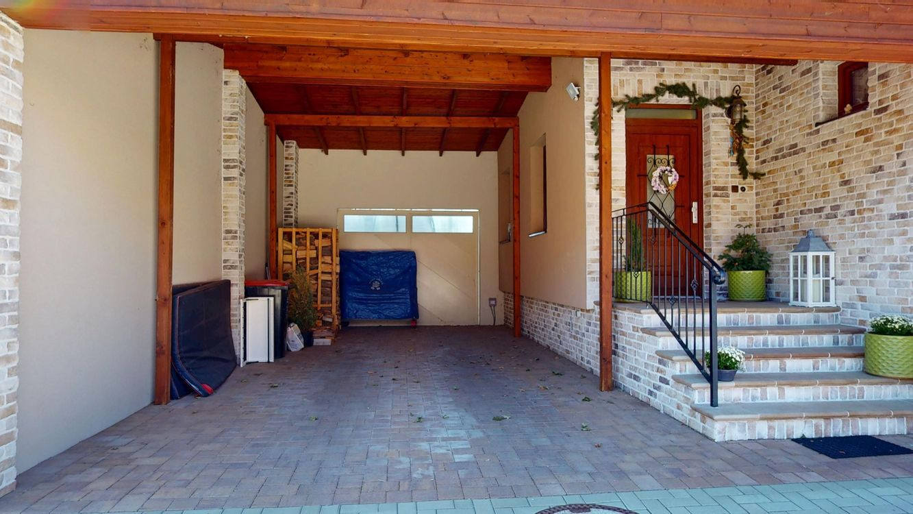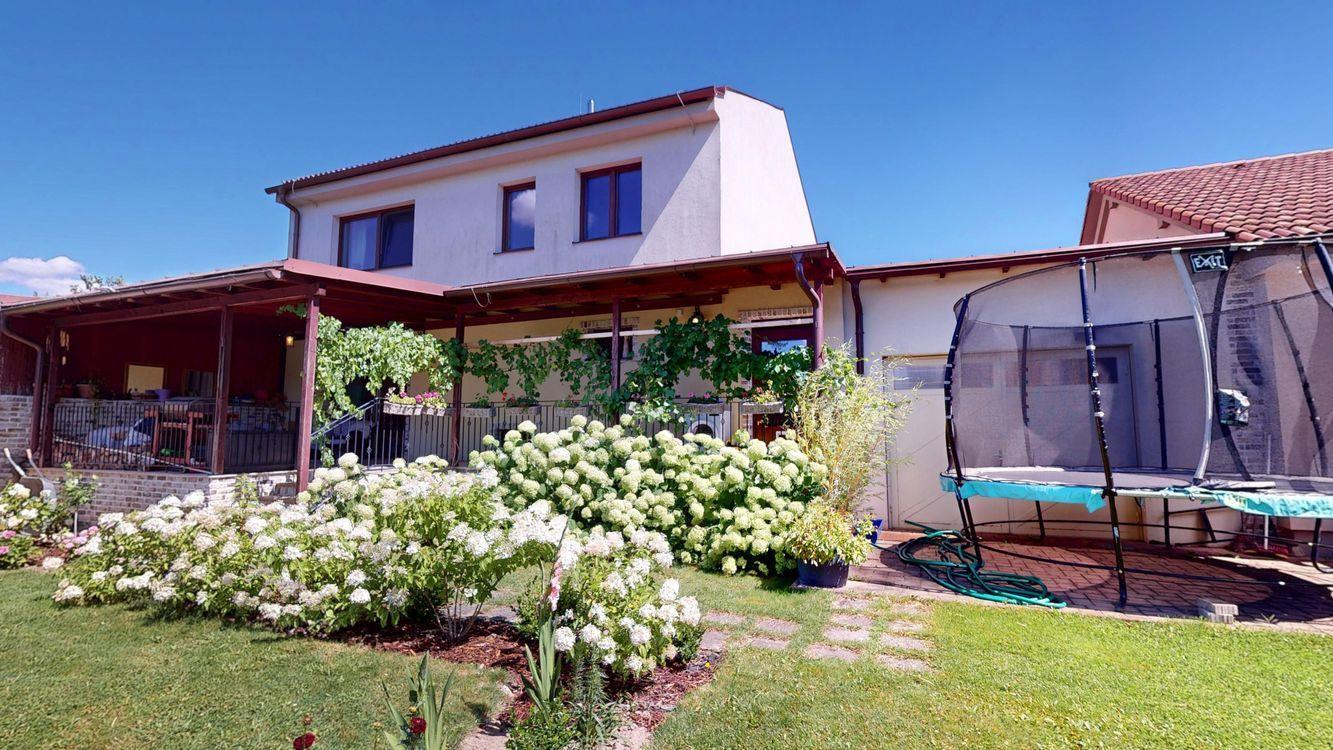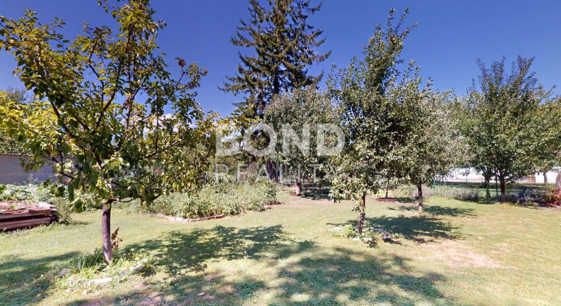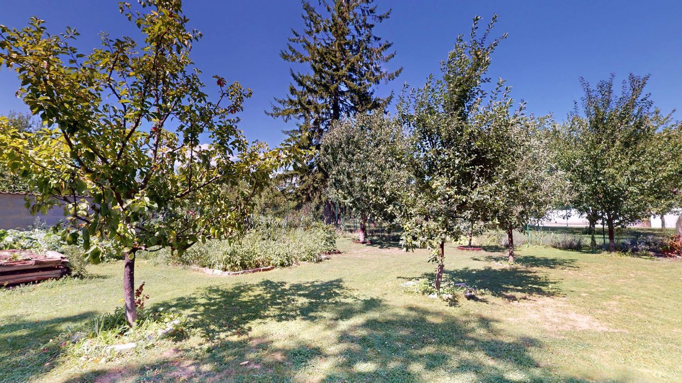 Záhrada ponúka dostatok priestoru na oddych i záhradkárčenie, rastú tu ovocné stromy a nachádza sa tu aj murovaná záhradná chatka. K domu patrí priestranný prístrešok na parkovanie s rozlohou približne 44 m², vhodný aj pre obytný príves.
