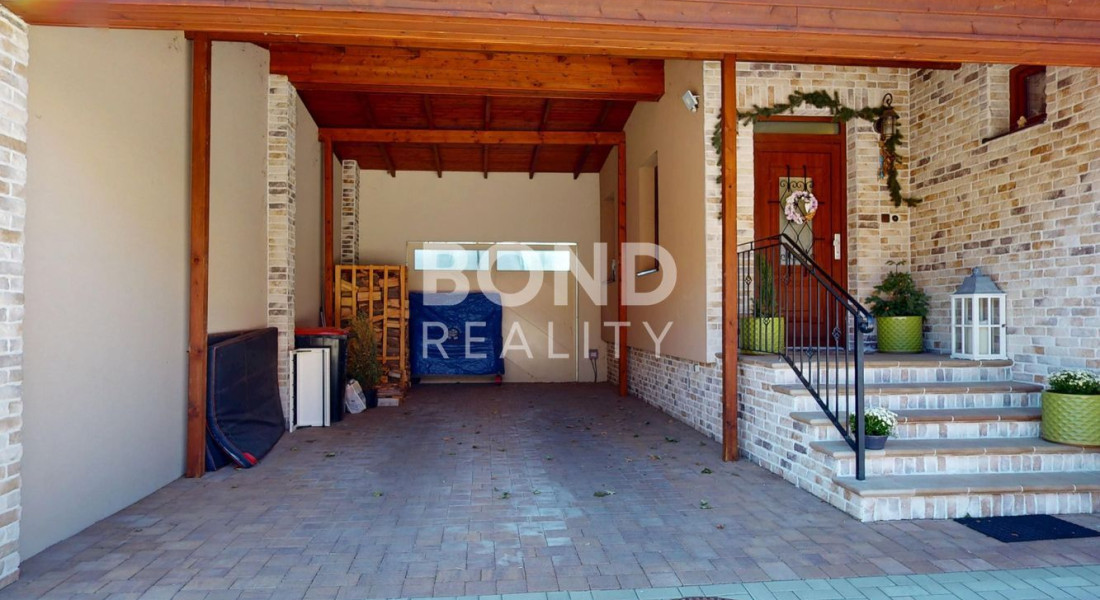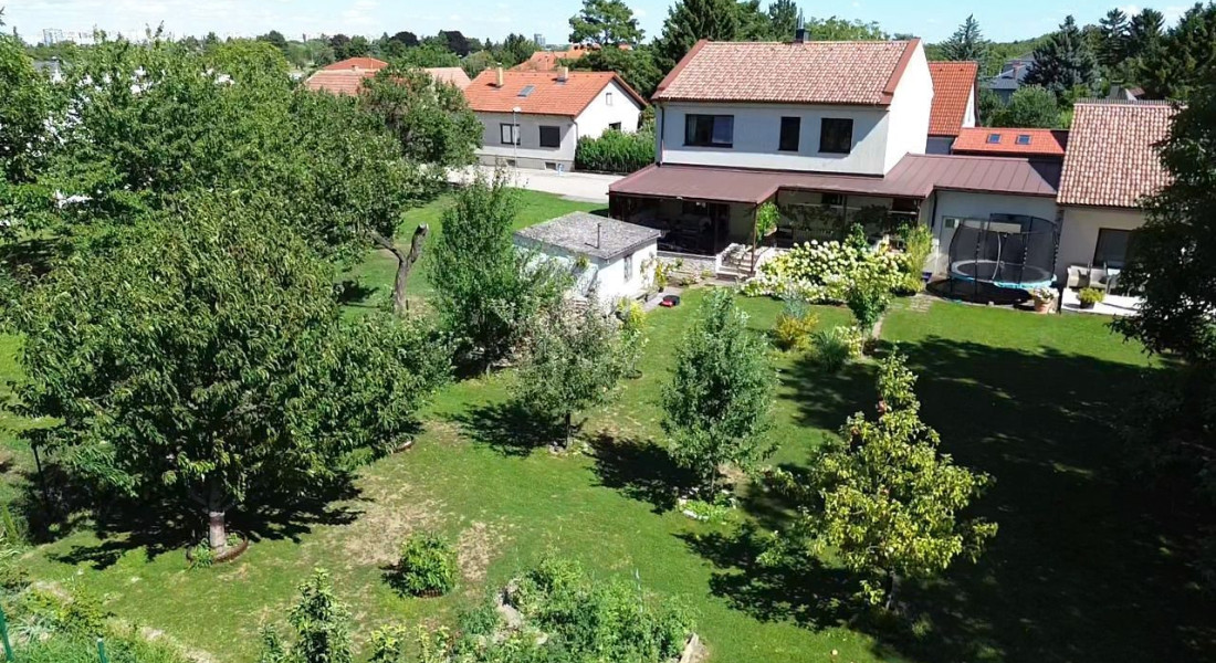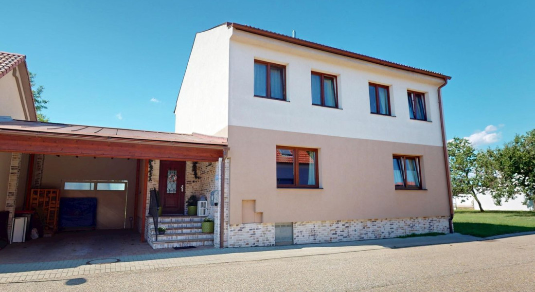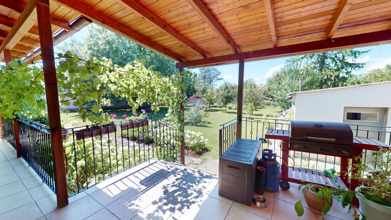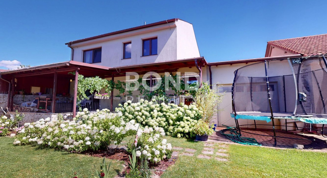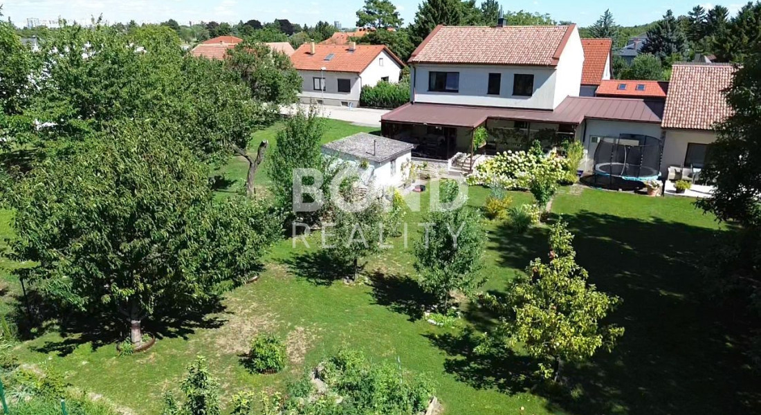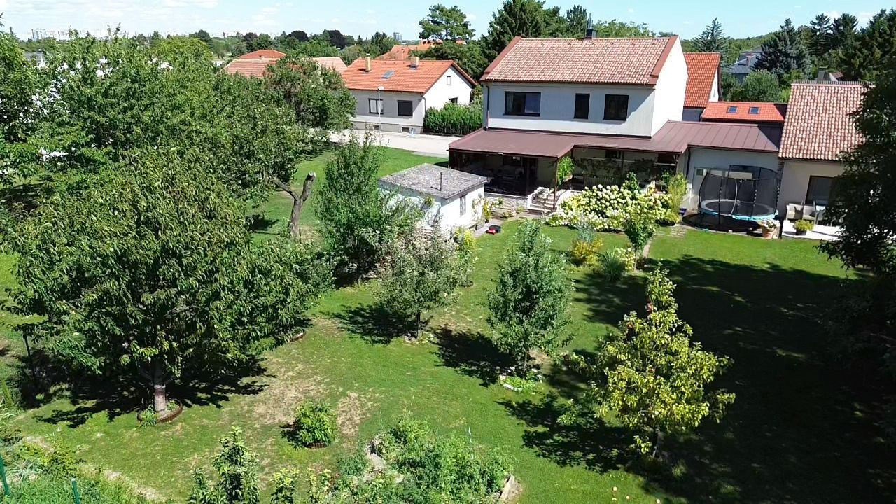 Záhrada ponúka dostatok priestoru na oddych i záhradkárčenie, rastú tu ovocné stromy a nachádza sa tu aj murovaná záhradná chatka. K domu patrí priestranný prístrešok na parkovanie s rozlohou približne 44 m², vhodný aj pre obytný príves.
