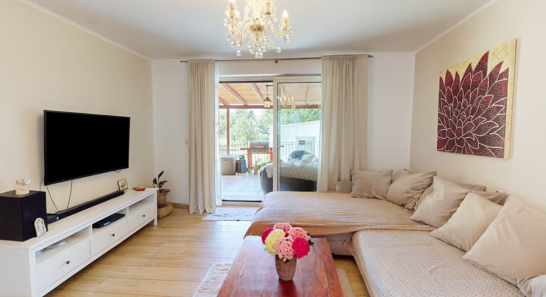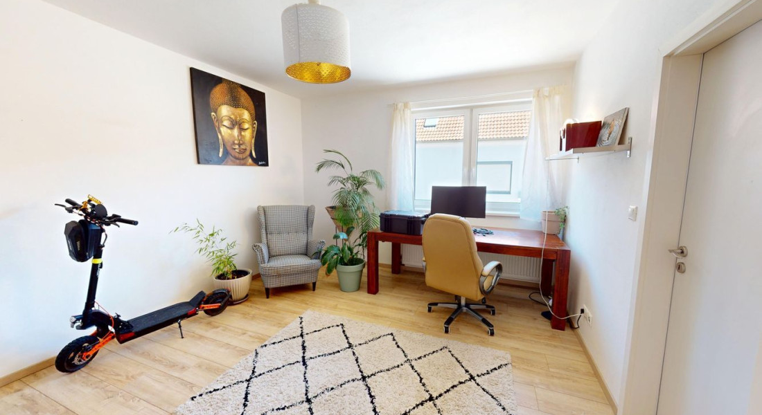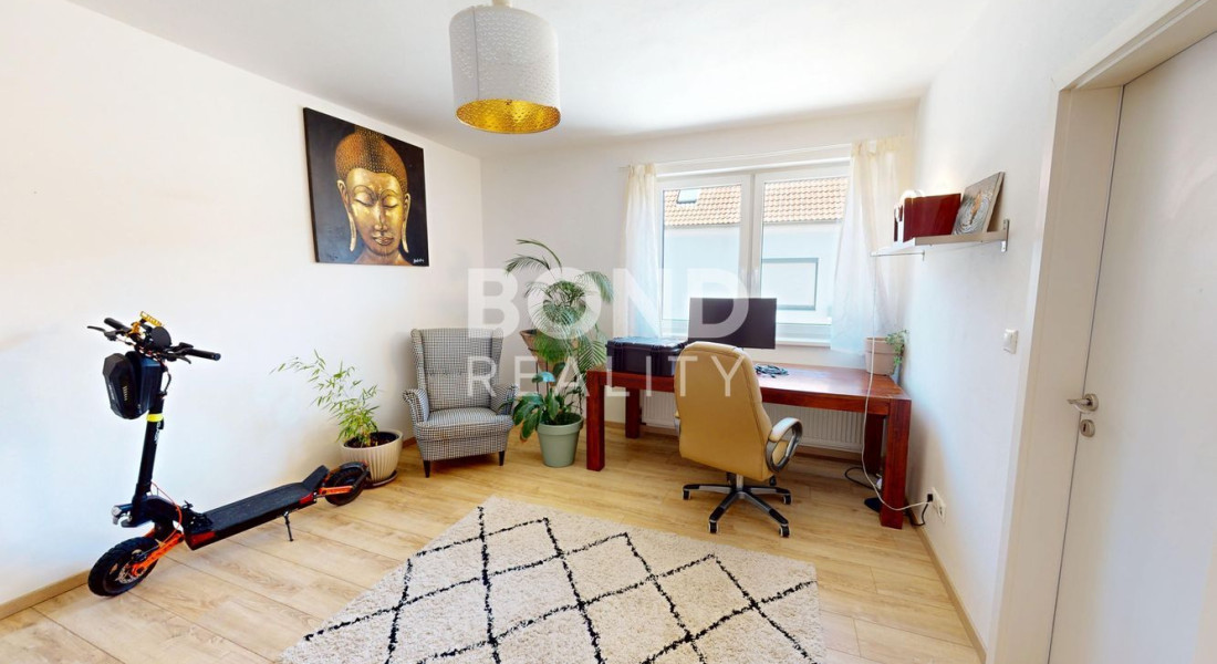 V interiéri vás zaujme priestranná a slnečná obývacia izba prepojená s modernou kuchyňou. Na prízemí sa ďalej nachádza izba vhodná ako spálňa alebo pracovňa, kúpeľňa so sprchou, dvojitým umývadlom a toaletou, ako aj ďalšie úložné priestory.