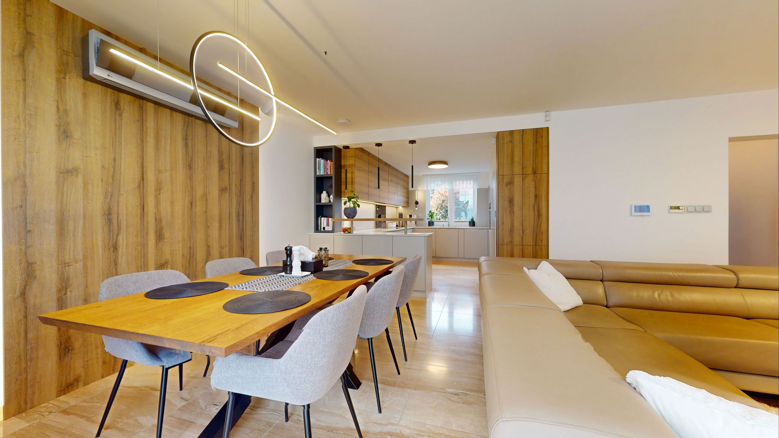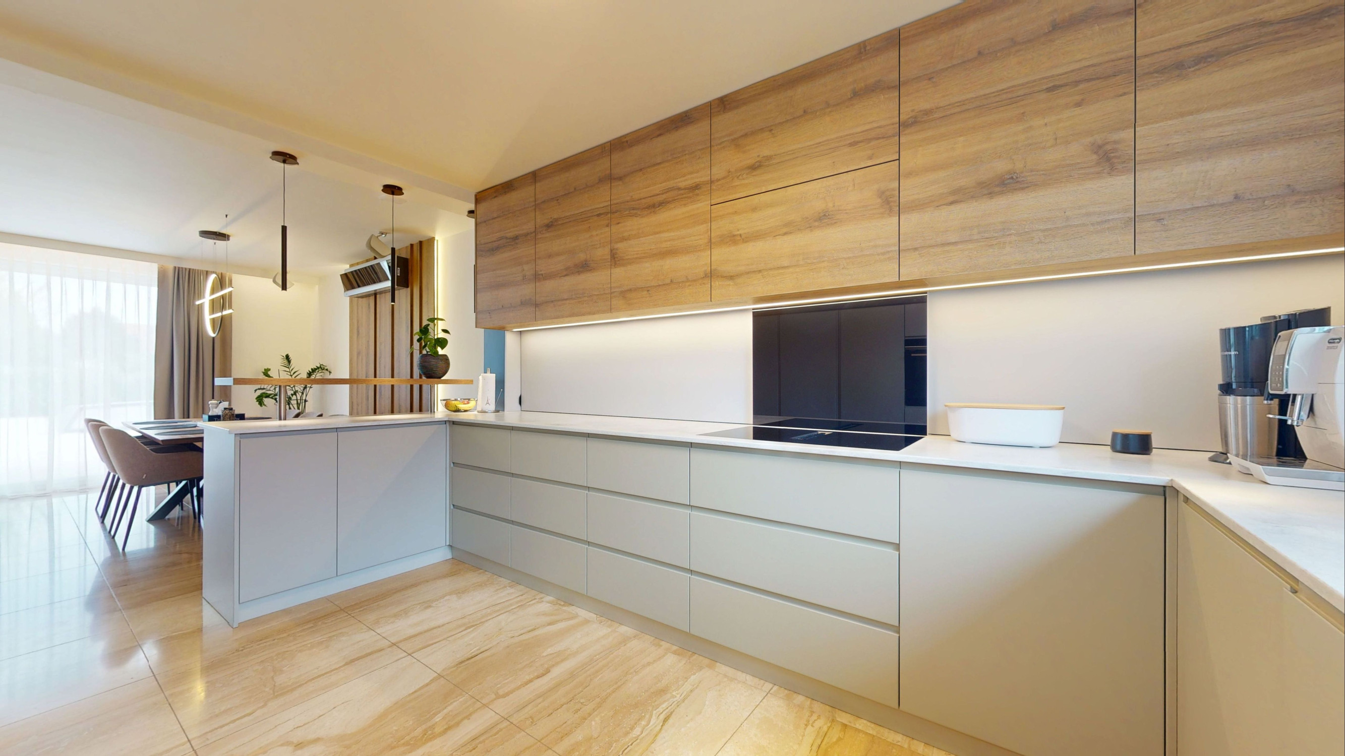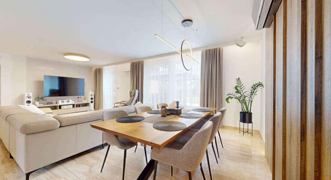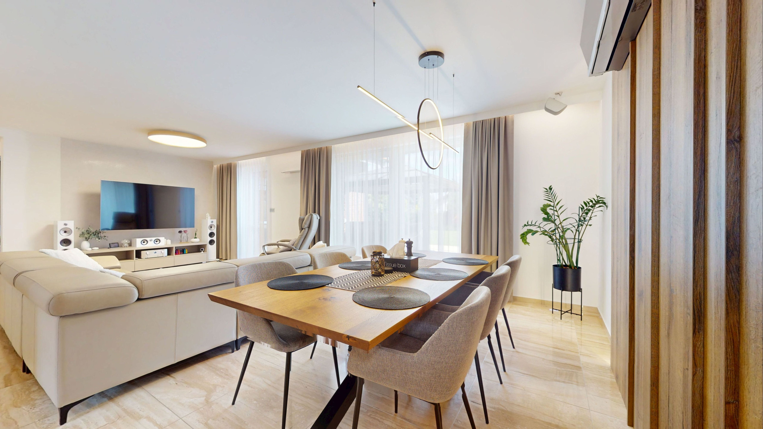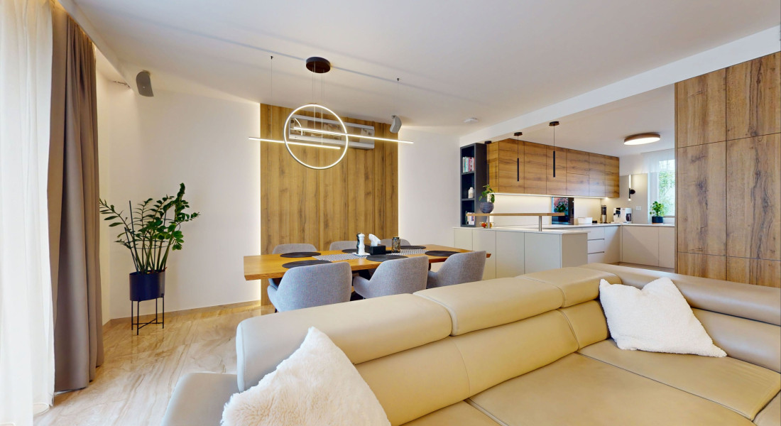 Prízemie — denná časť: priestranná obývačka prepojená s jedálňou a dizajnovou kuchyňou na mieru, samostatný šatník, hosťovská kúpeľňa, vstupná hala.