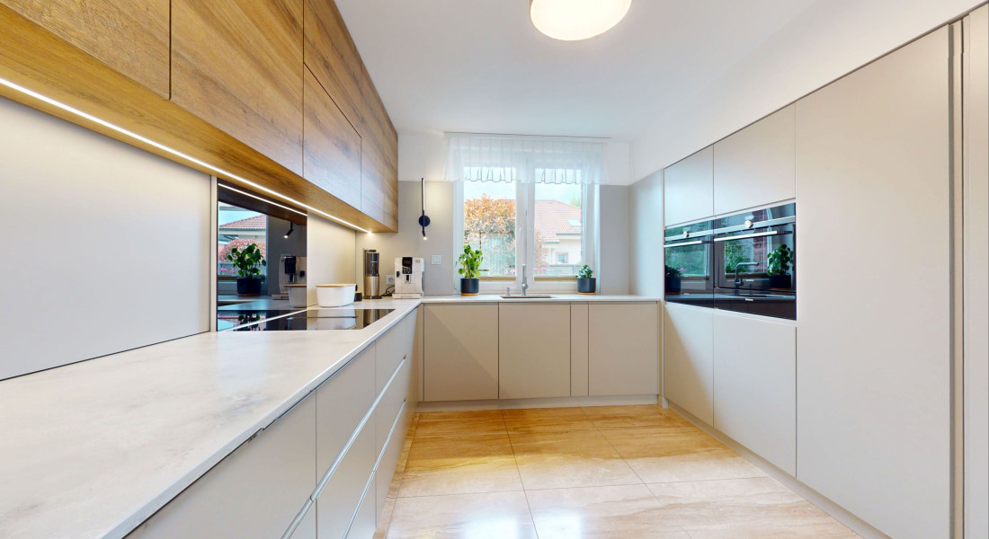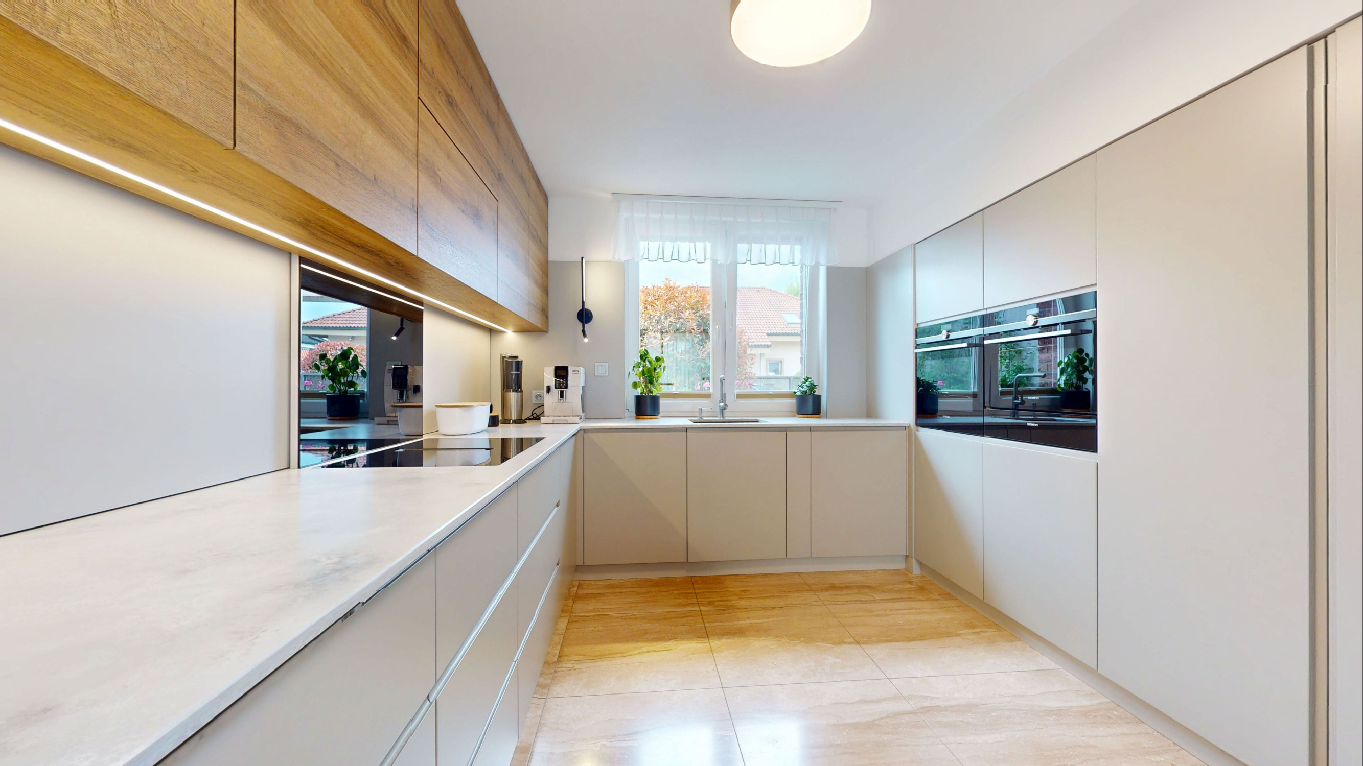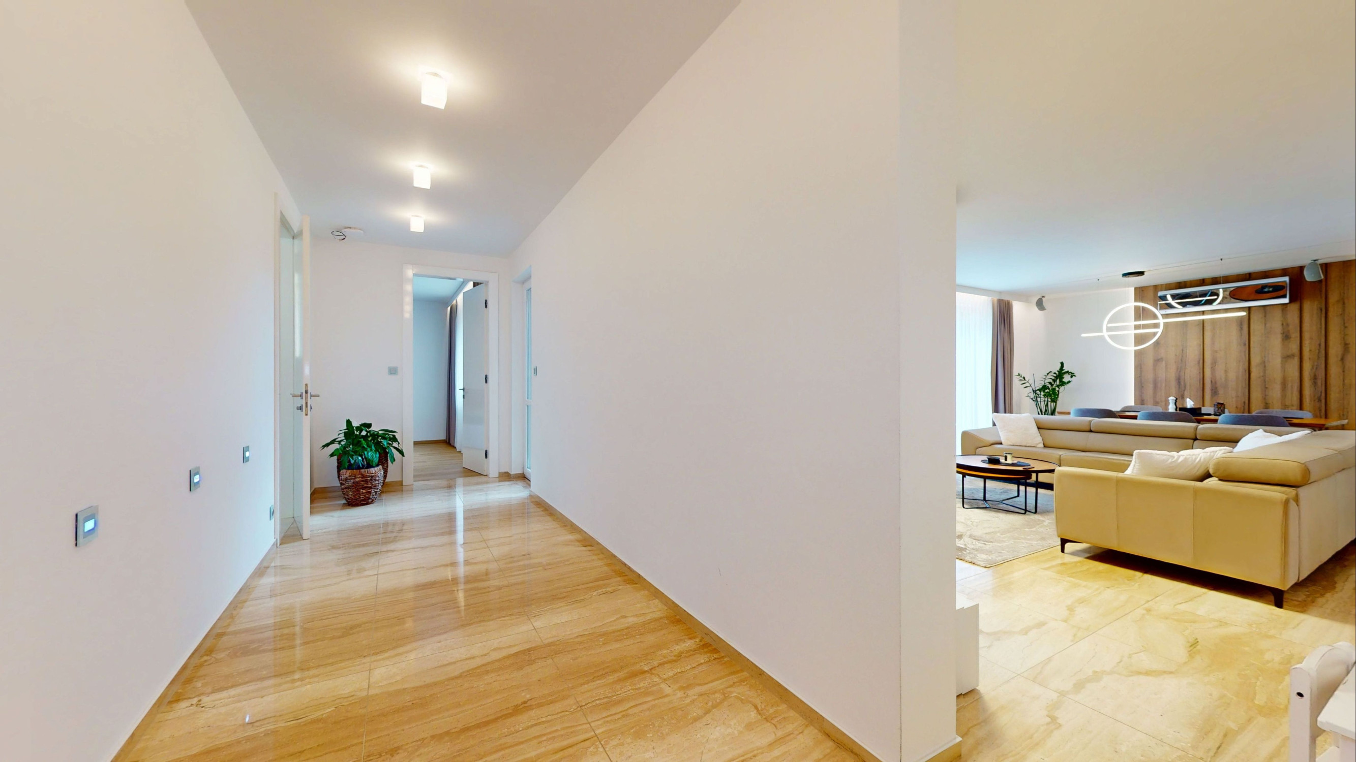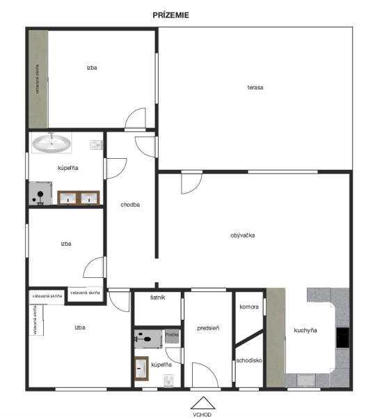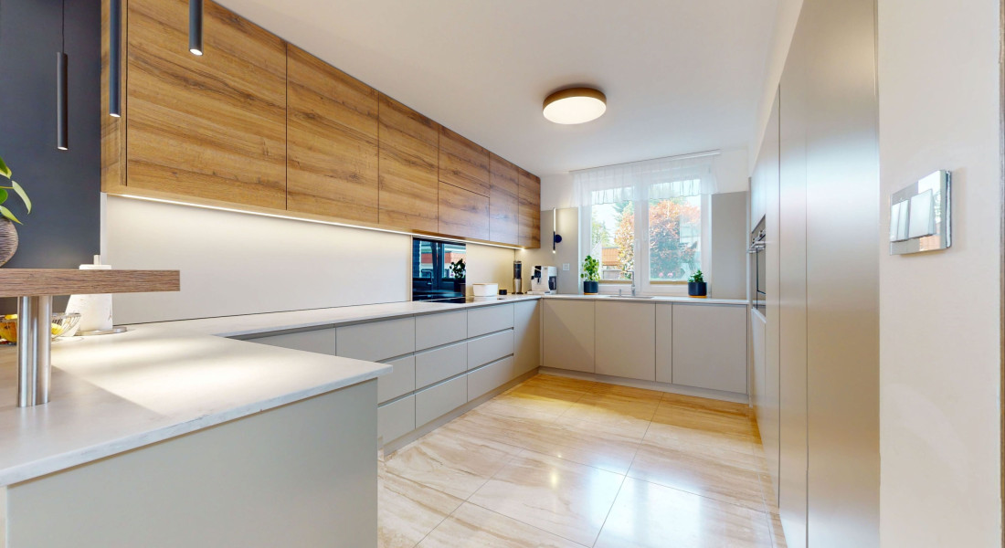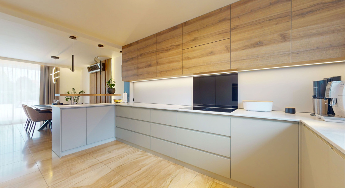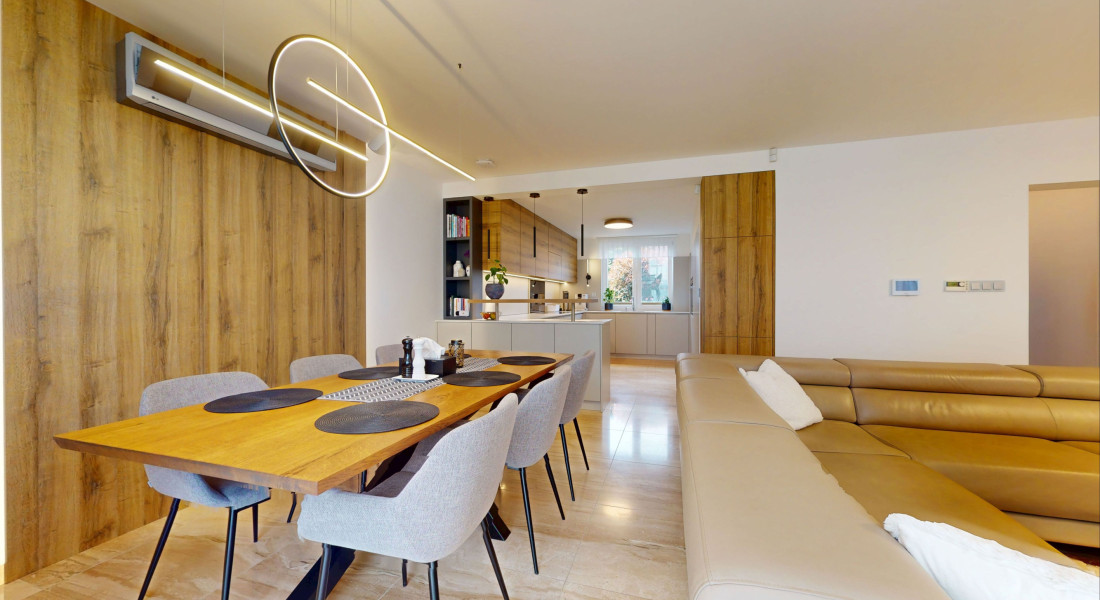 Prízemie — denná časť: priestranná obývačka prepojená s jedálňou a dizajnovou kuchyňou na mieru, samostatný šatník, hosťovská kúpeľňa, vstupná hala.