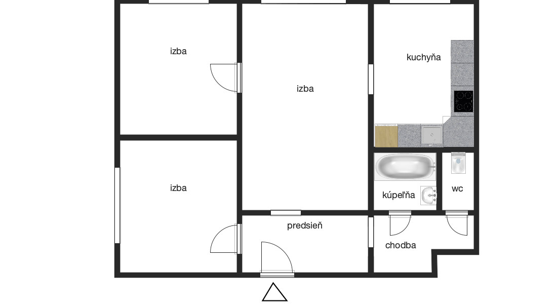 Pozostáva z 3 priestranných izieb, samostatnej kuchyne a samostatnej toalety a kúpeľne. Pred bytom na chodbe samostatný murovaný sklad ktorý patrí iba tomuto bytu. Na prízemí spoločná kočikáreň.