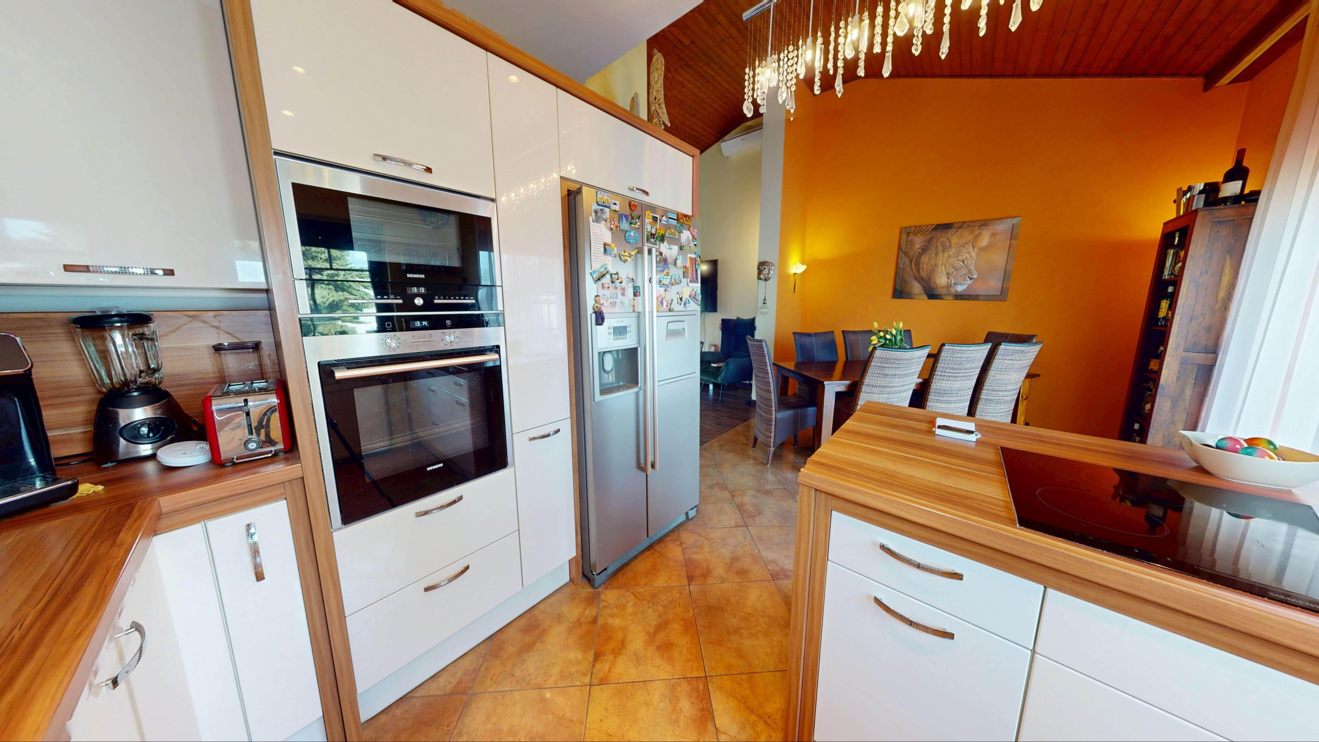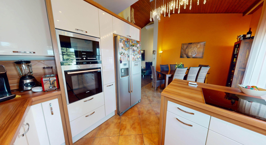 Moderná kuchyňa značky DAN je kompletne vybavená kvalitnými spotrebičmi Siemens. Odtiaľ je vstup na veľkú slnečnú terasu s nádherným výhľadom na Schlossberg.