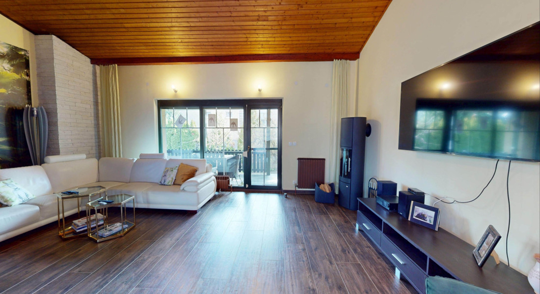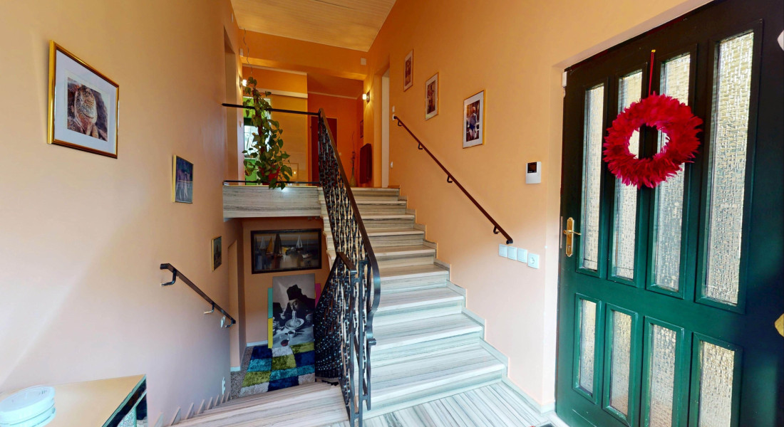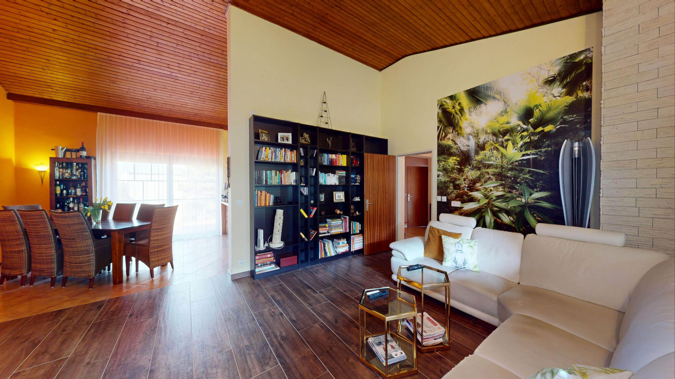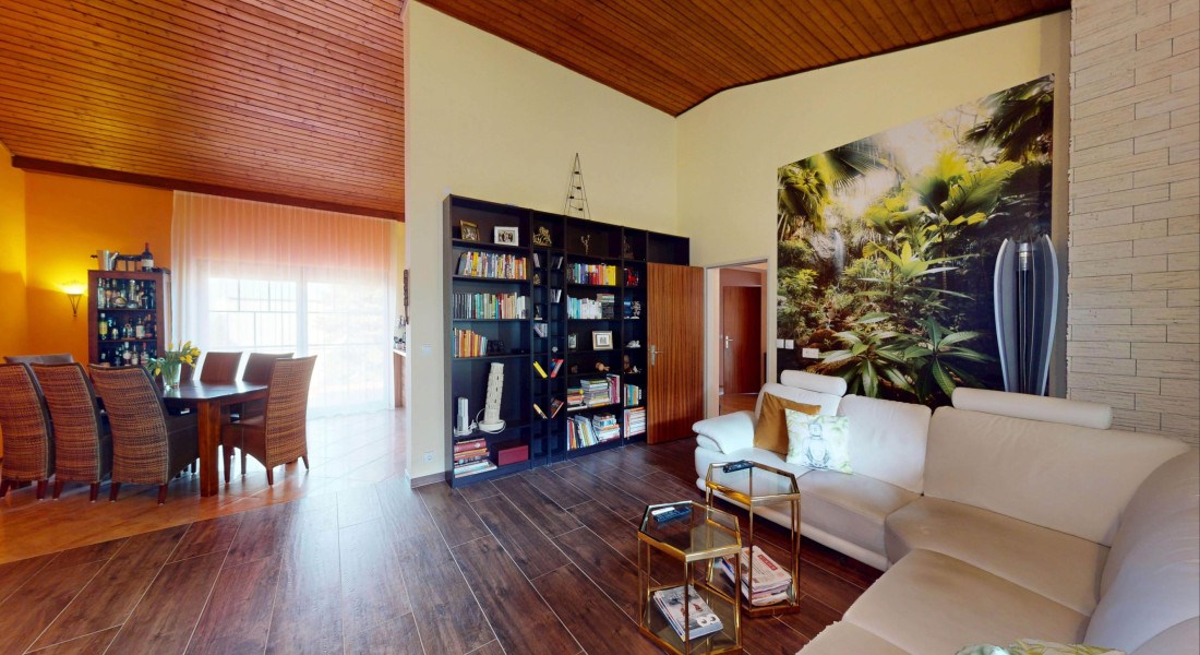Cez vstupnú halu sa dostanete do pôsobivej obývacej izby so stropmi vysokými viac ako 3 metre, ktoré vytvárajú vzdušný a otvorený priestor.